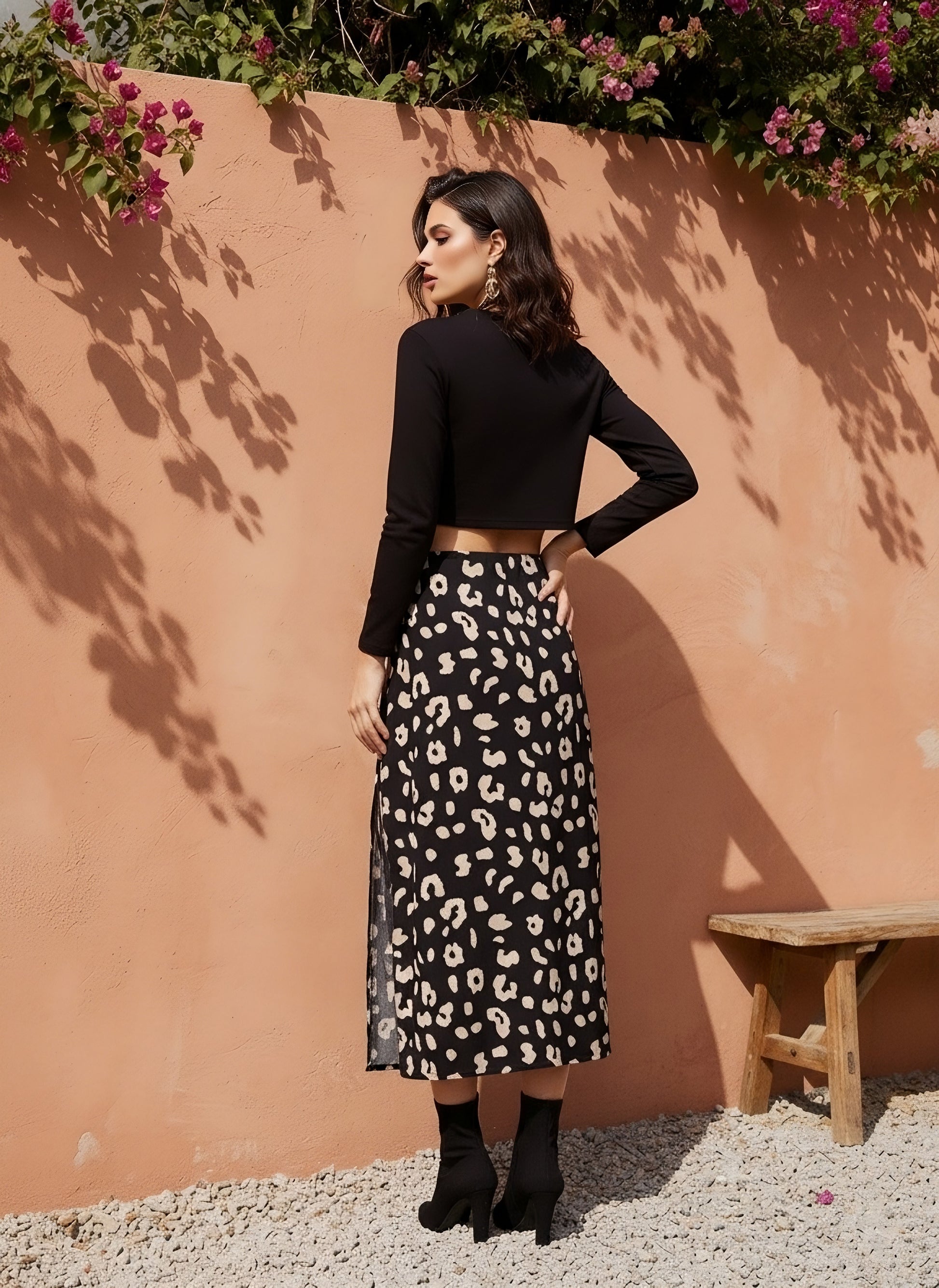 - The black and beige animal print on the skirt lends a bold print with the fierce vibe