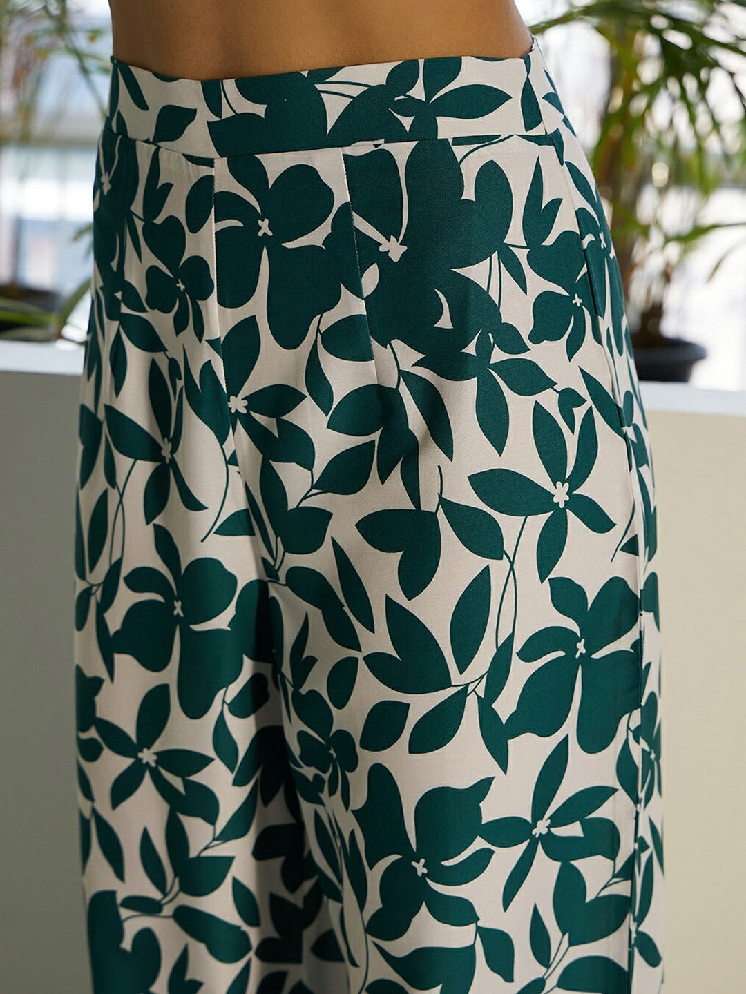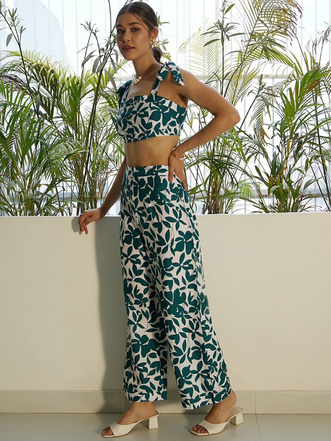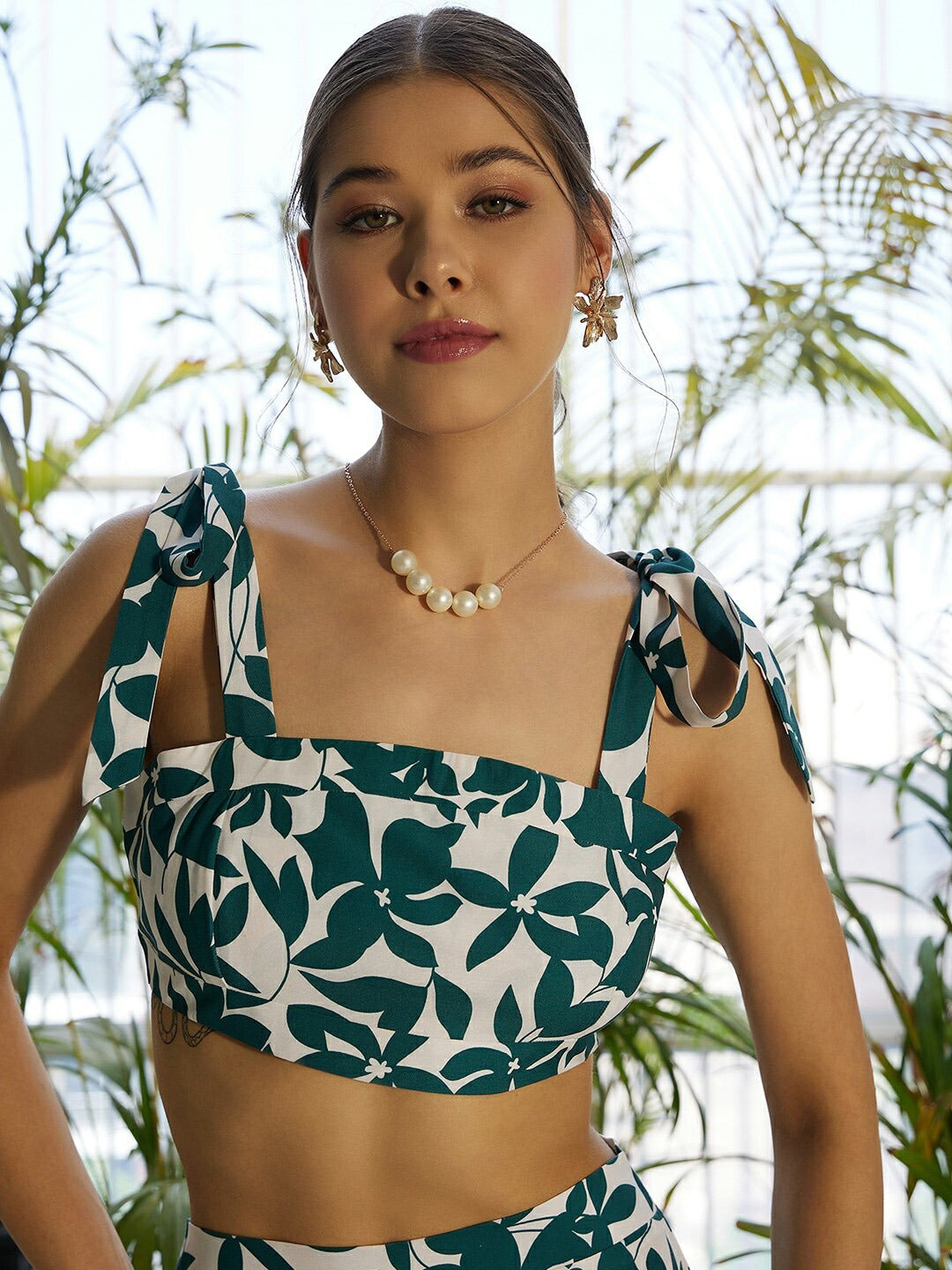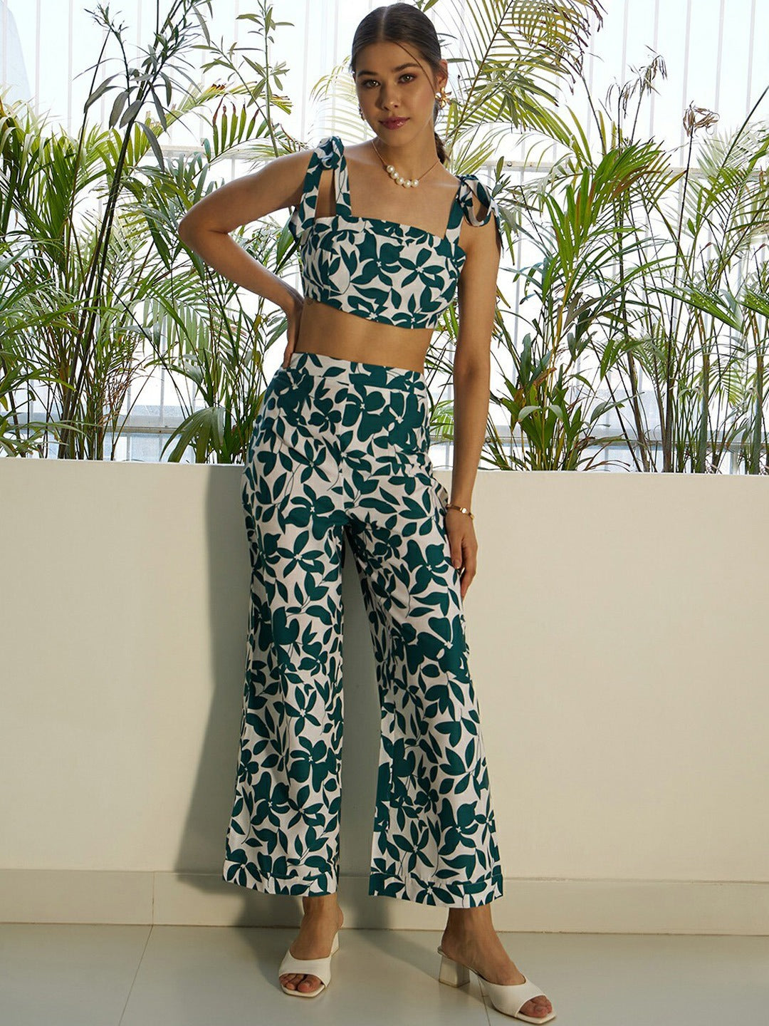 Berrylush Women White & Green Floral Printed Square Neck Tie-Up Straps Crop Top & Slip-On Trousers Co-Ordinate Set