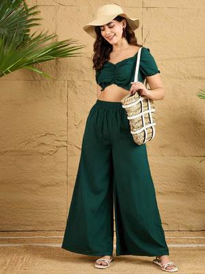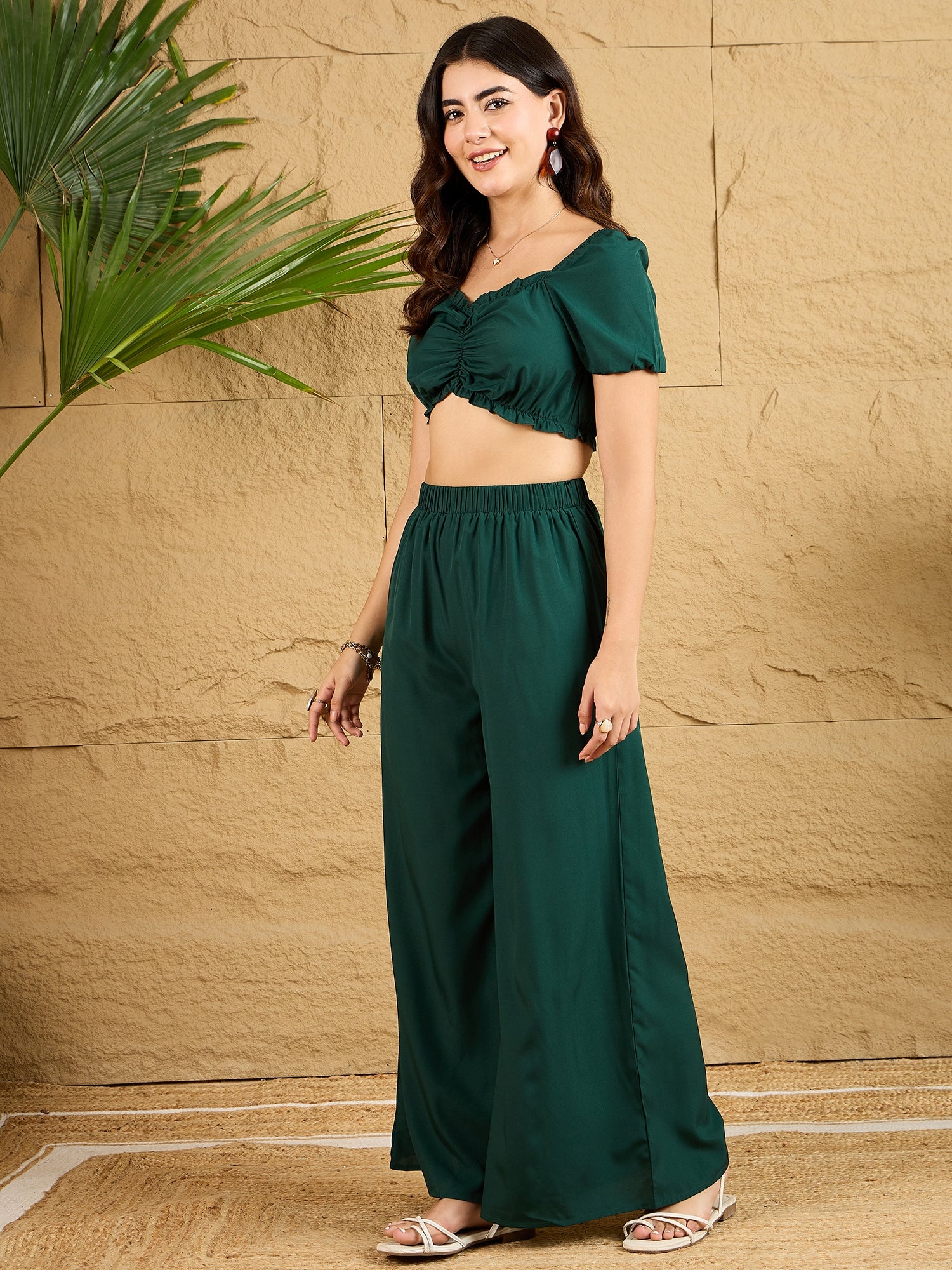 Berrylush Women Solid Green Sweetheart Neck Puff Sleeves Ruffled Crop Top & Elastic Waist Wide-Leg Maxi Trousers Co-Ord Set
