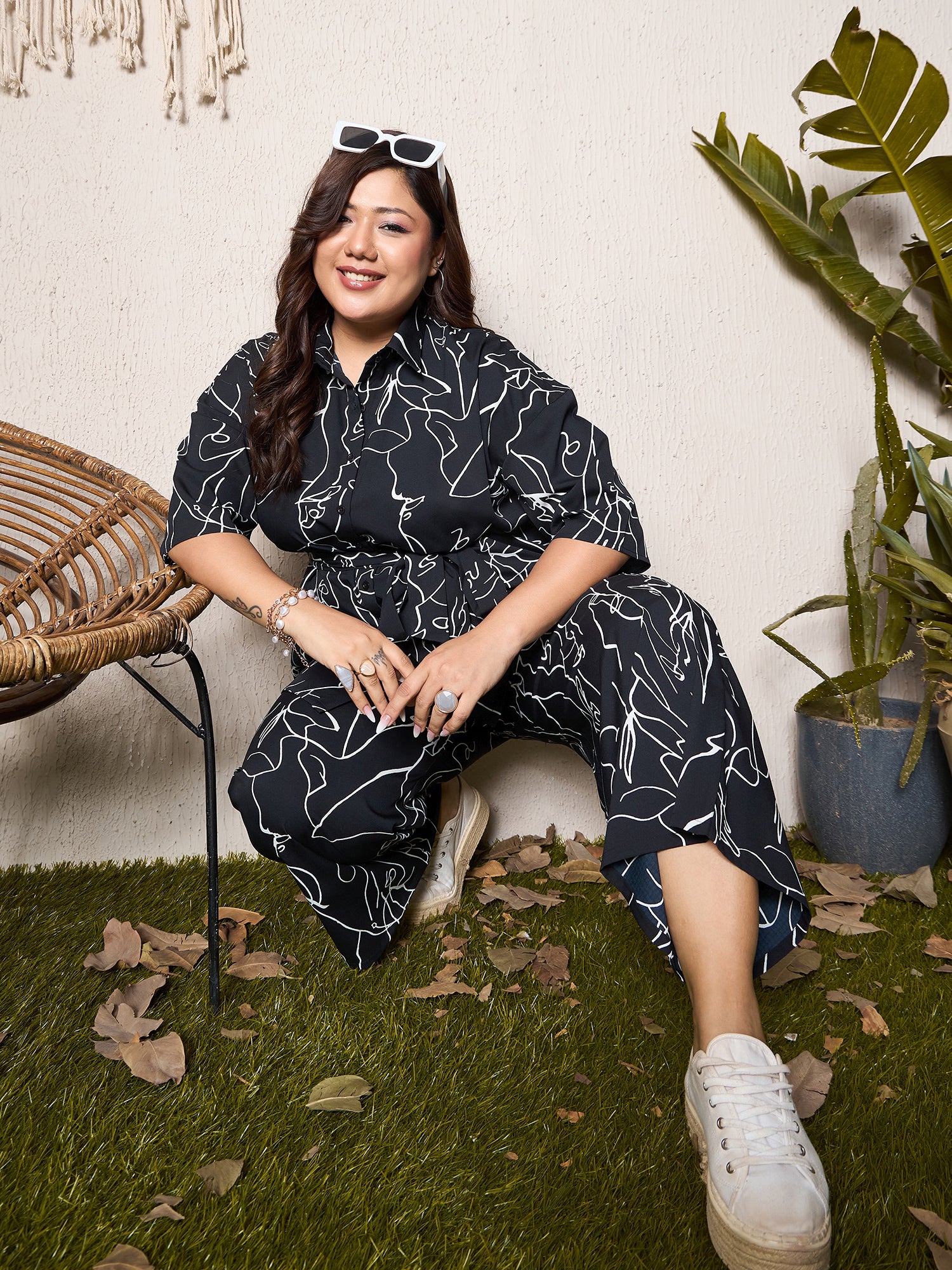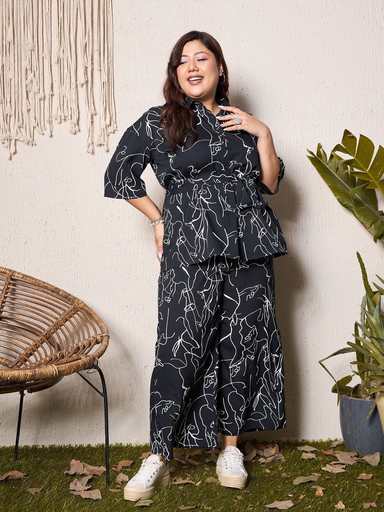 Berrylush Curve Women Black & White Abstract Printed Collar Neck Tie-Up Regular Shirt & High-Rise Elastic Wide-Leg Maxi Trousers Co-Ord Set