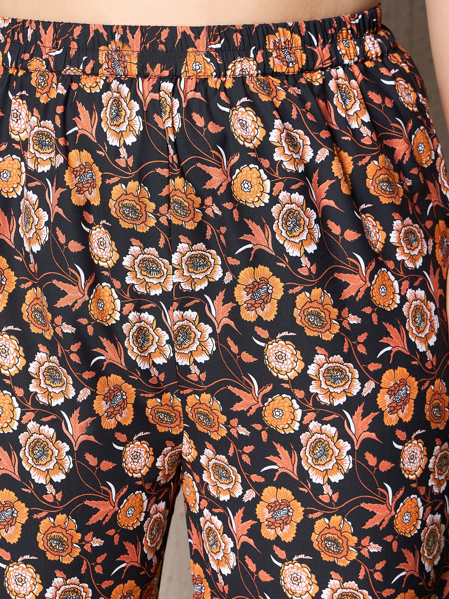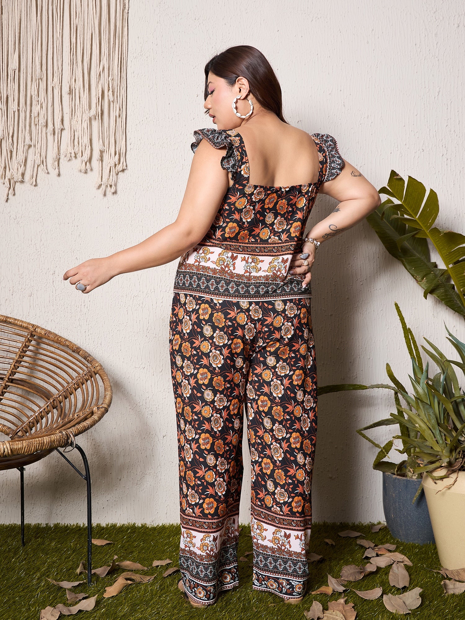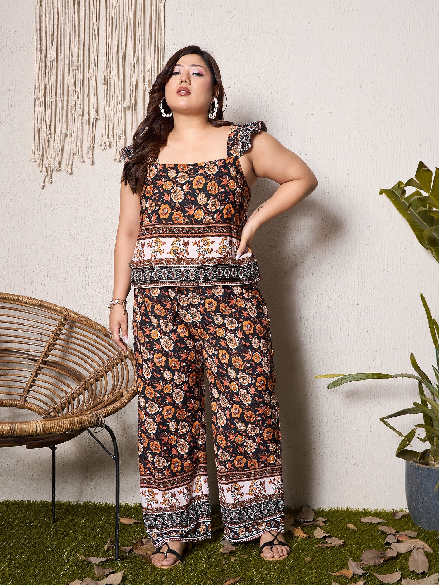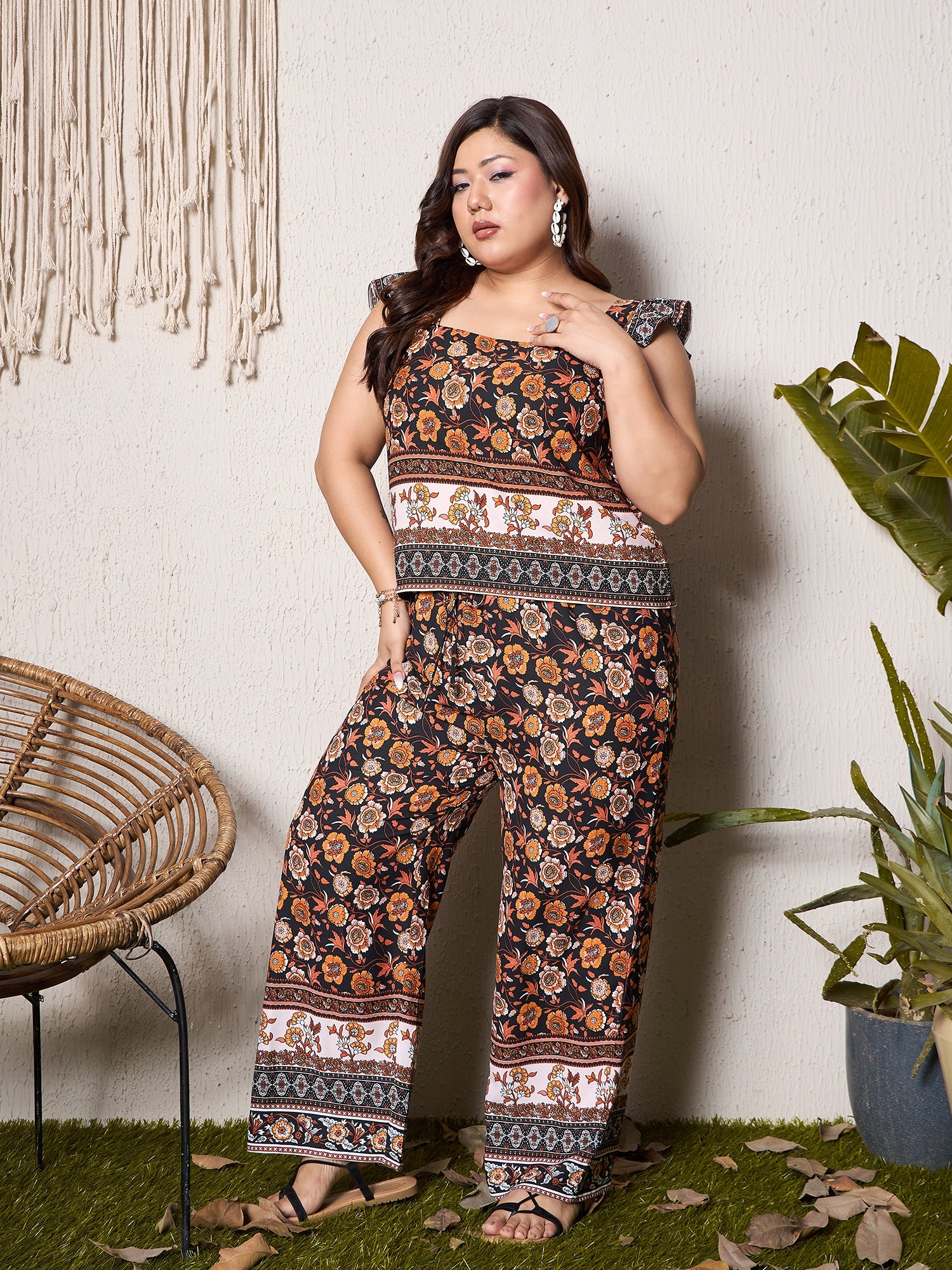 Berrylush Curve Women Black & Orange Floral Printed Square Neck Ruffled Regular Top & Elastic Waist Maxi Trousers Co-Ord Set