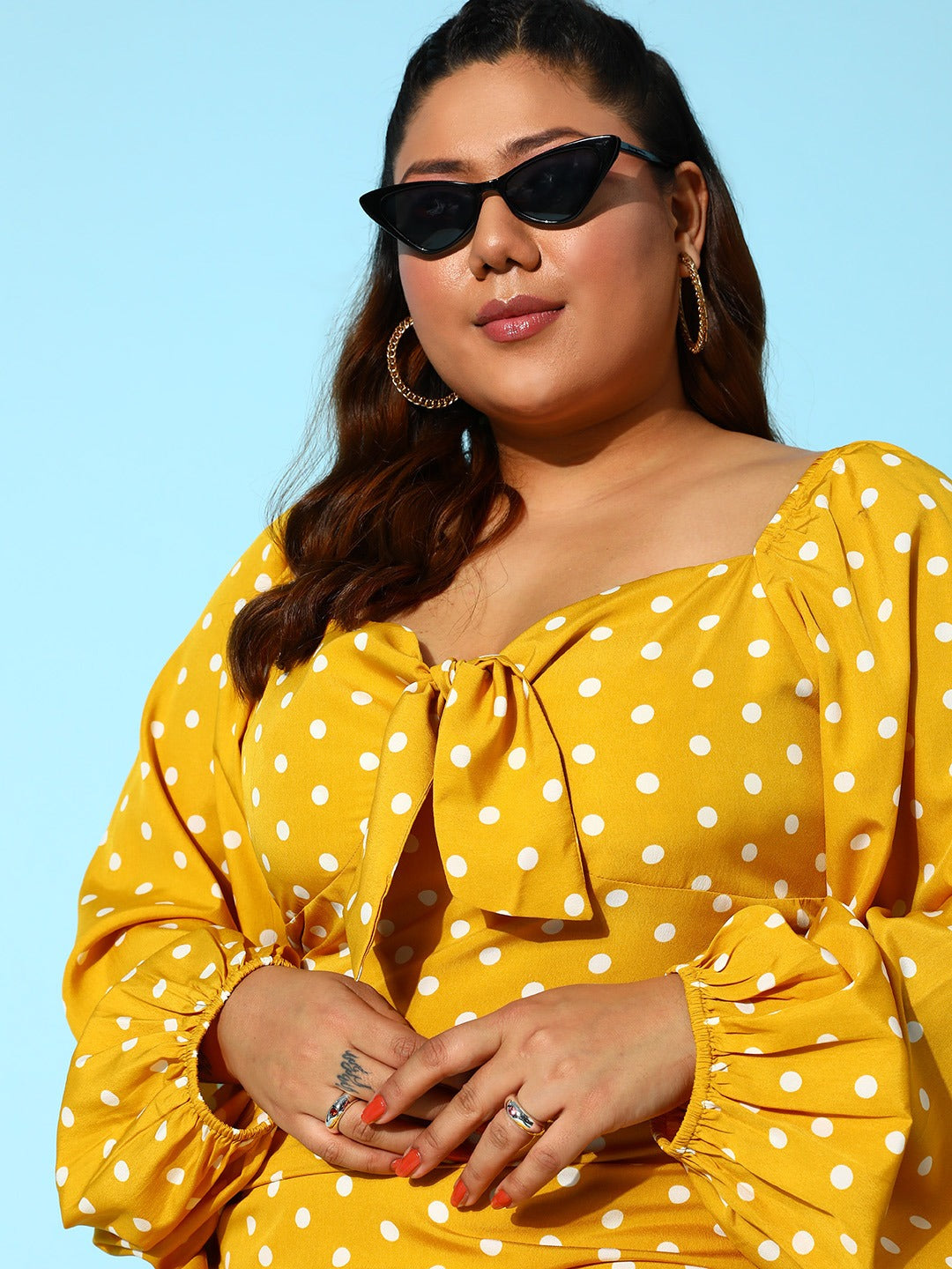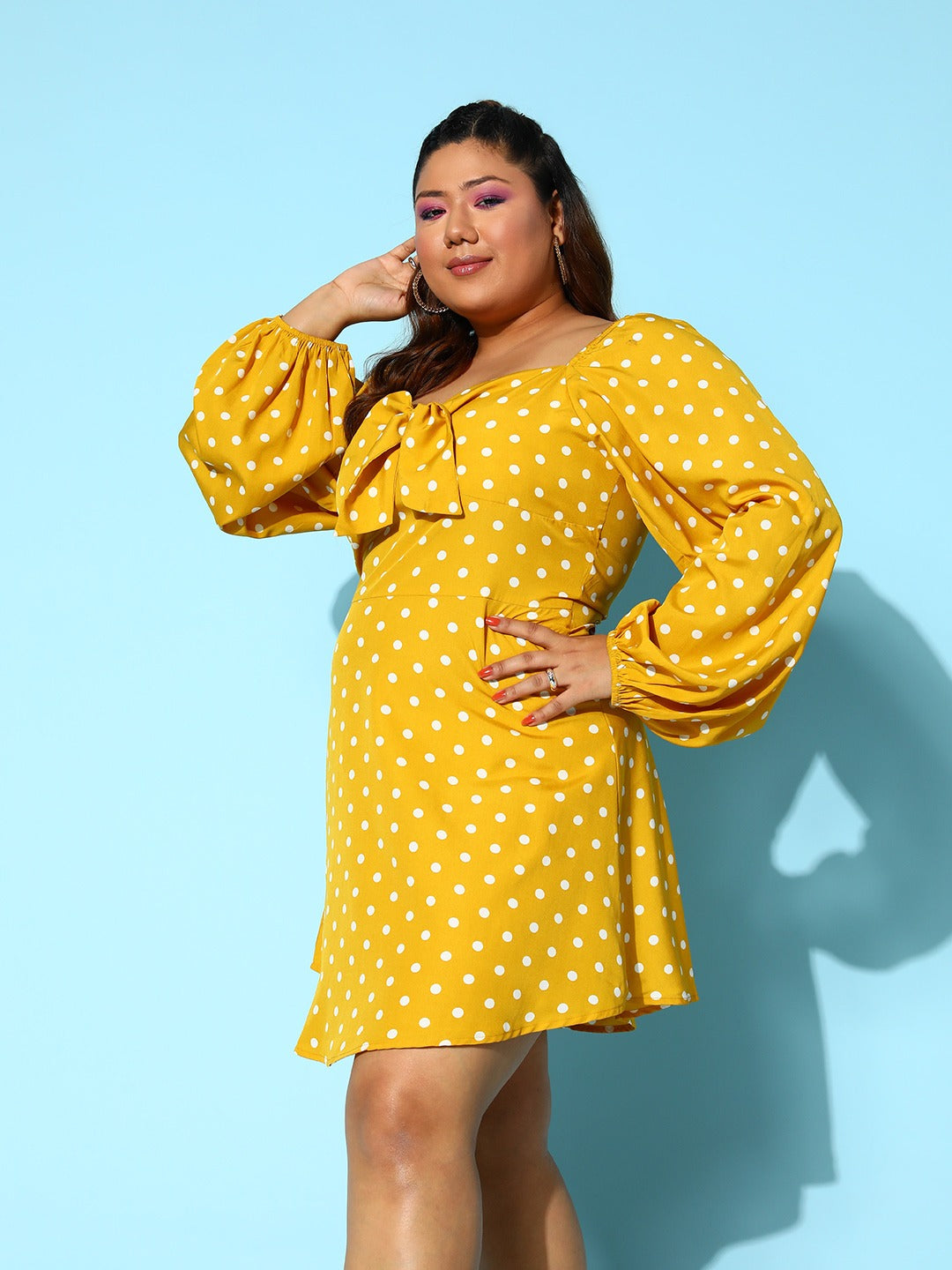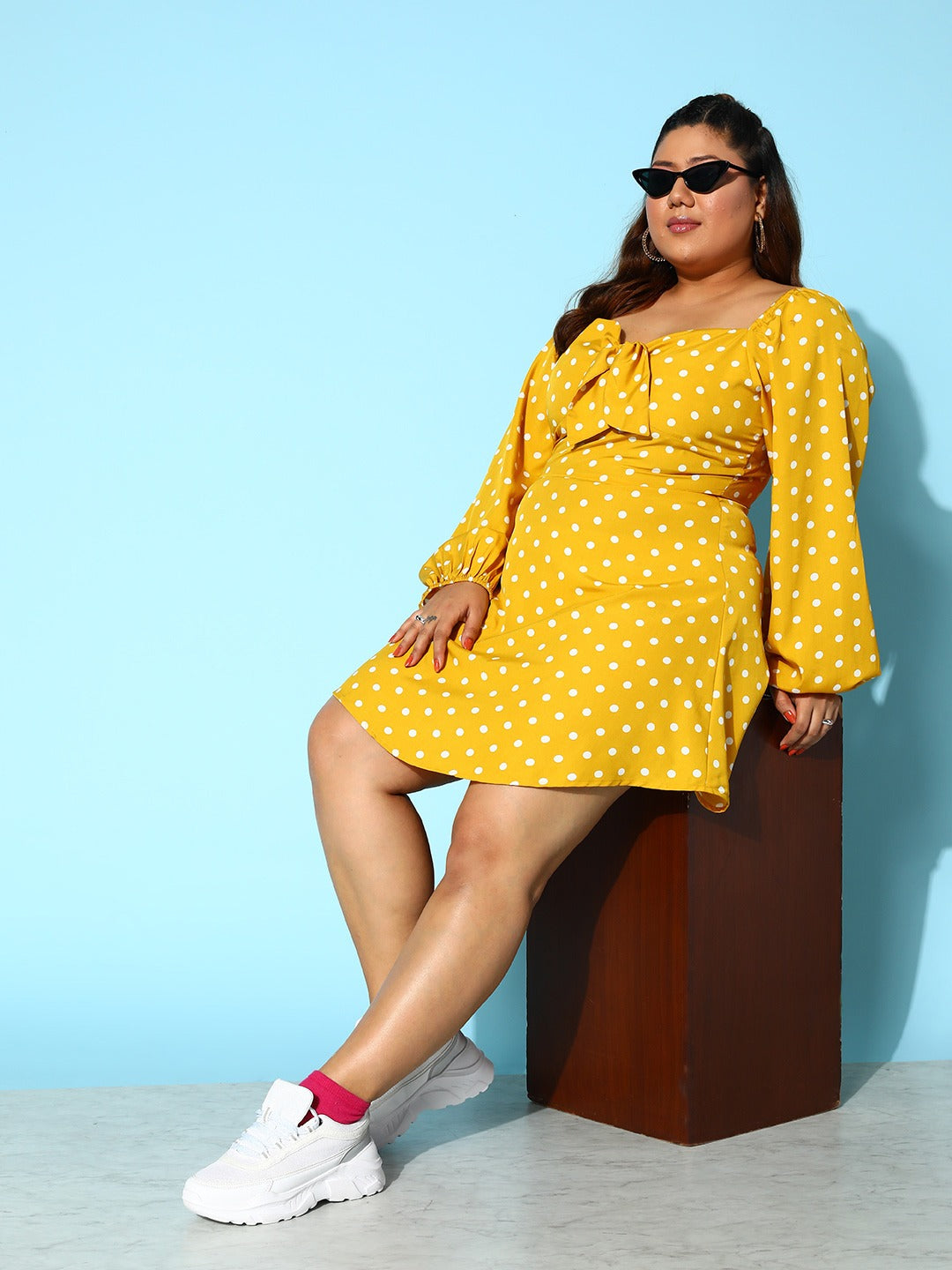 Berrylush Women Plus Size Yellow & White Polka Dot Printed Sweetheart Neck Front Tie-Up Crepe Flared A-Line Mini Dress