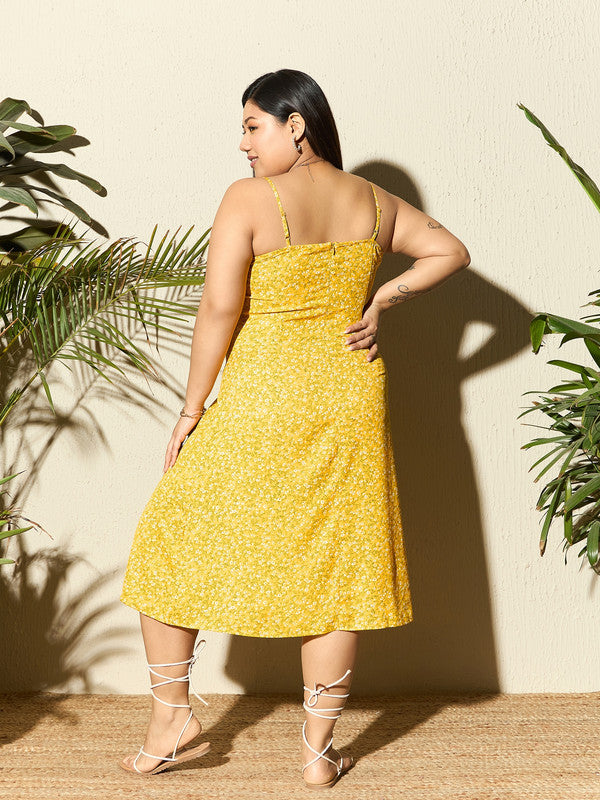 Introducing the Berrylush Curve Yellow Floral Printed Midi Dress, a charming addition to your casual wear. This sleeveless dress features a captivating sweetheart neckline and an A-line silhouette that flatters every curve. Crafted from premium woven polyester for lasting comfort, it boasts a vivid yellow backdrop with enchanting floral prints. The thigh-high slit adds a touch of allure while ensuring freedom of movement, and the straight hem brings sleek simplicity to its design. Complete with an easy zipper closure and offering full coverage with its opaque fabric, this dress will surely be your next favourite go-to outfit for sunny days!