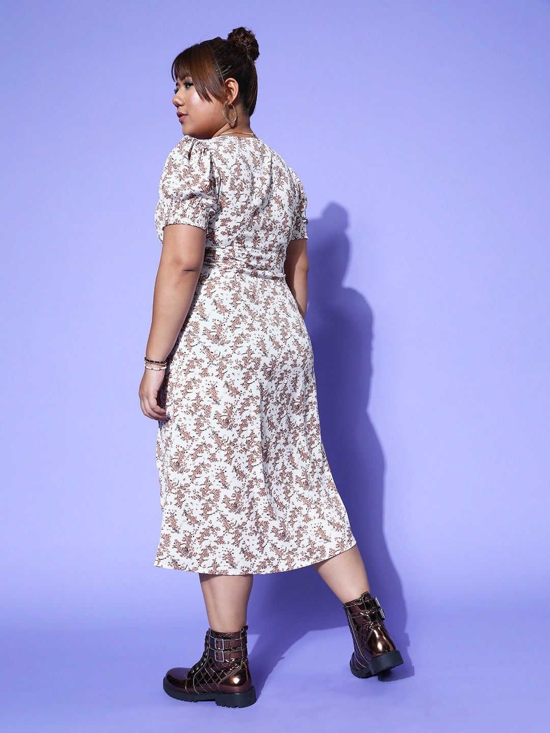 Berrylush Women Plus Size White & Brown Floral Printed Sweetheart Neck Slit A-Line Midi Dress