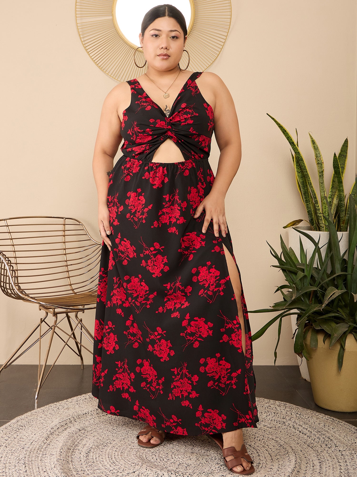 Berrylush Curve Women Black & Red Floral Printed V-Neck Cutout Back Tie-Up Thigh-High Slit Flared A-Line Maxi Dress
