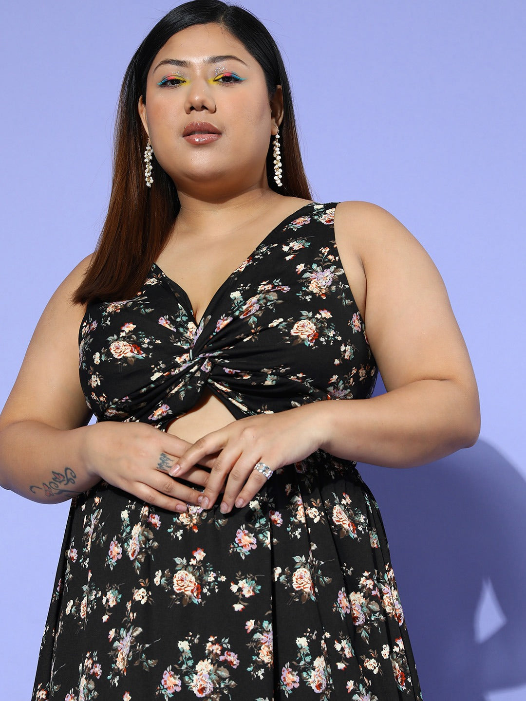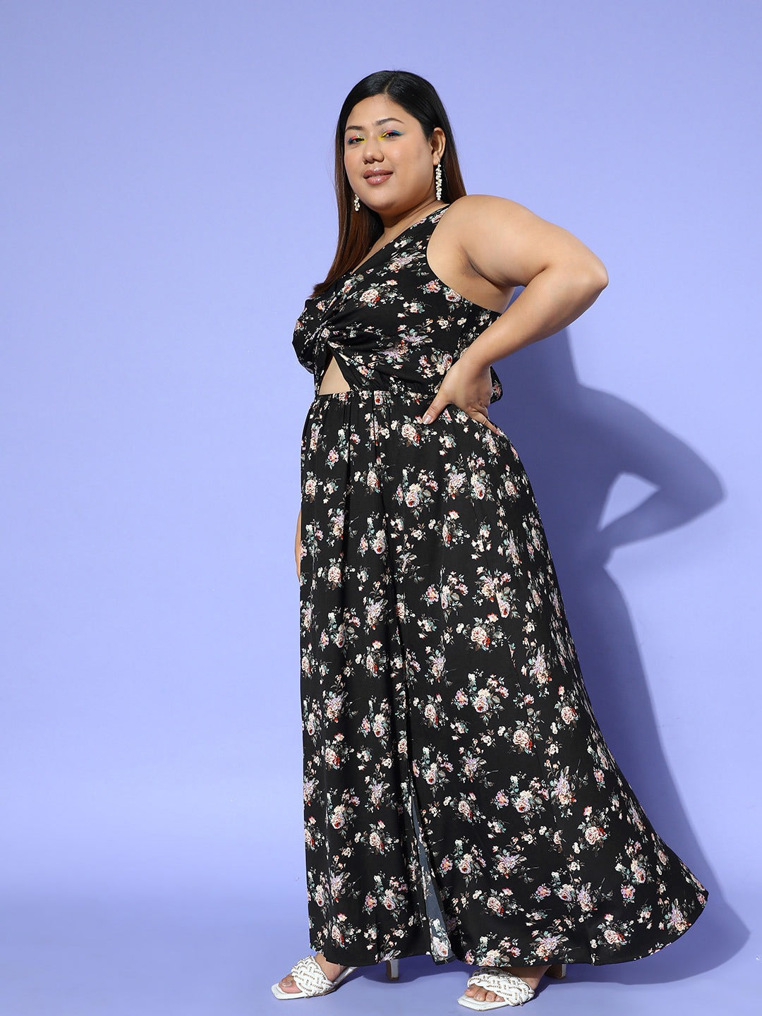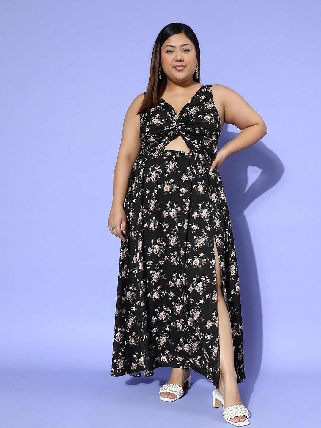 Berrylush Women Plus Size Black & Pink Floral Printed V-Neck Backless Thigh-High Slit Flared A-Line Maxi Dress