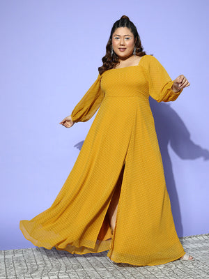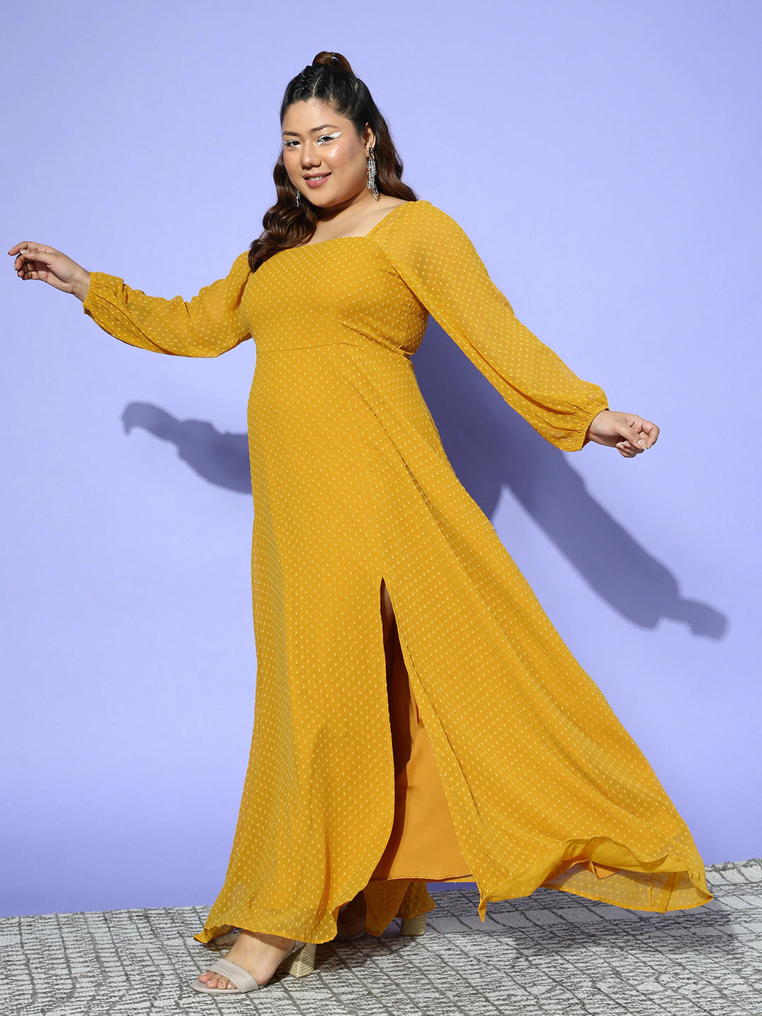 Berrylush Women Plus Size Solid Mustard Yellow Dobby Weave Square Neck Thigh-High Slit Fit & Flare Maxi Dress