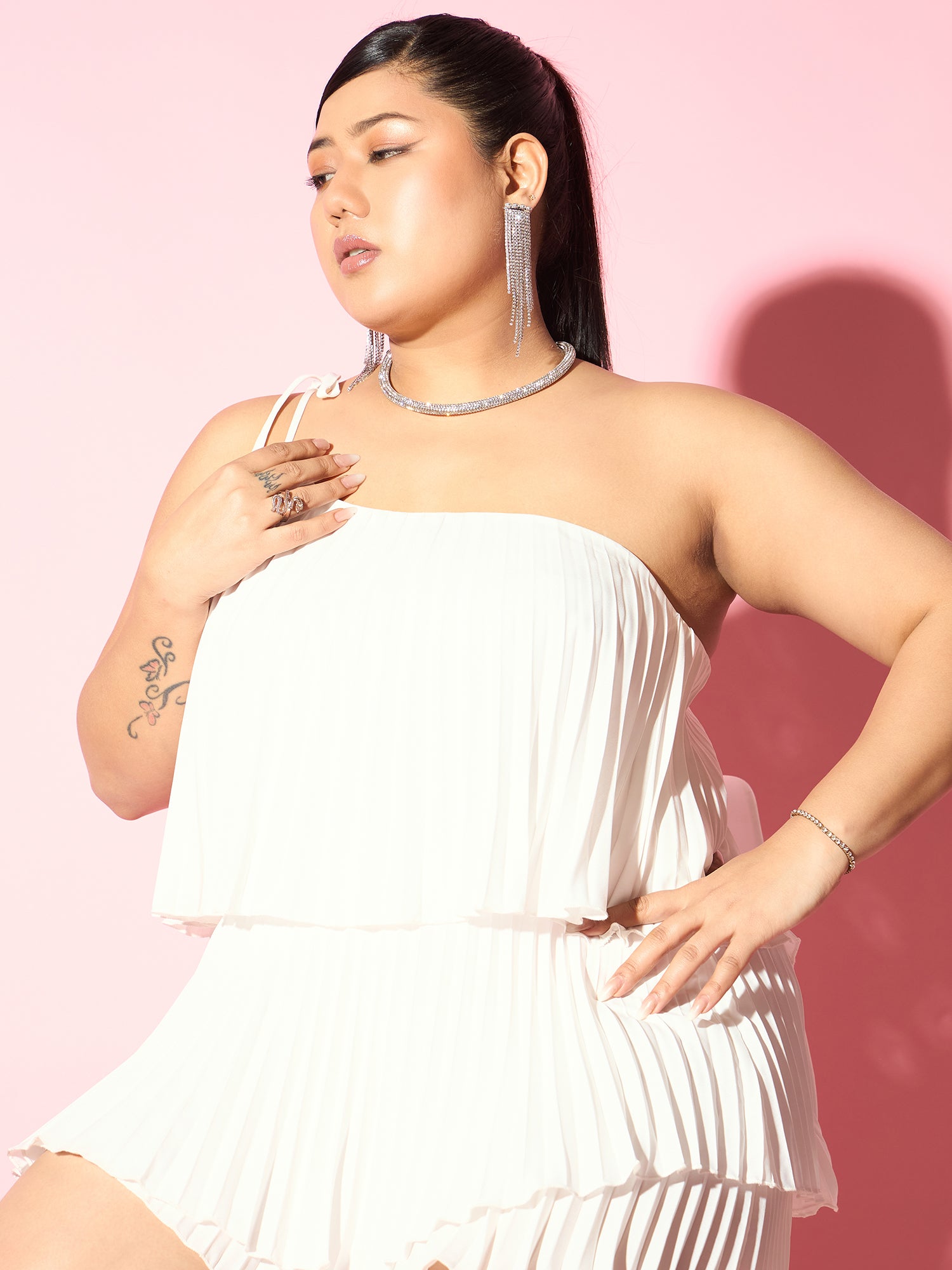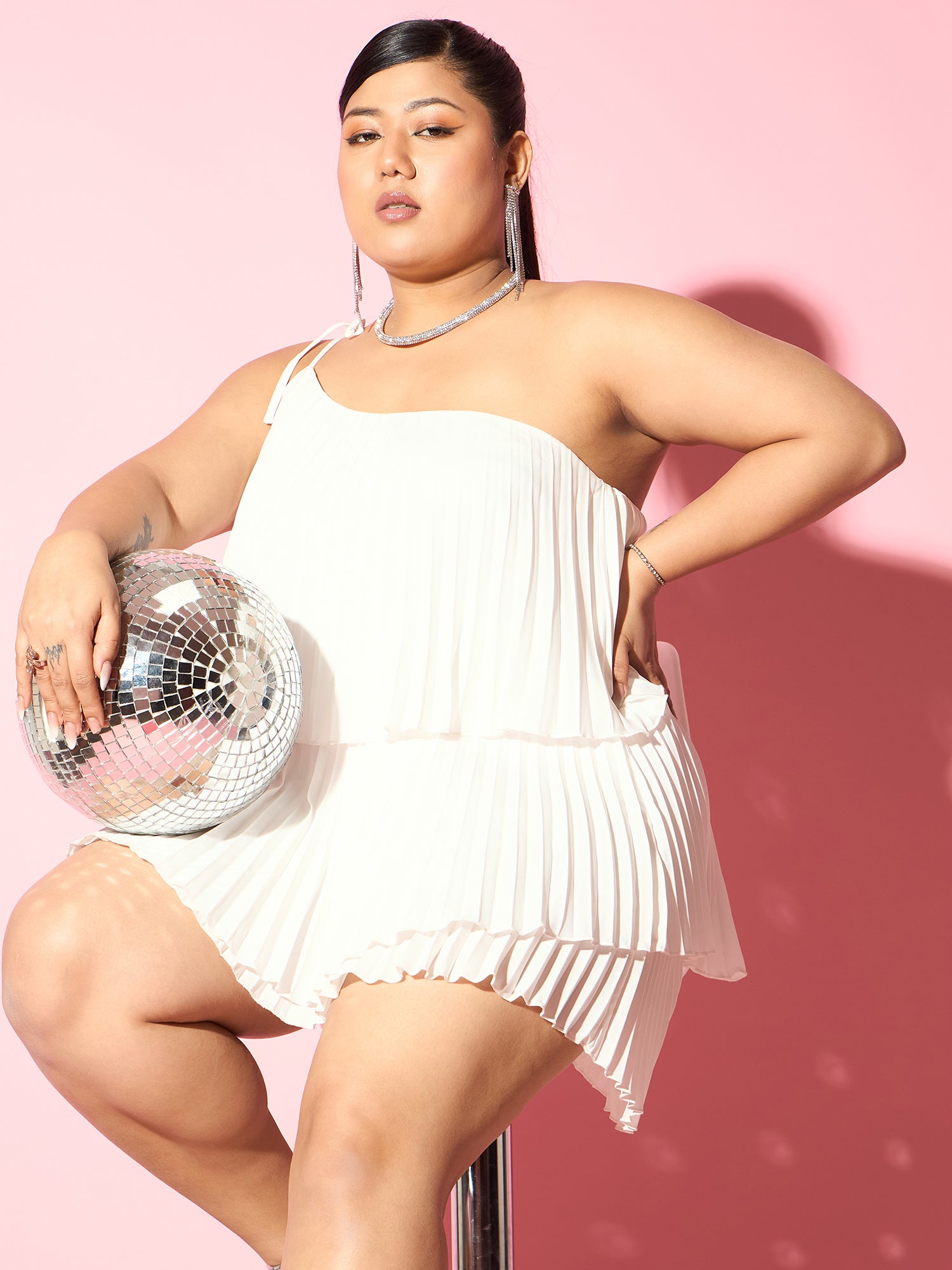 Berrylush Curve Women Solid White One-Shoulder Neck Sleeveless Tie-Up Strap Flounce Hem Pleated & Layered A-Line Mini Dress