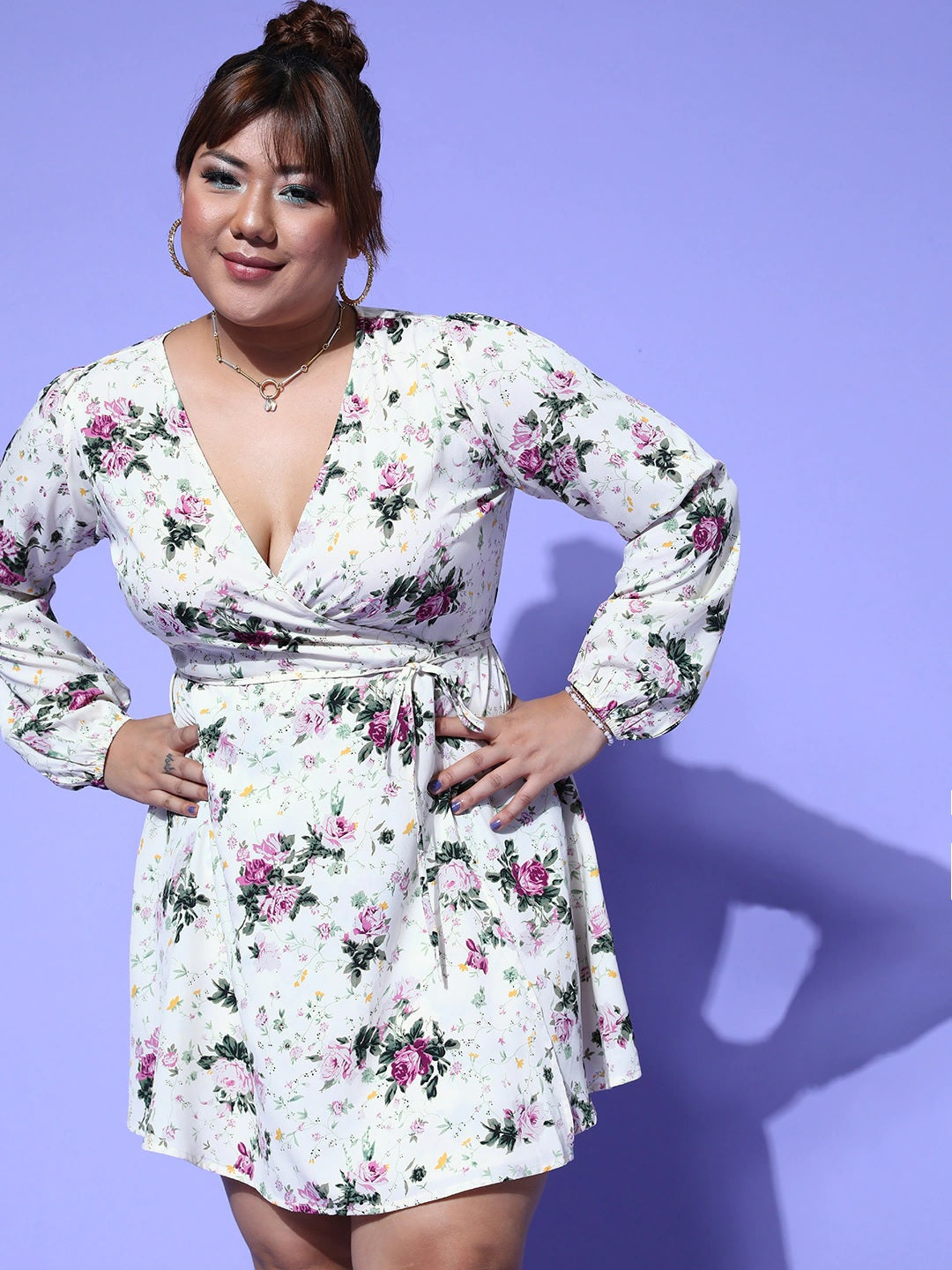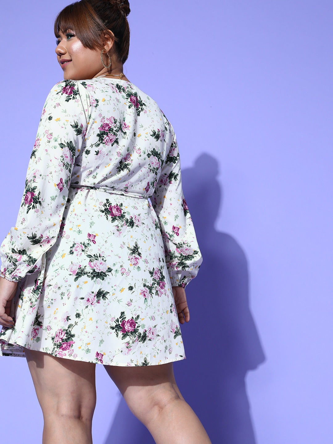 Berrylush Women Plus Size White & Lavender Floral Printed V-Neck Waist Tie-Up Flared Wrap Mini Dress