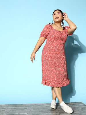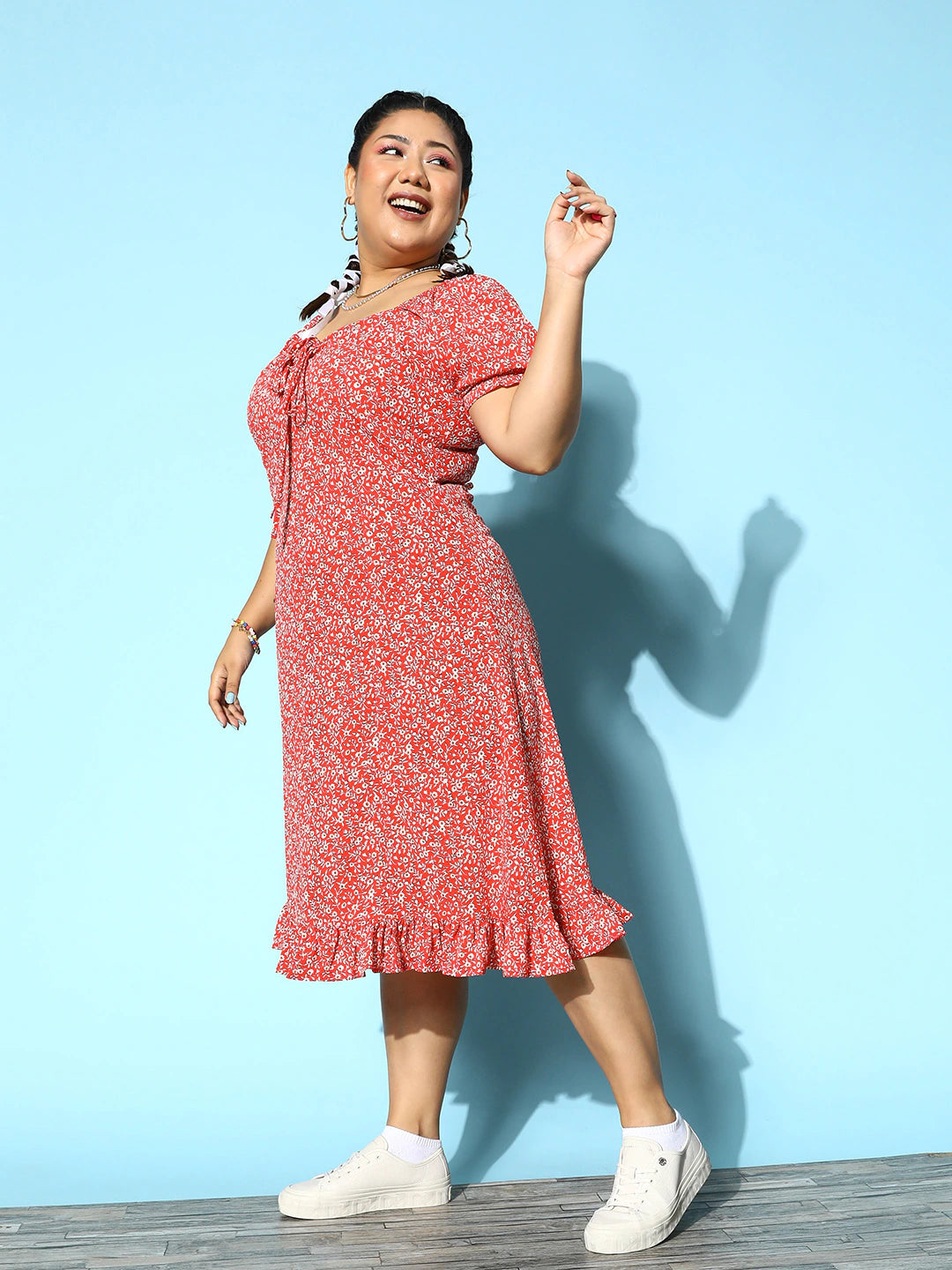 Berrylush Women Plus Size Red & White Floral Printed Sweetheart Neck Front Tie-Up Flounce Hem A-Line Midi Dress
