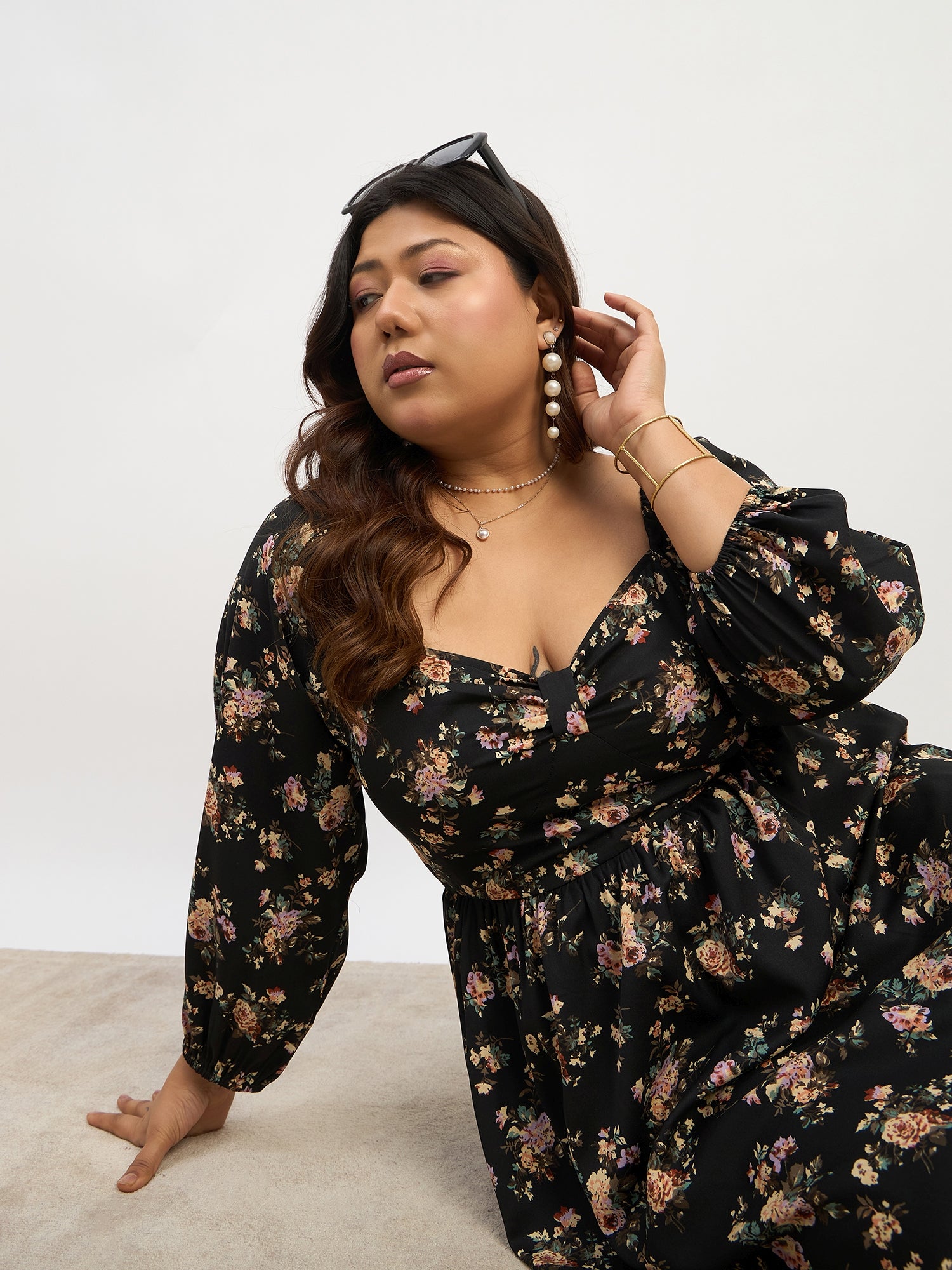 Berrylush Curve Women Black & Pink Floral Printed Sweetheart Neck Puff Sleeves Concealed Zipper-Up Pleated Maxi Dress