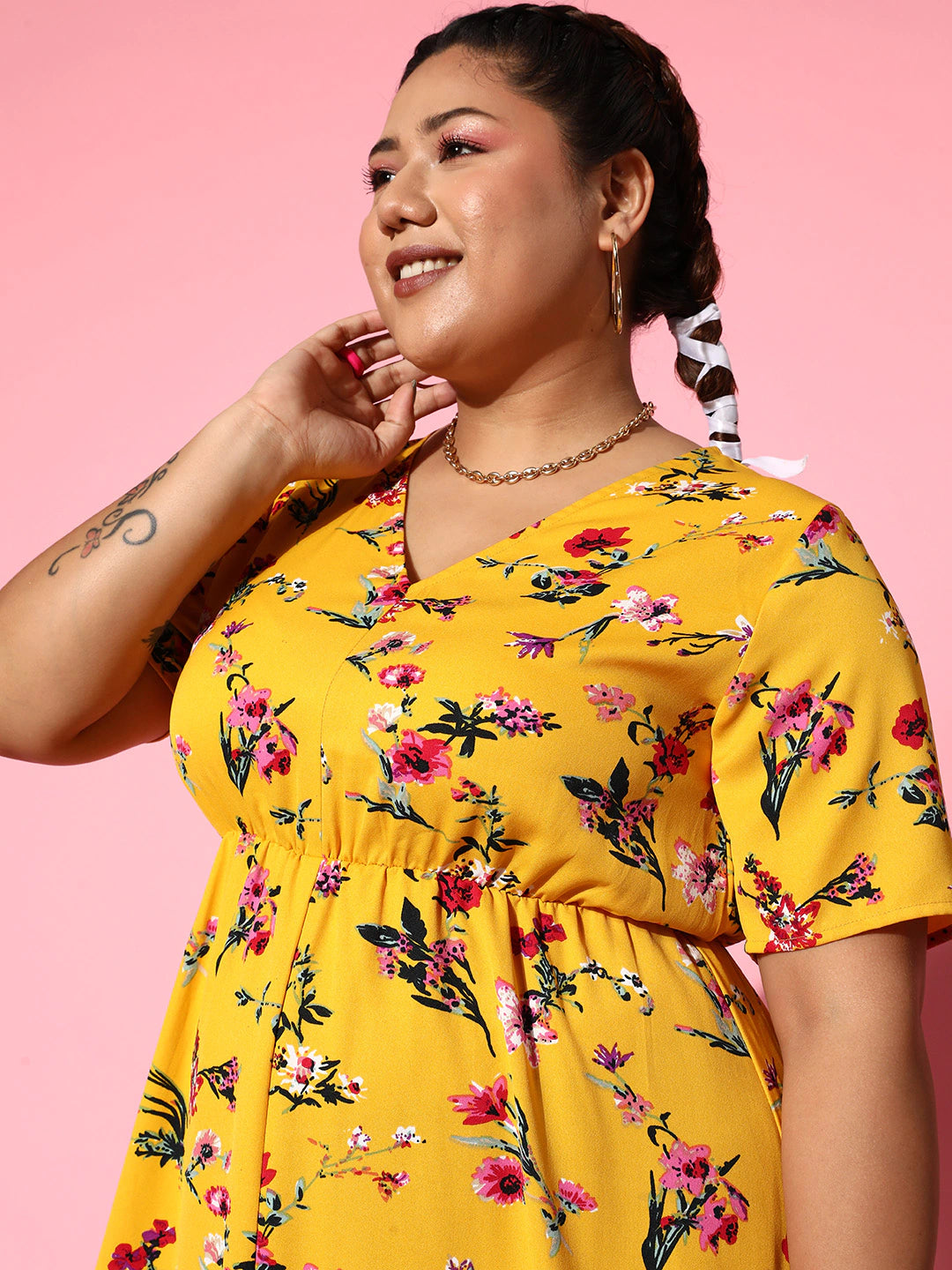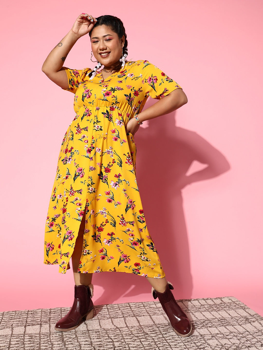 Berrylush Women Plus Size Yellow & Pink Floral Printed V-Neck Crepe Front-Slit Flared A-Line Maxi Dress
