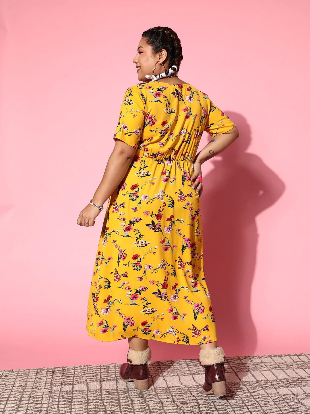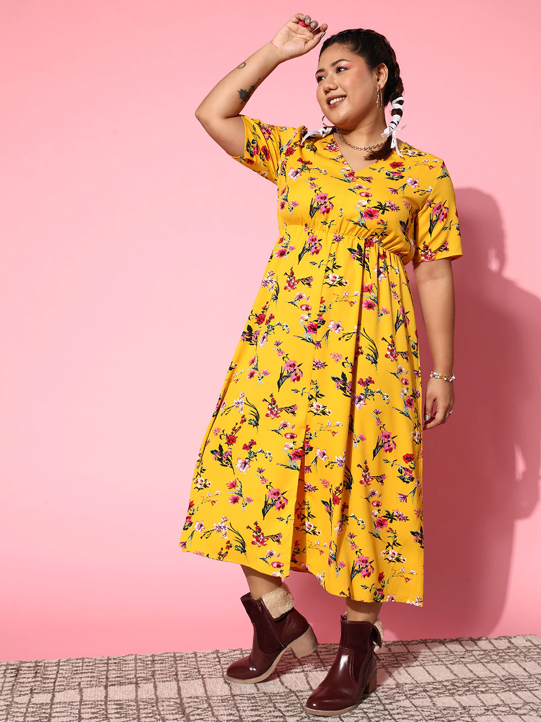 Infuse a generous dose of elegance and femininity into your summer wear collection with this enchanting Yellow and Pink Floral Printed Flared A-Line Maxi Dress from Berrylush. Adorned with a V-neck design that elongates your neckline with a breathable outline and edgy appeal. Designed with pleated surface styling that enhances the volume of this dress with ruched detail and elastic nature. Comes with woven detailing to offer the utmost comfort with soft touch and texture. Walk out looking charming by wearing this maxi dress with a pair of pretty yellow wedges, butterfly earrings, a straw hat, matching sunglasses, and a cute side bag.