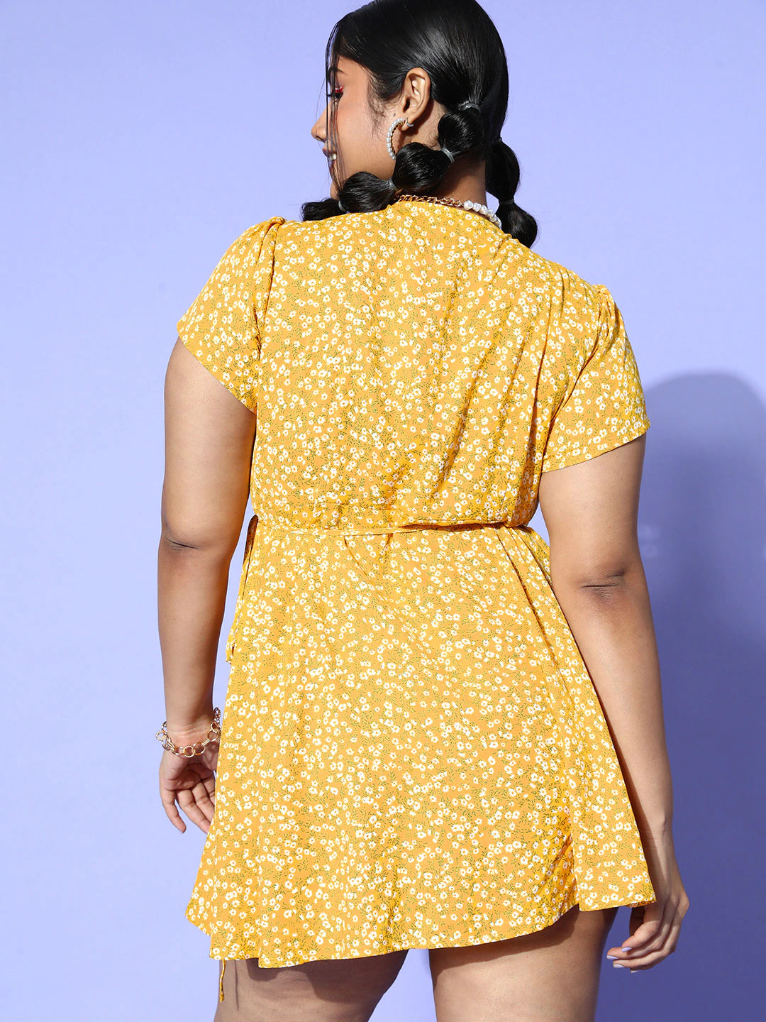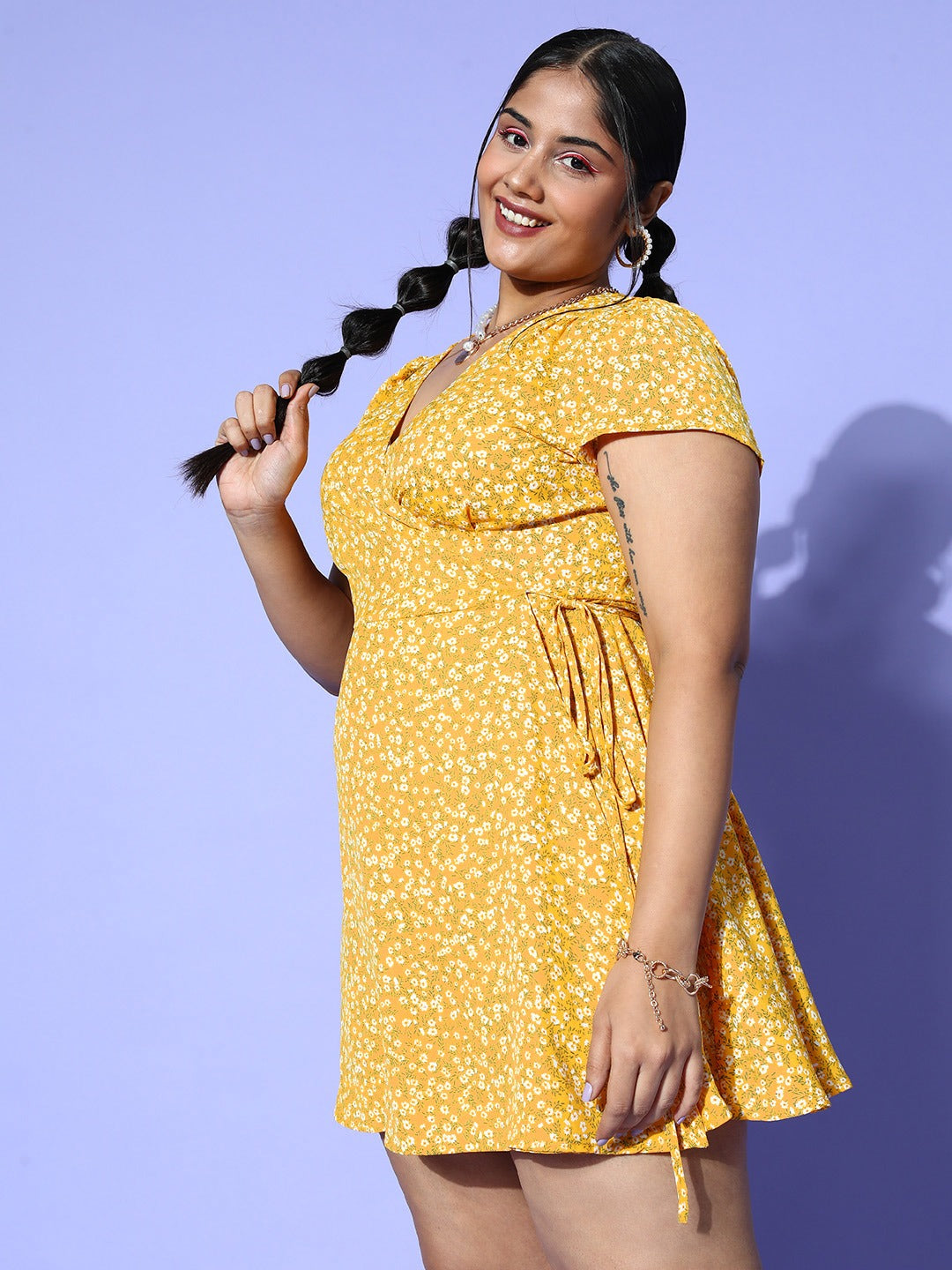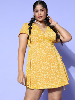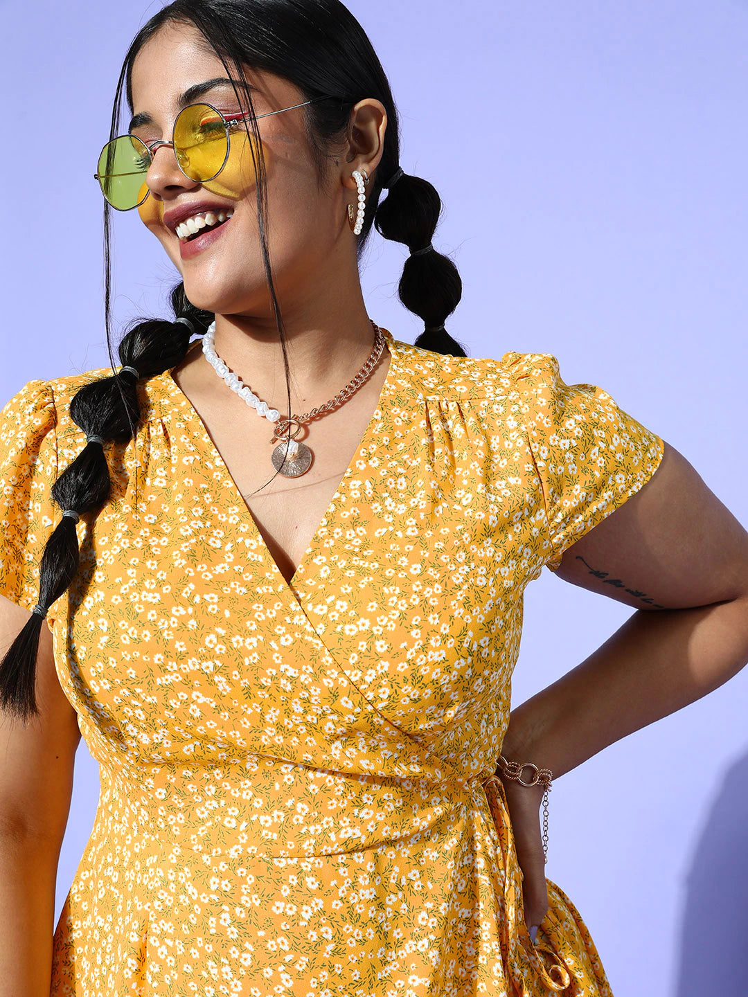 Berrylush Women Plus Size Yellow & White Floral Printed V-Neck Tie-Up Waist Crepe Flared Wrap Mini Dress