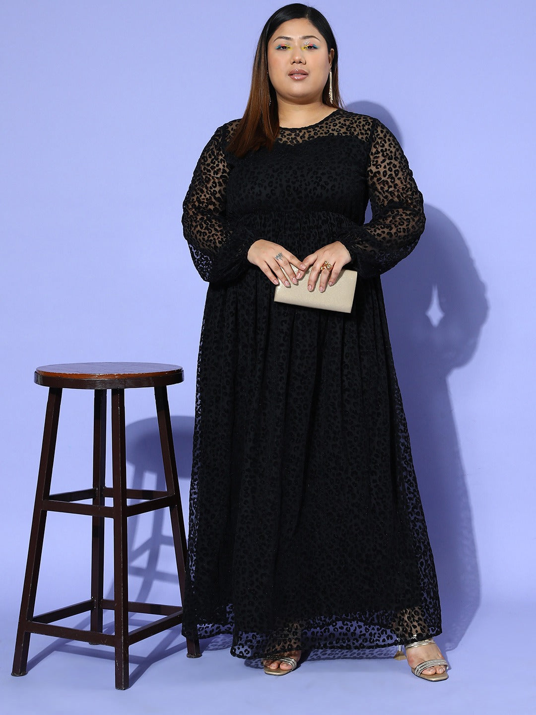 Berrylush Women Plus Size Black Animal Printed Round Neck Semi-Sheer Velvet Flared A-Line Maxi Dress