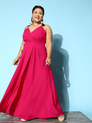 Berrylush Women Plus Size Solid Pink V-Neck Sleeveless Crepe Thigh-High Slit Fit & Flare Wrap Maxi Dress