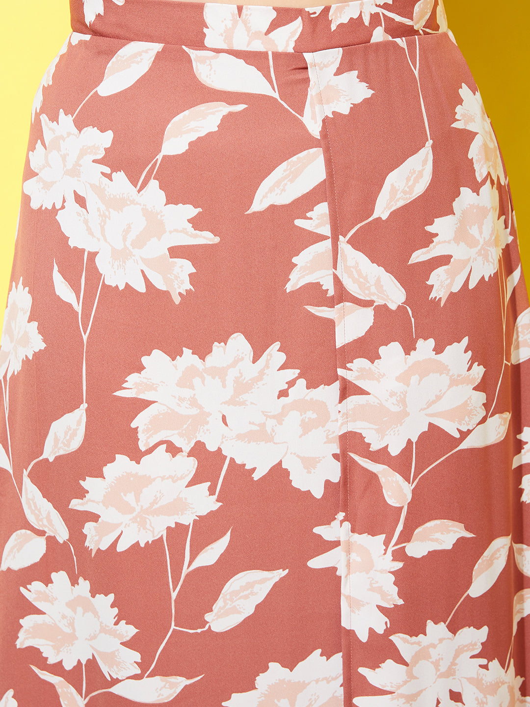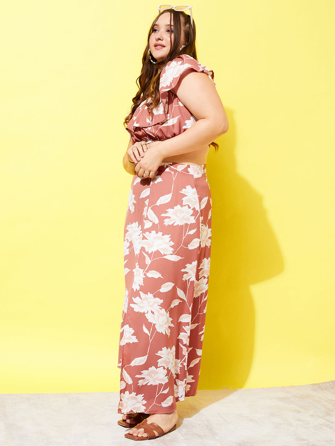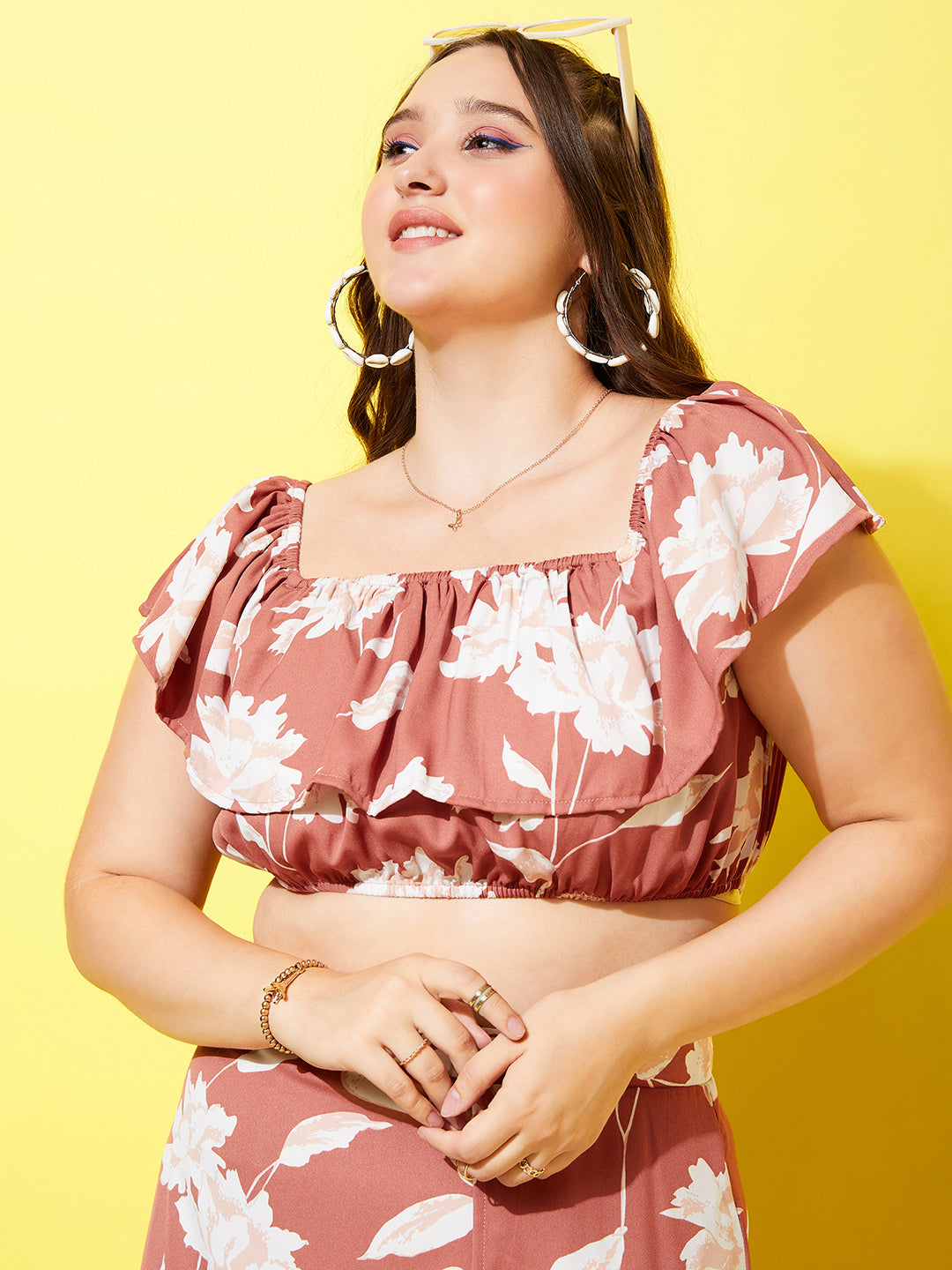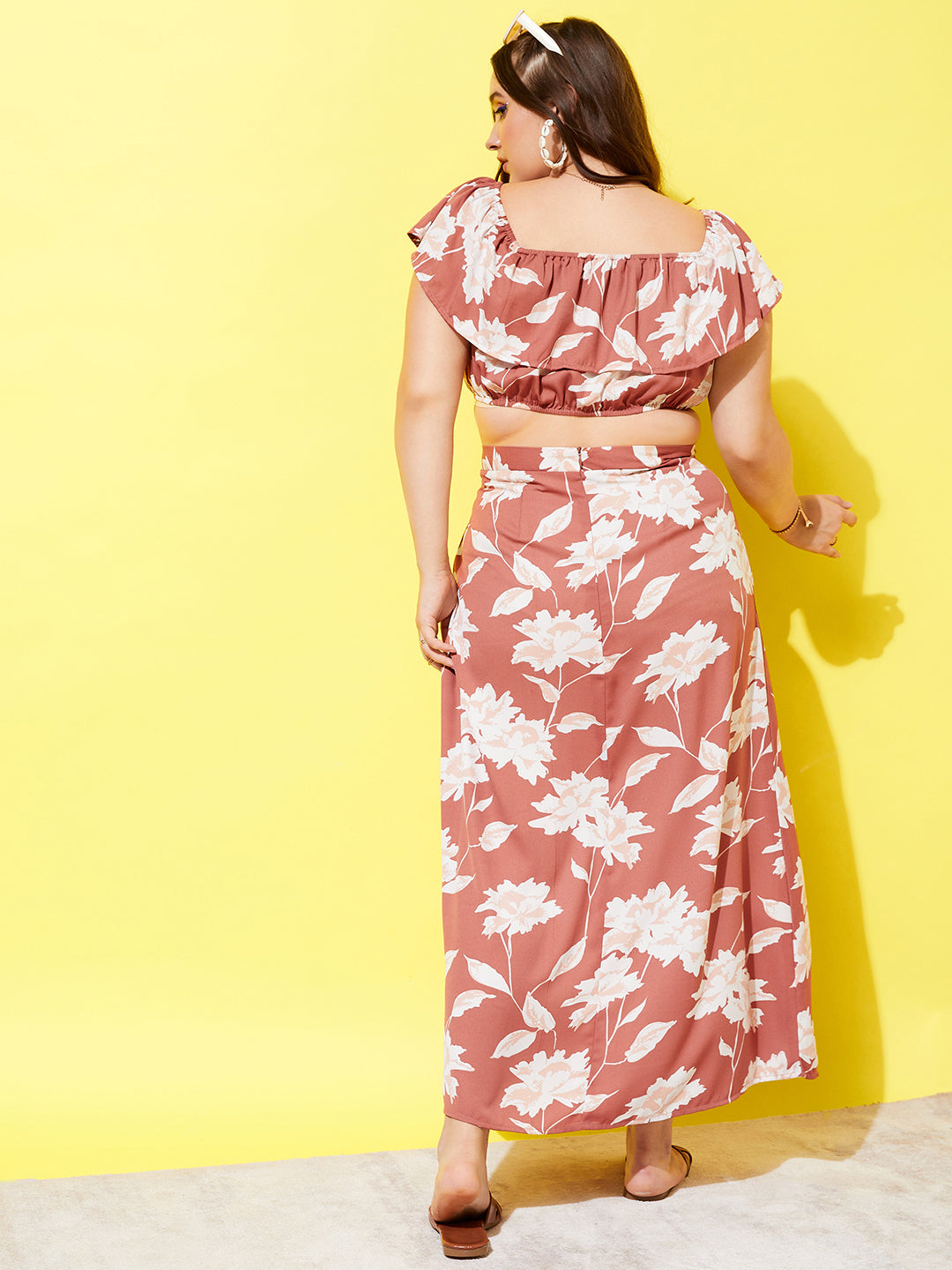 Berrylush Women Plus Size Brown & White Floral Printed Off-Shoulder Neck Crop Top & Thigh-High Slit Maxi Skirt Co-Ord Set