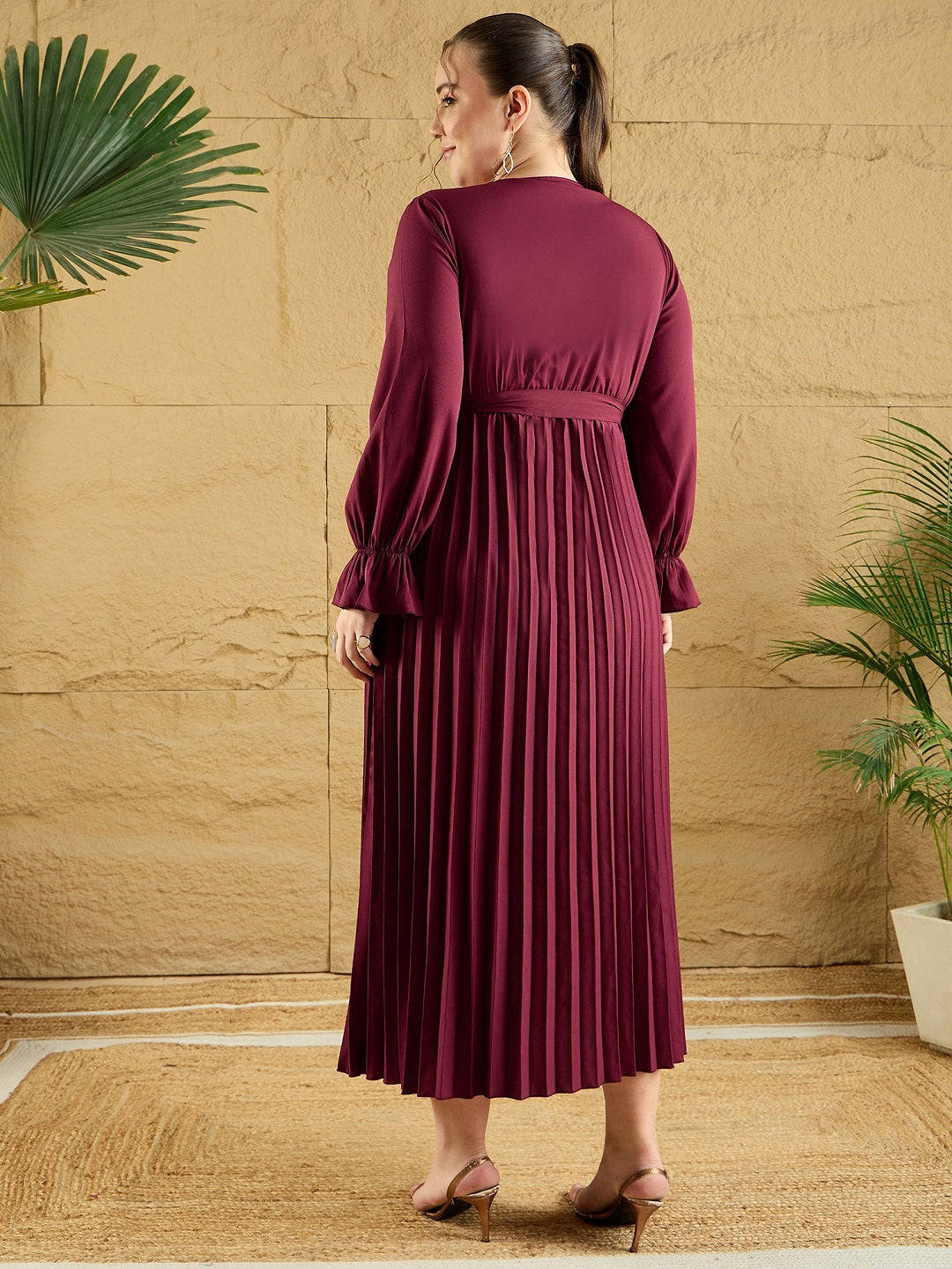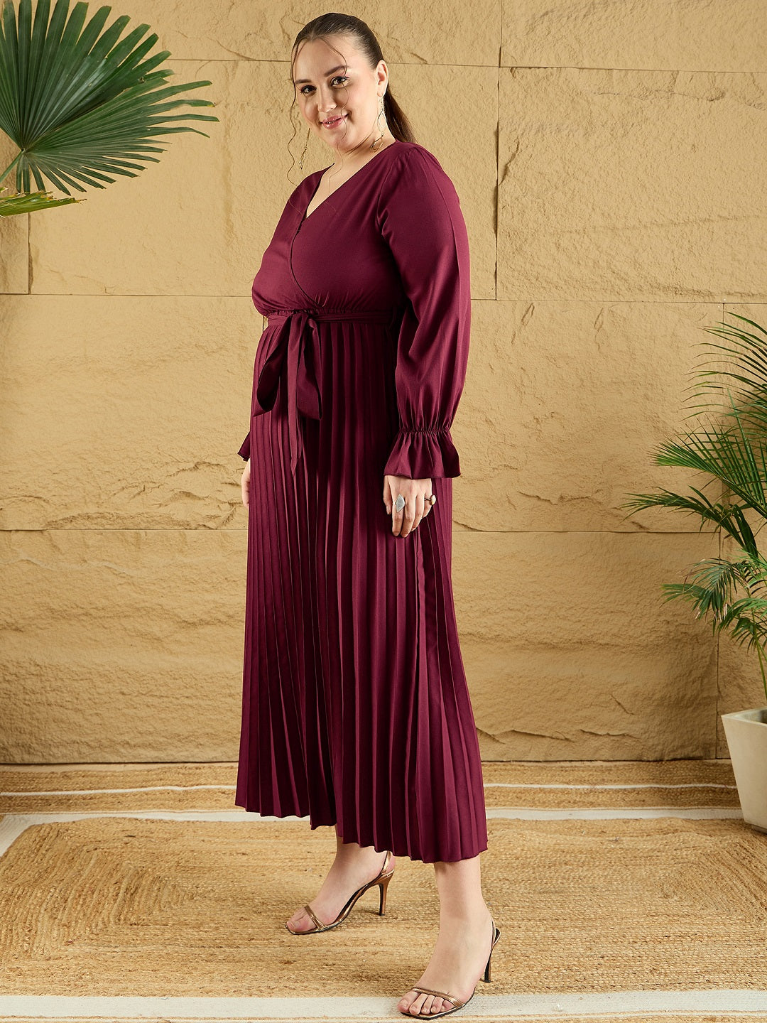 Berrylush Curve Women Solid Maroon V-Neck Bishop Sleeves Waist Tie-Up Pleated A-Line Maxi Dress