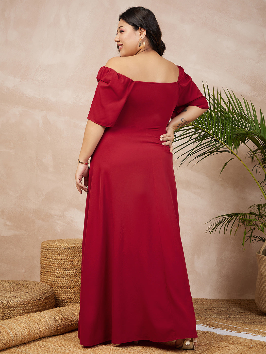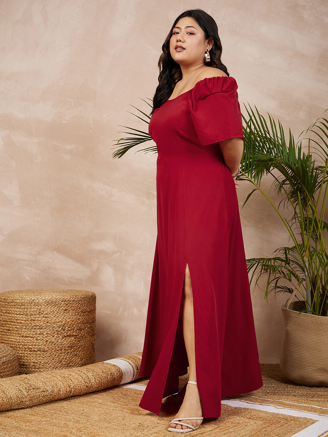 Berrylush Women Plus Size Solid Red Square Neck Puff Sleeve Thigh-High Slit Flared Maxi Dress