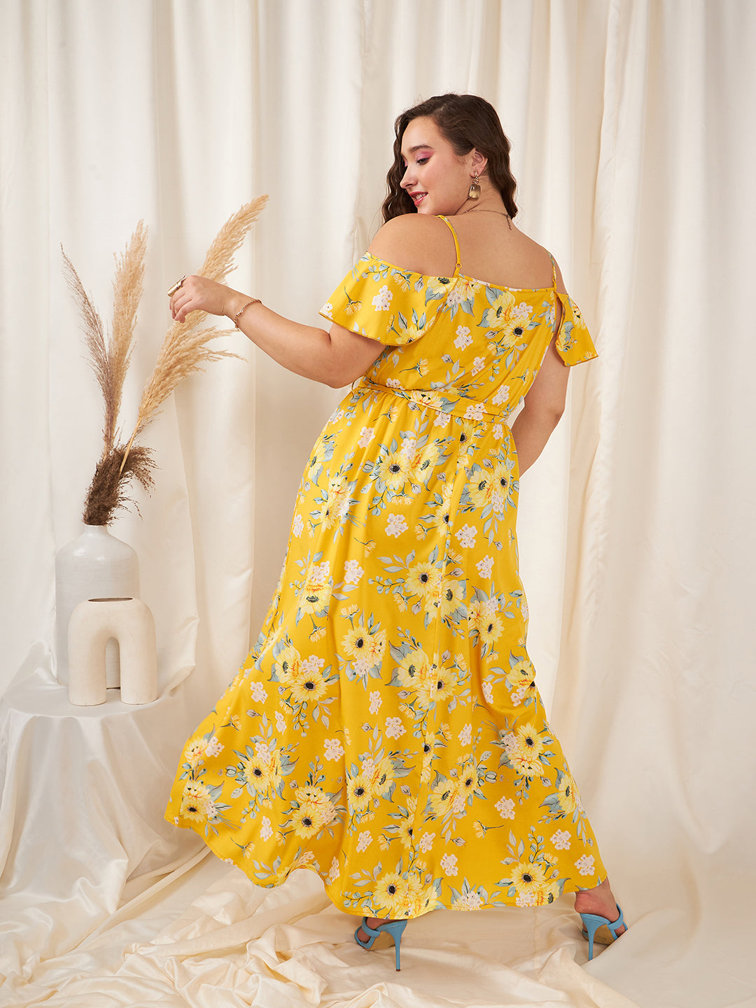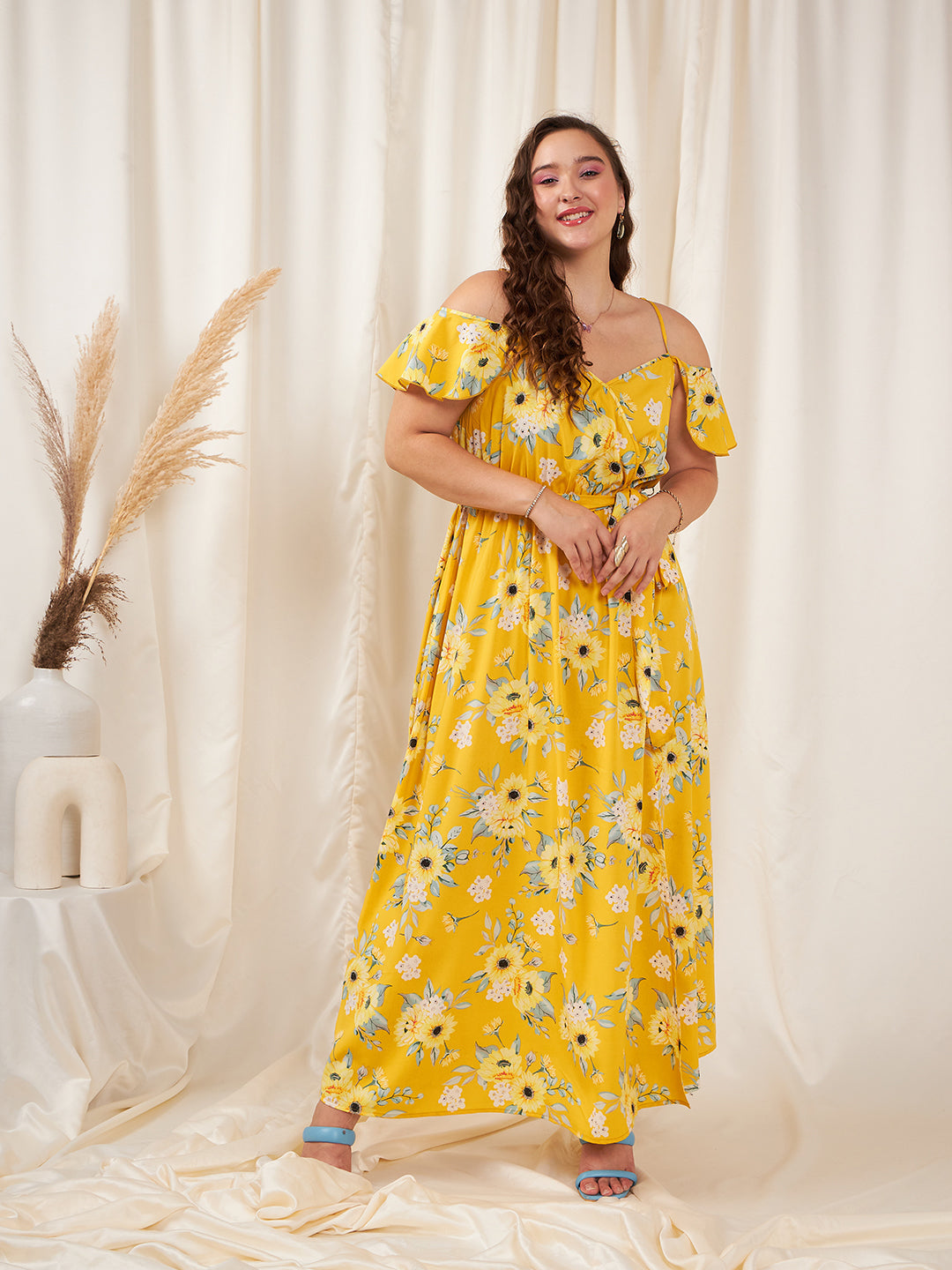 Berrylush Women Plus Size Yellow & White Floral Printed V-Neck Cold-Shoulder Sleeve Tie-Up Waist Thigh-High Slit Flared Maxi Dress