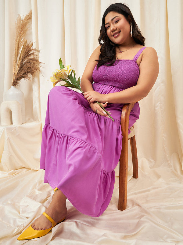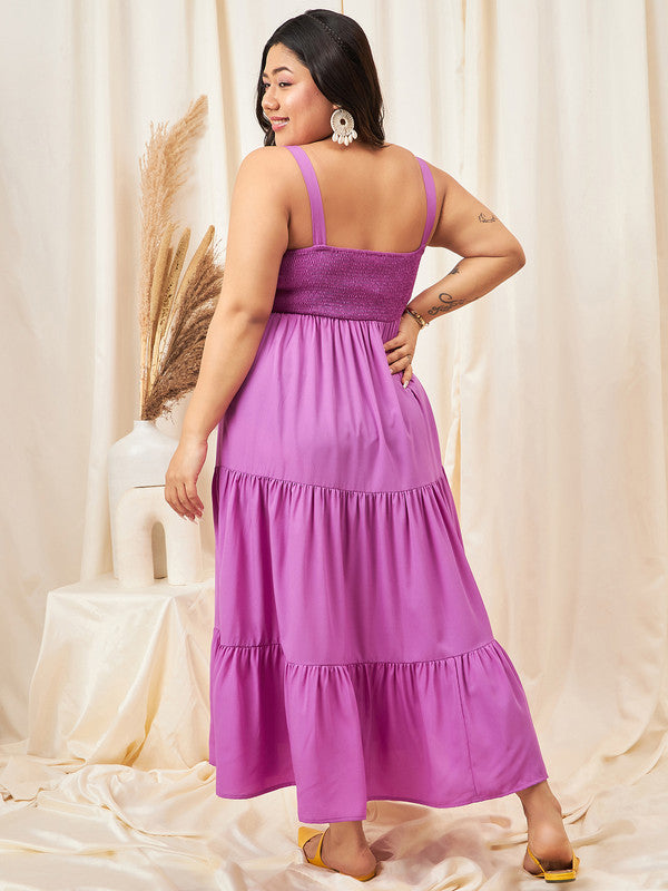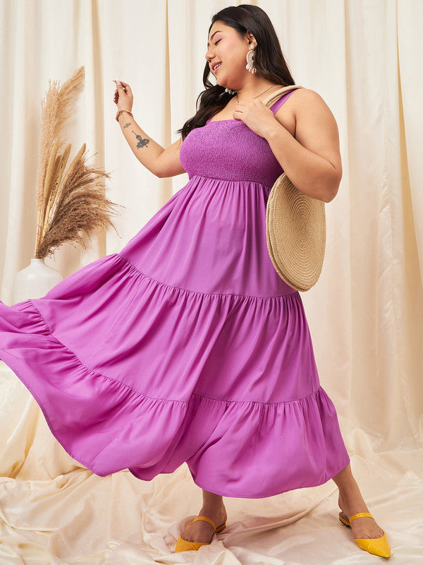 Berrylush Curve Women Solid Purple Square Neck Sleeveless Smocked A-Line Maxi Dress