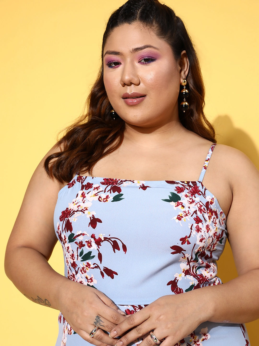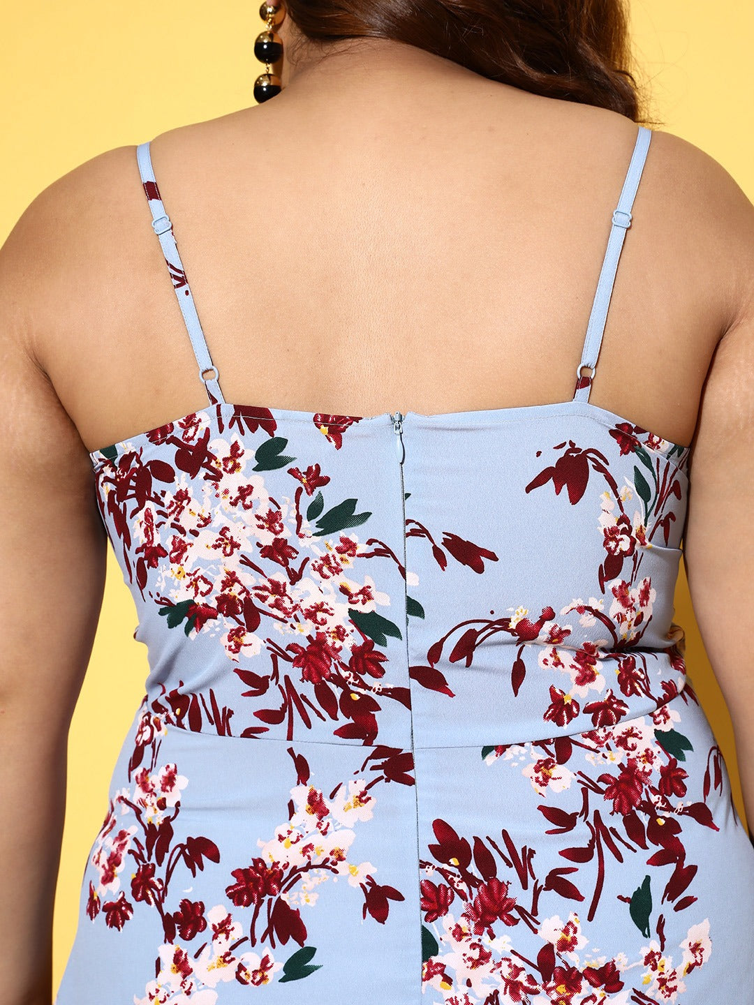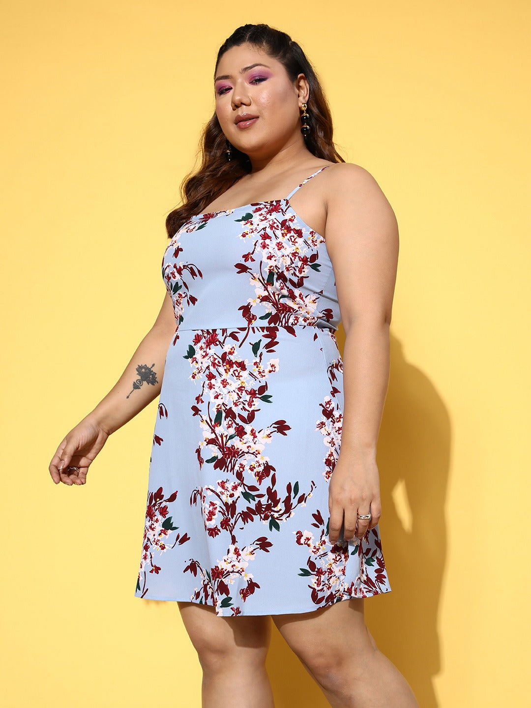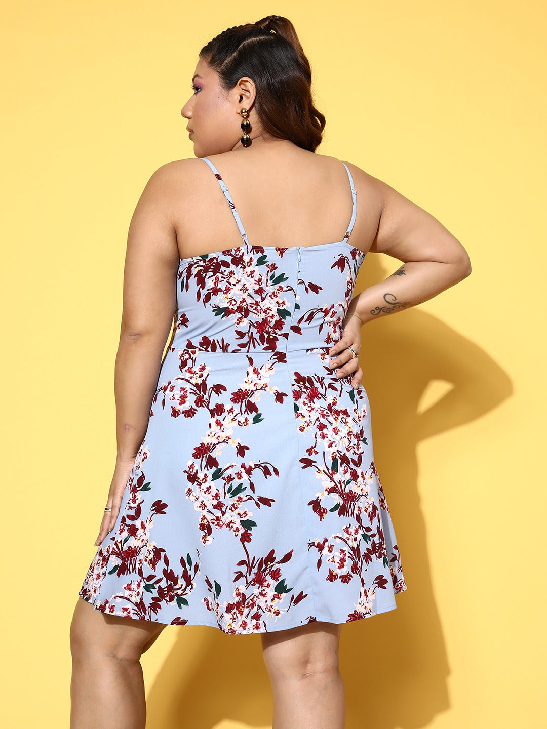 Berrylush Women Plus Size Blue & Maroon Floral Printed Square Neck Sleeveless Crepe Fit & Flare Mini Dress