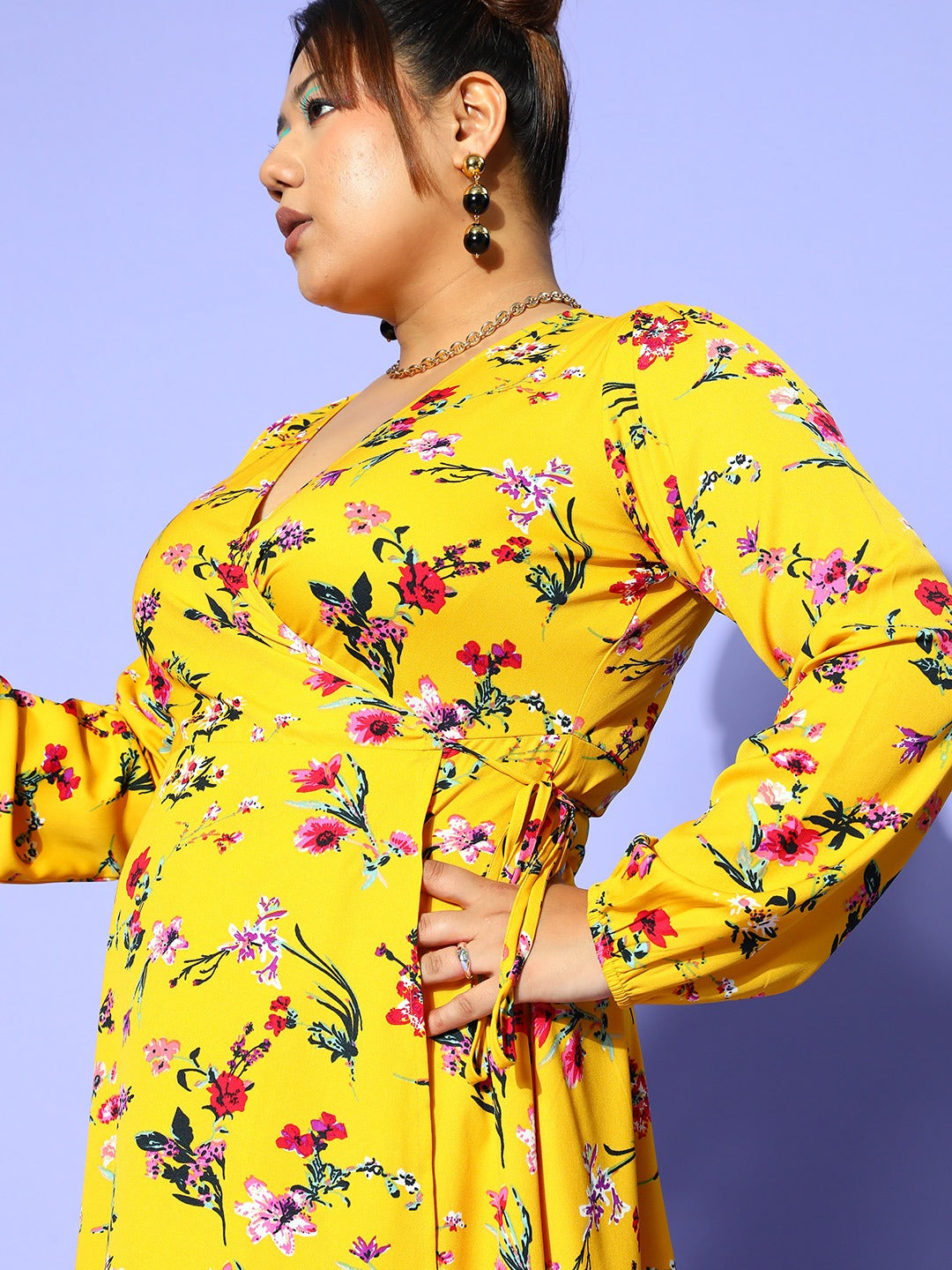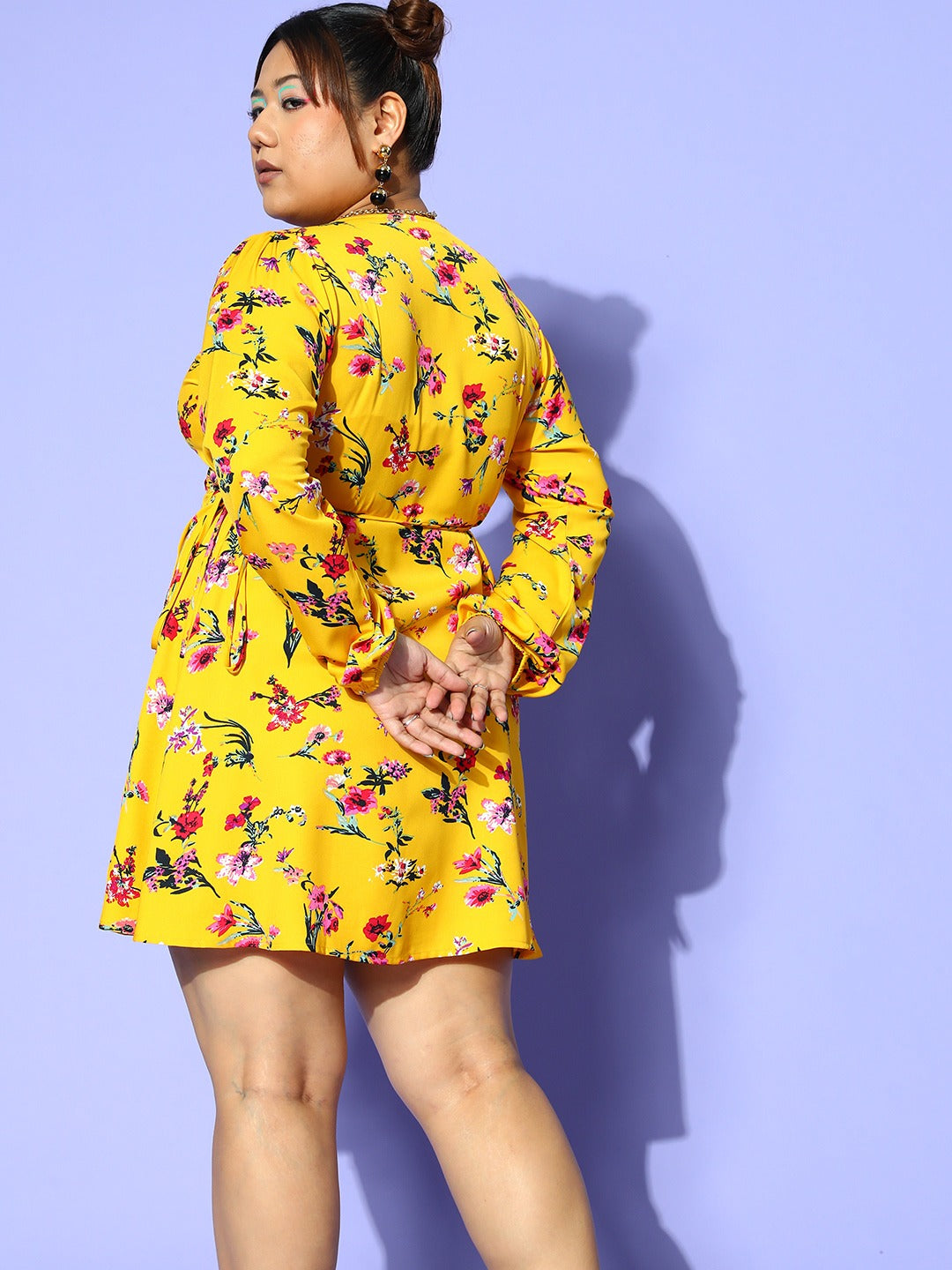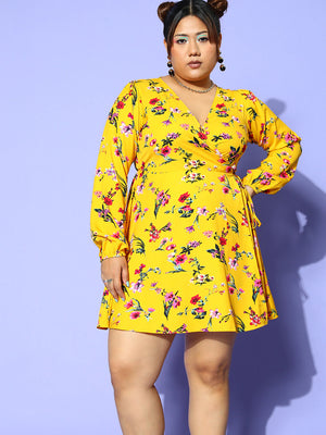 Berrylush Women Plus Size Yellow & Red Floral Printed V-Neck Waist Tie-Up Fit & Flare Wrap Mini Dress