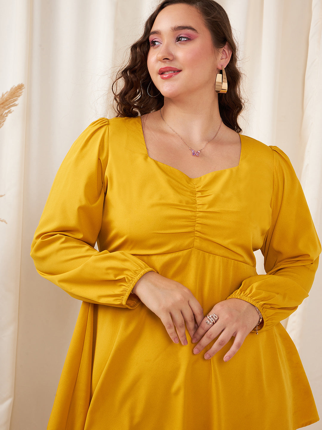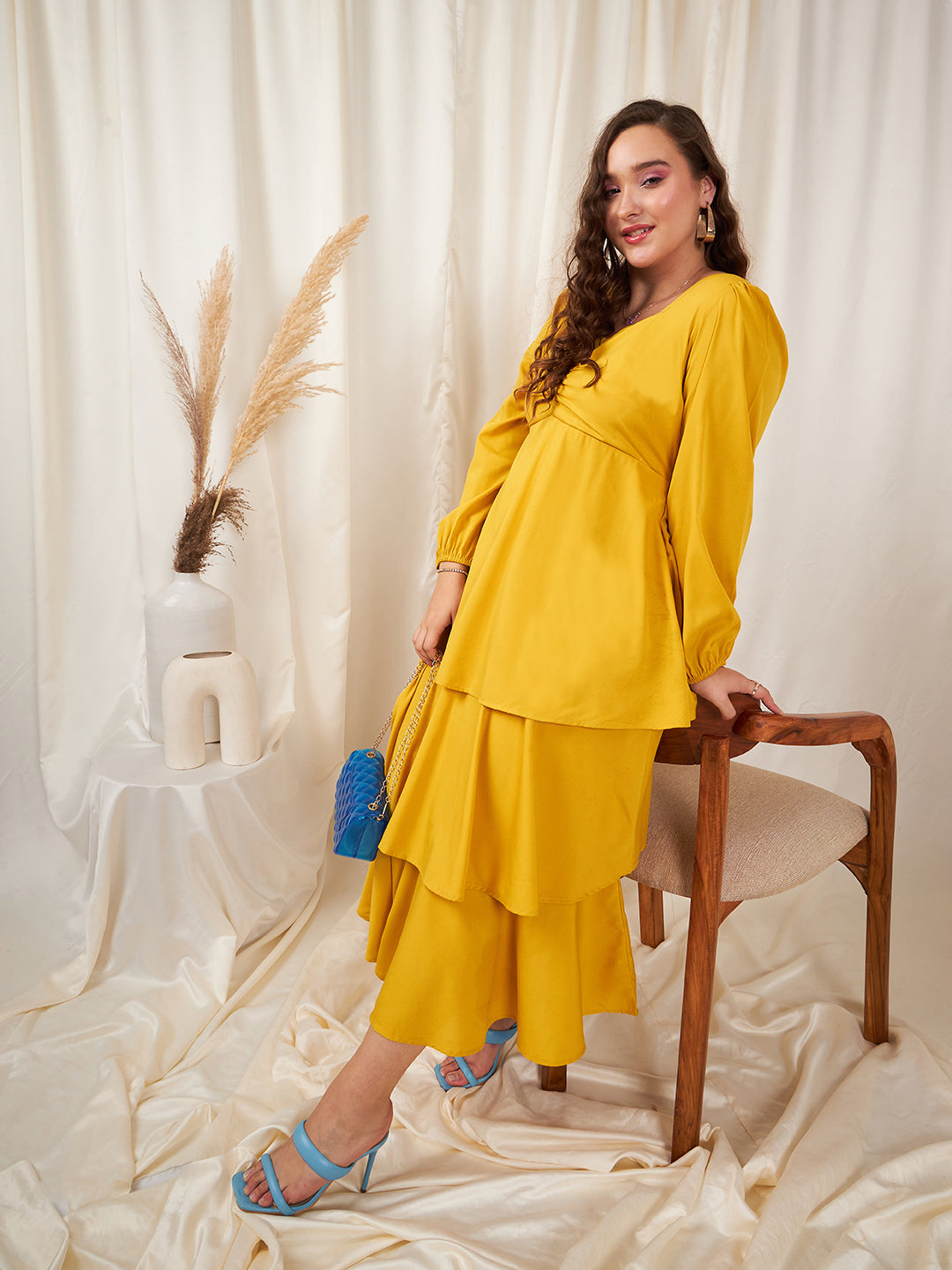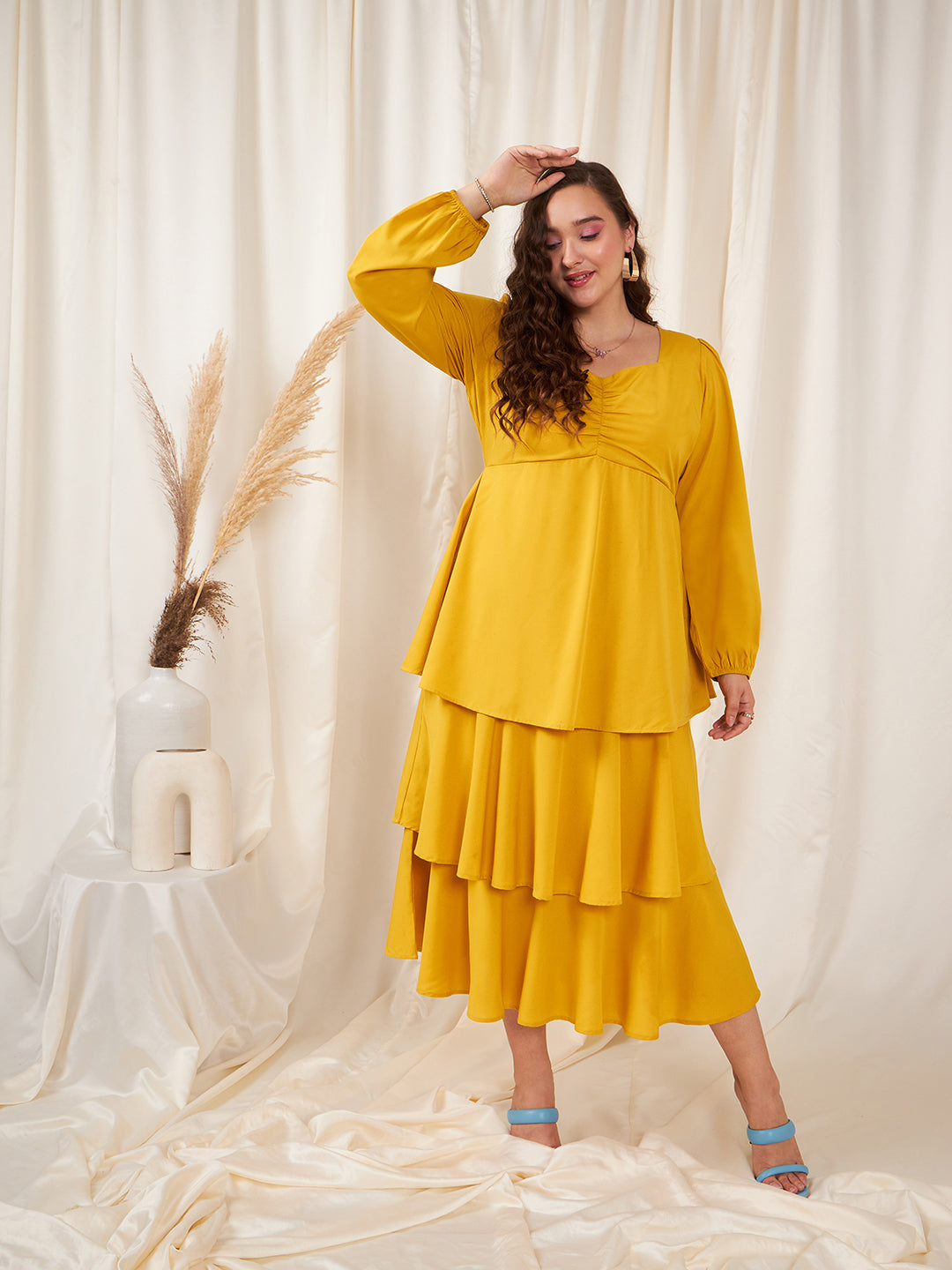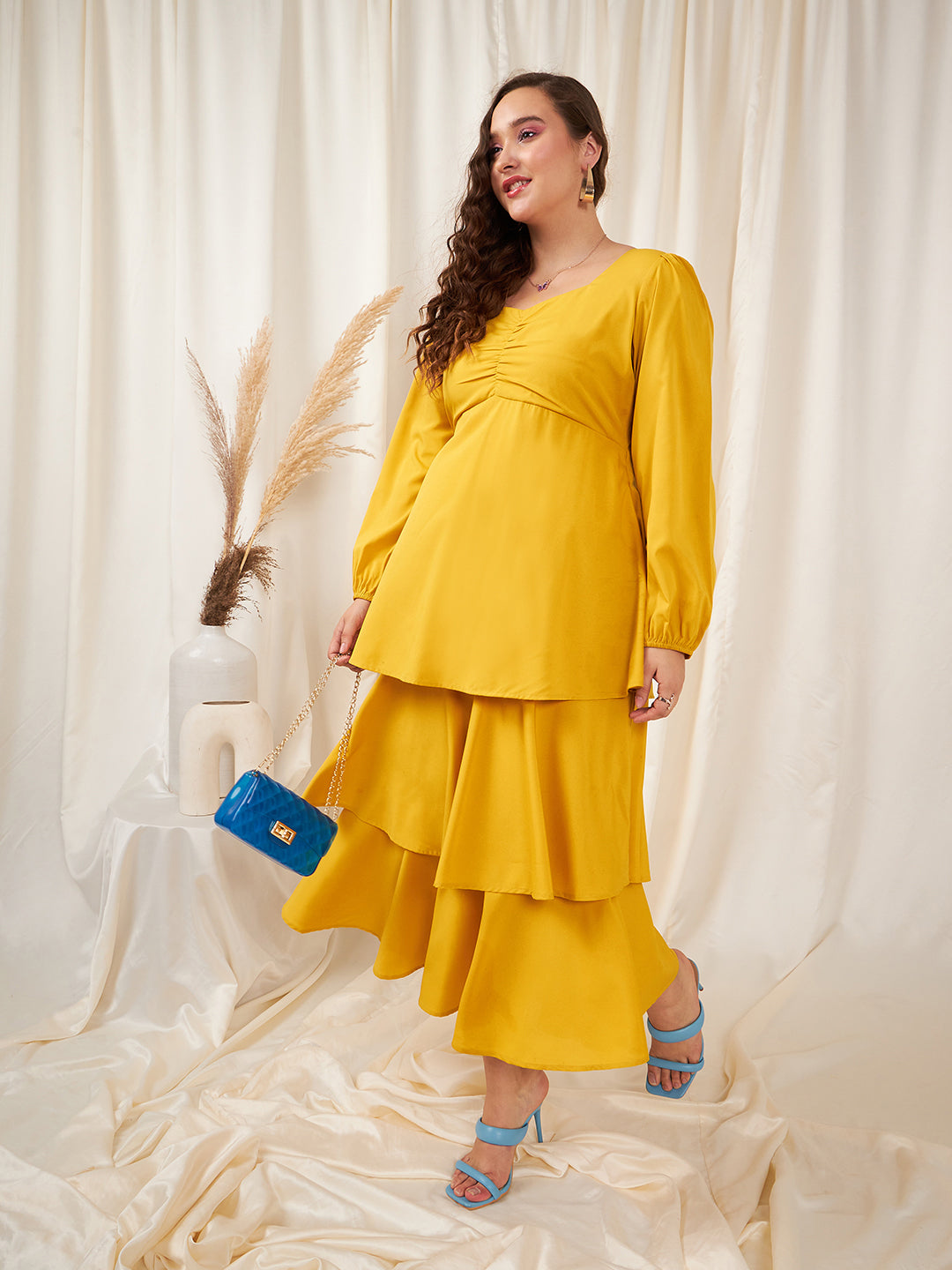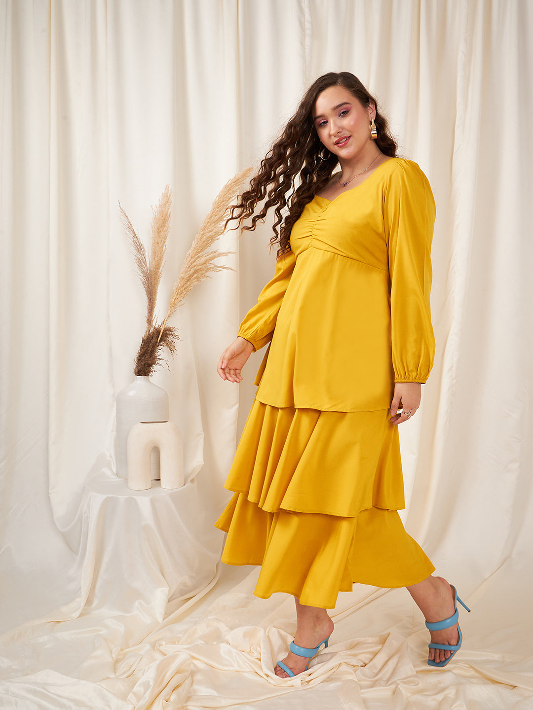 Berrylush Women Plus Size Solid Yellow Sweetheart Neck Puff Sleeve Zipper-Up Layered Maxi Dress