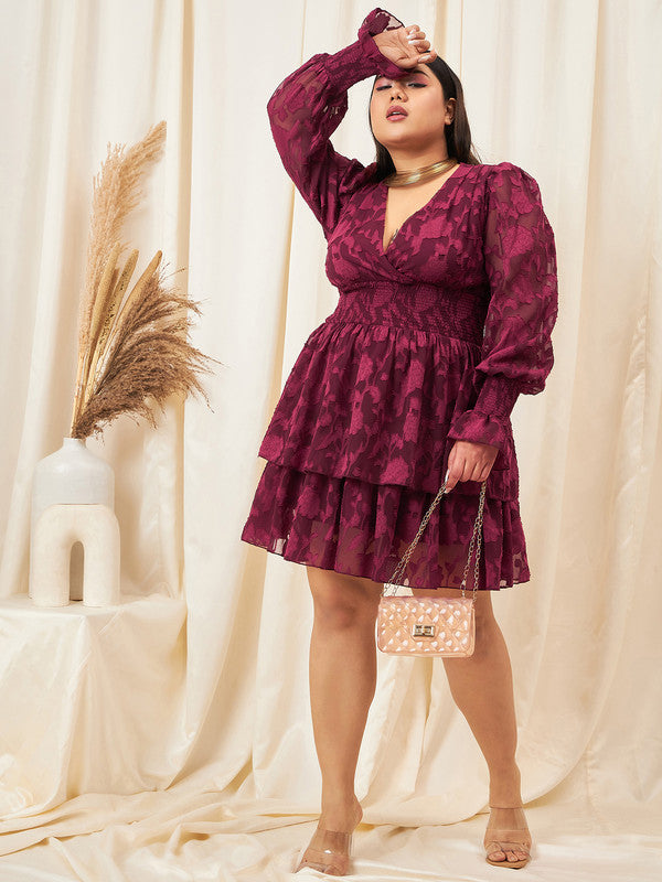 Berrylush Curve Women Maroon Floral Printed V-Neck Puff Sleeves Smocked Waist Wrap Layered Mini Dress
