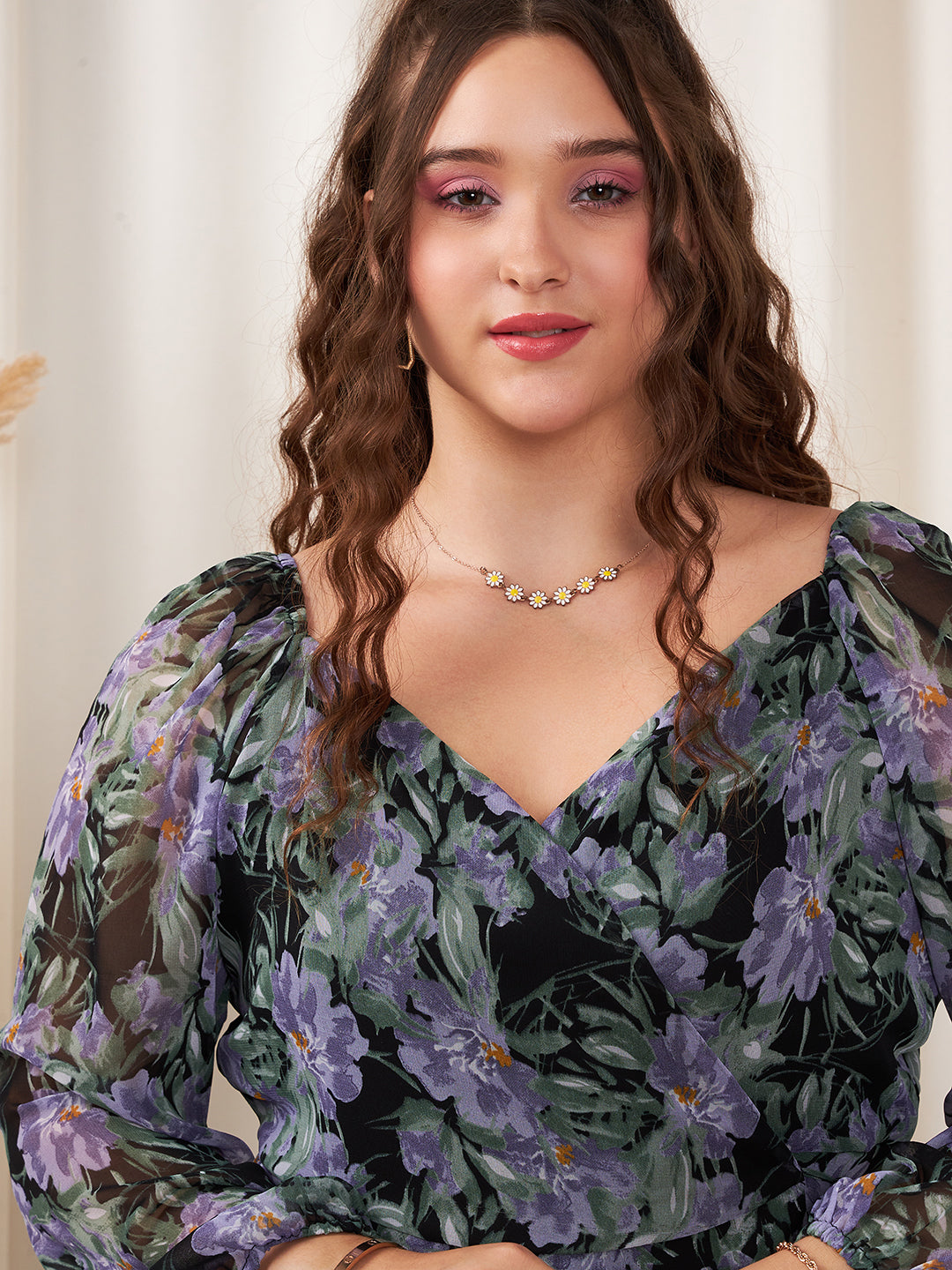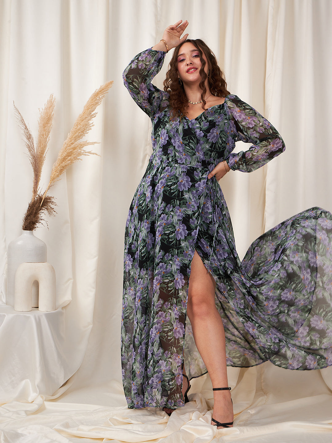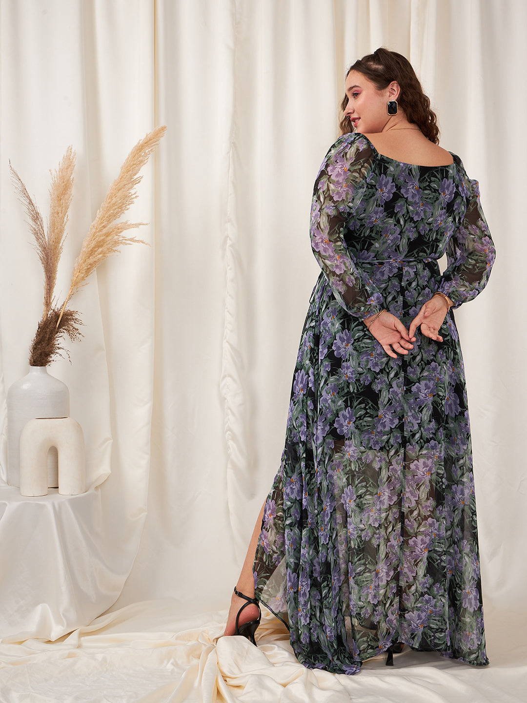 Berrylush Women Plus Size Black, Blue, & Green Floral Printed Sweetheart Neck Waist Tie-Up Georgette Pleated Wrap Maxi Dress