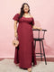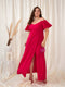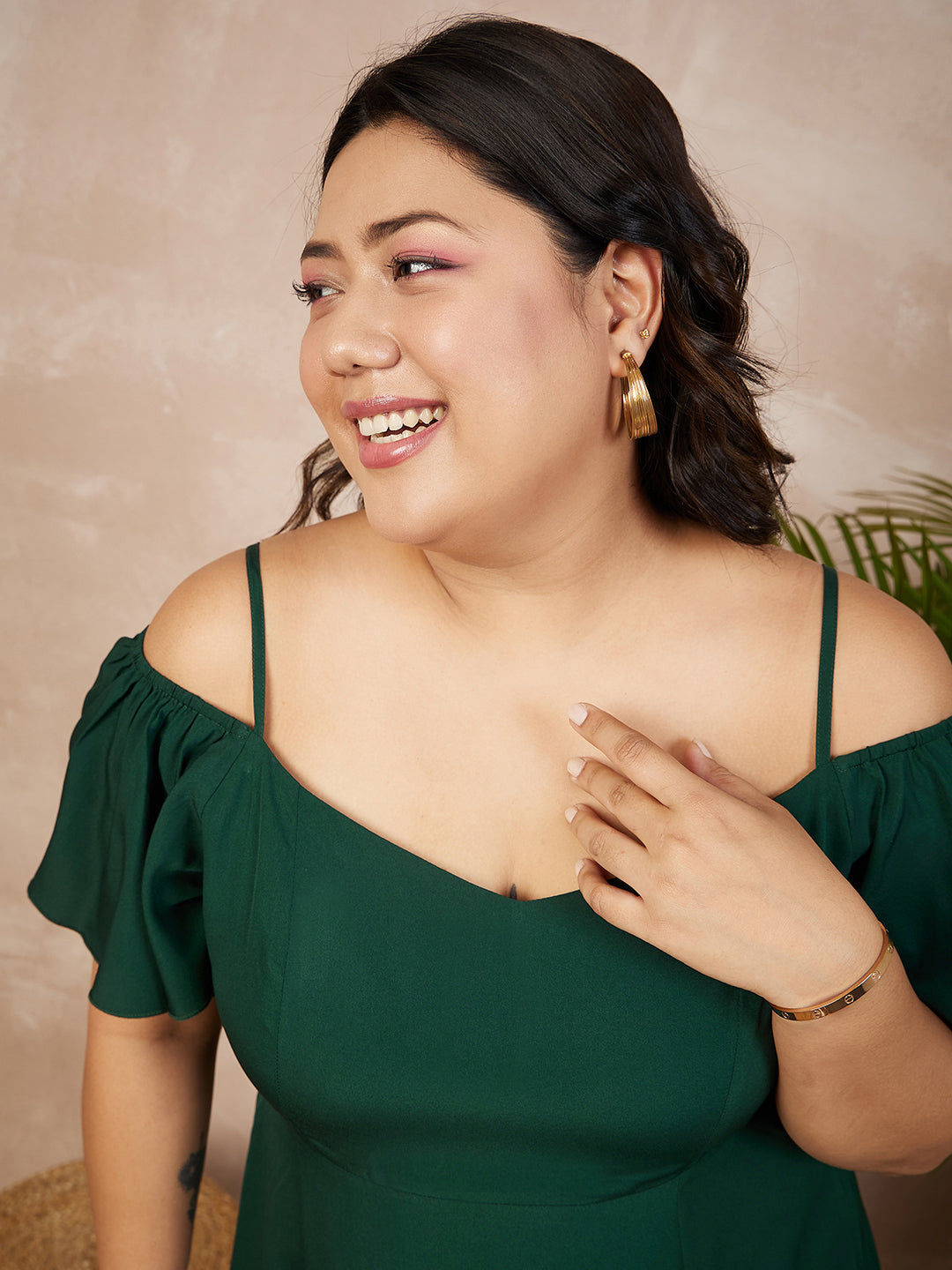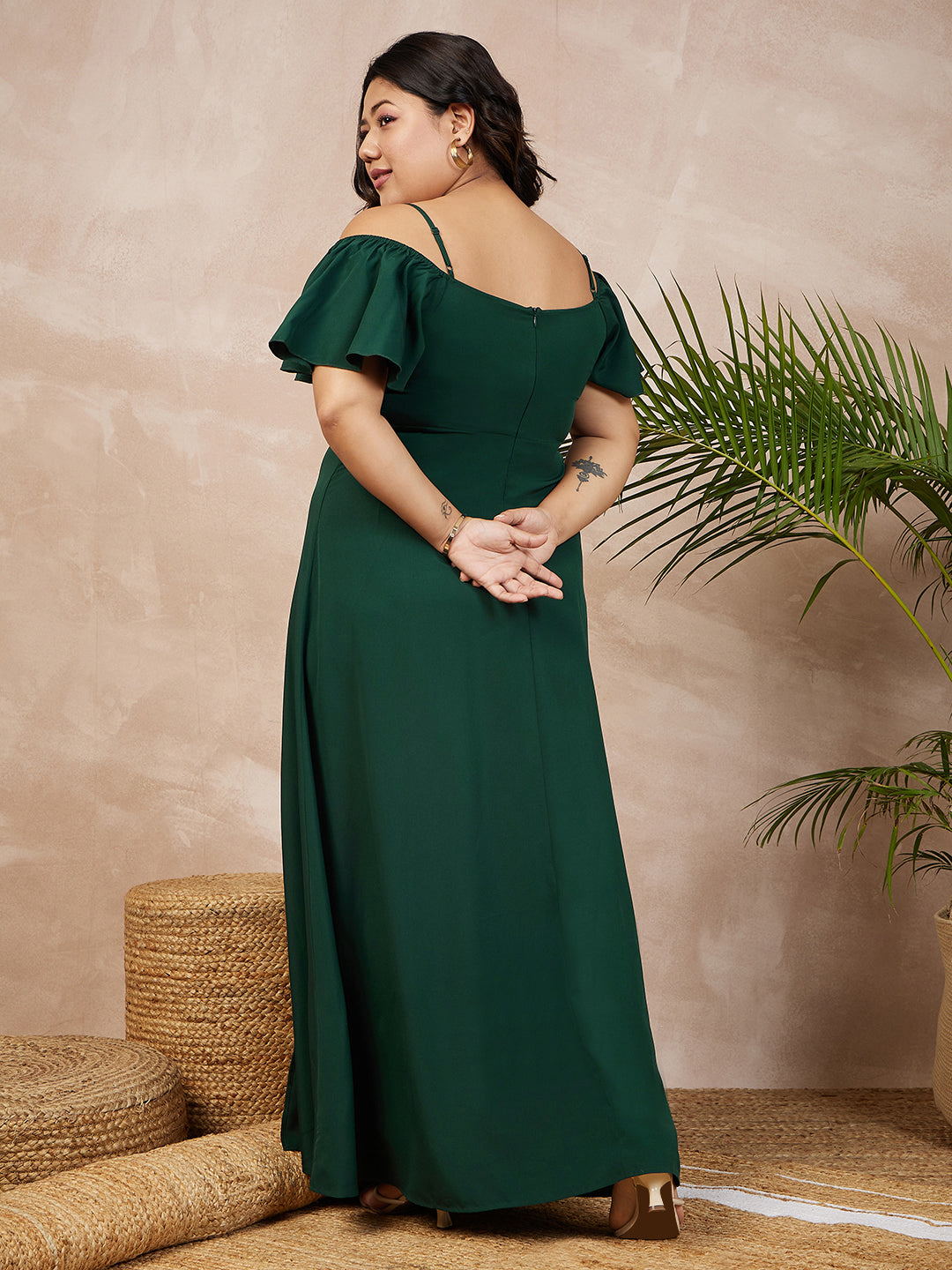 Berrylush Women Plus Size Solid Green Off-Shoulder Neck Cold-Shoulder Sleeve Thigh-High Slit Flared Maxi Dress