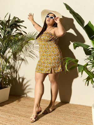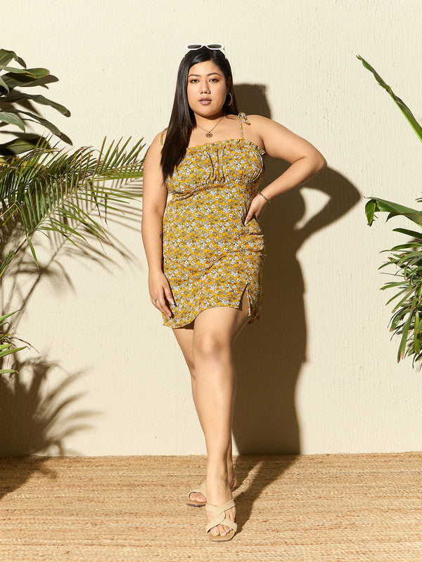 Berrylush Curve Women Mustard Yellow & White Floral Printed Square Neck Sleeveless Crepe Straight Hem A-Line Empire Mini Dress
