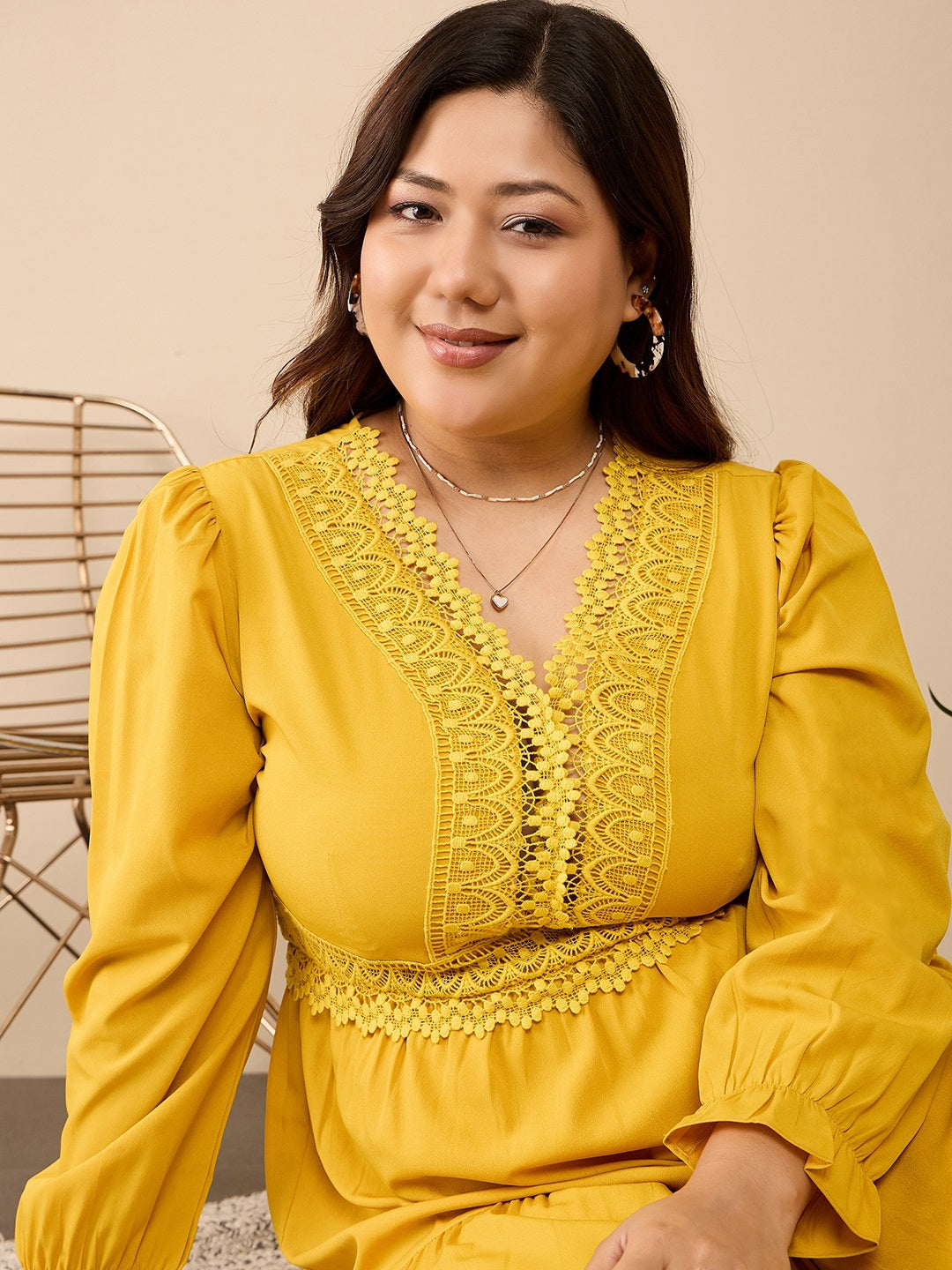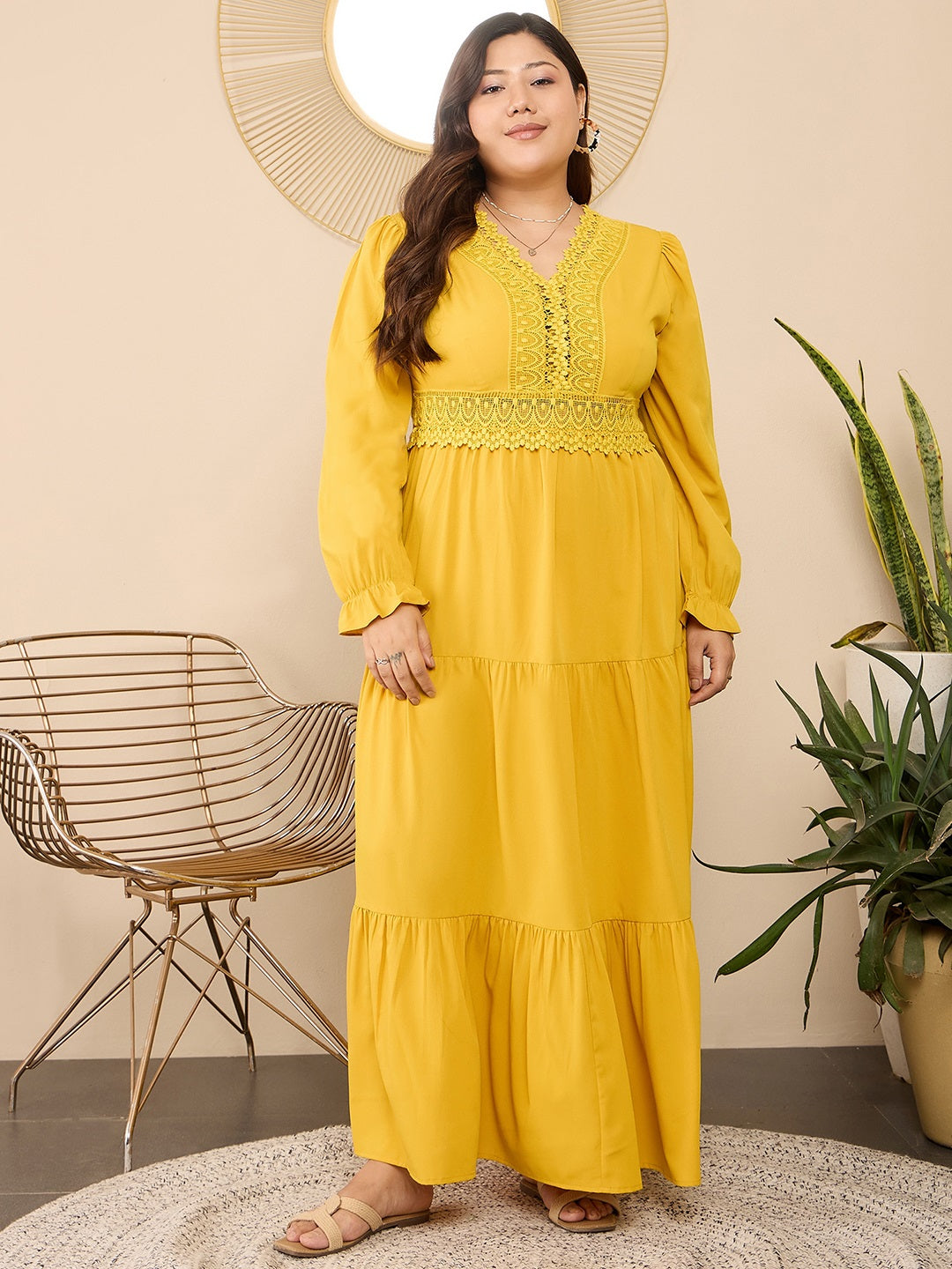 Berrylush Curve Women Solid Yellow V-Neck Bishop Sleeves Front Lace Detail Flared Maxi Dress