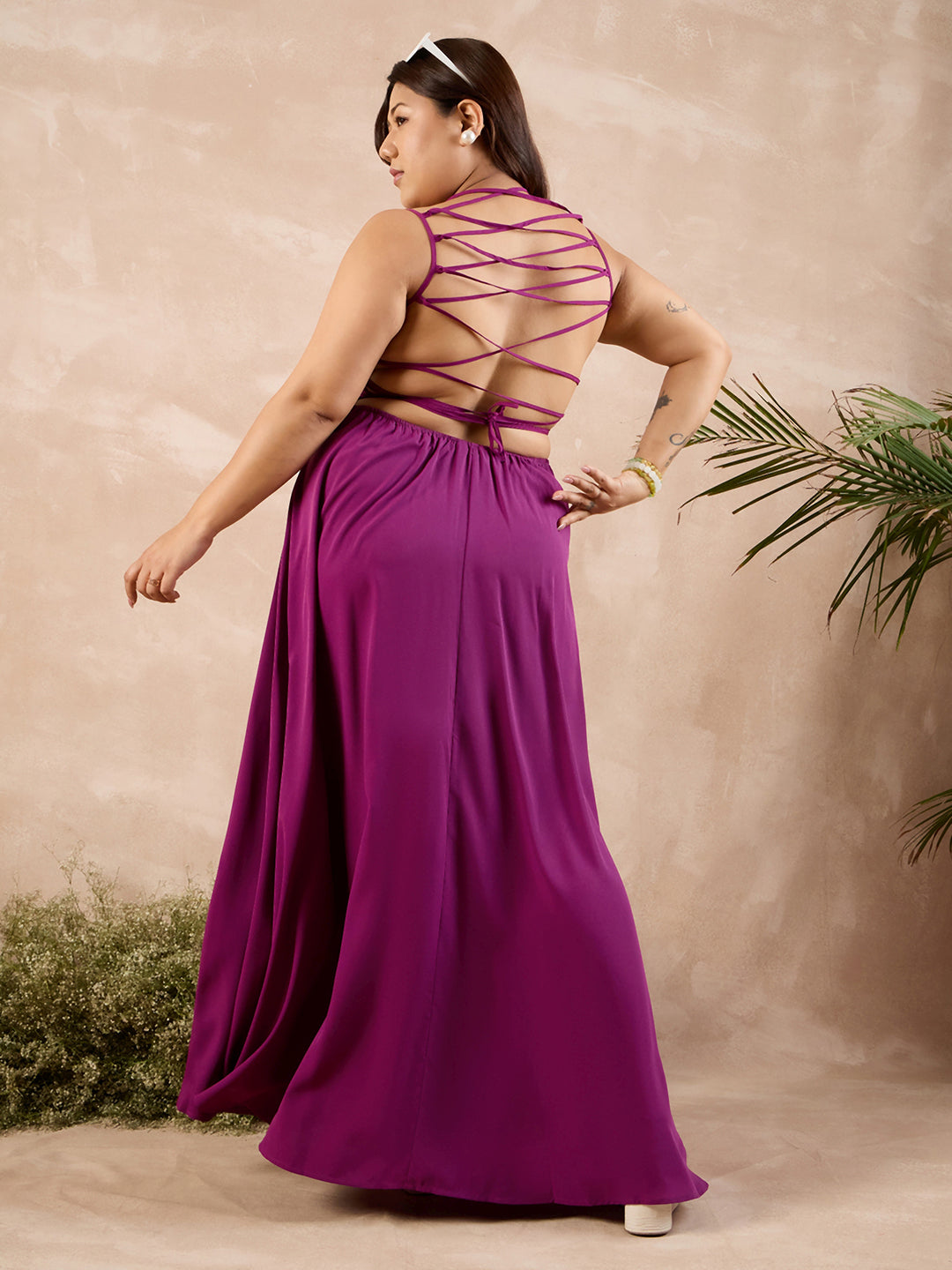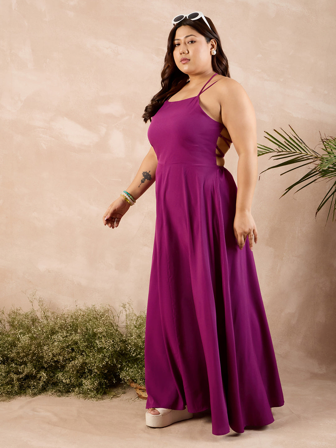 Introducing the Berrylush Curve Solid Purple Maxi Dress—a testament to understated elegance. This sleeveless, square-neck stunner boasts a gracefully flared hemline that dances with each step you take. Crafted from premium polyester with a woven texture, it offers both comfort and durability. Ideal for casual occasions, its unique caged back and tie-up closure add an intriguing touch of romance to your ensemble. Opaque yet airy, this solid purple dress perfectly marries simplicity with sophistication for the modern woman who loves her curves.