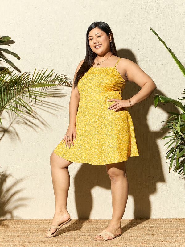 Berrylush Curve Women Yellow & White Floral Printed Square Neck Sleeveless Crepe Fit & Flare Mini Dress