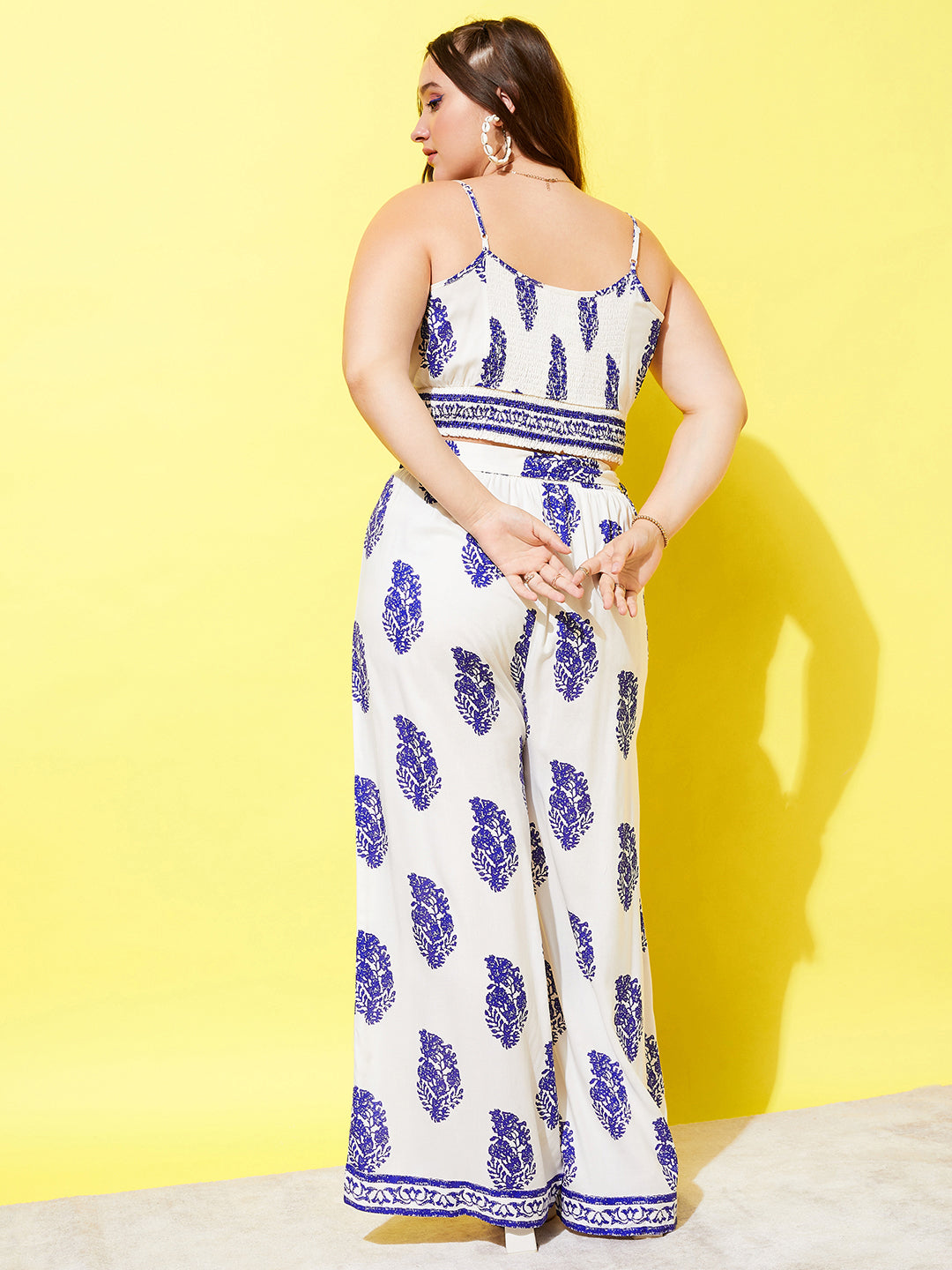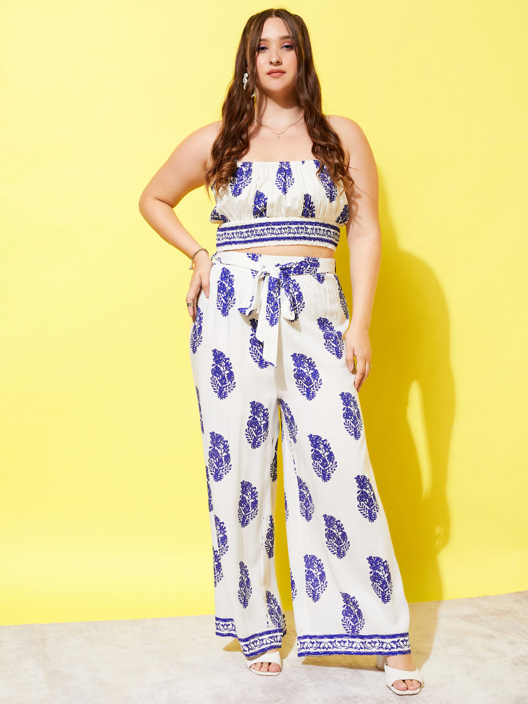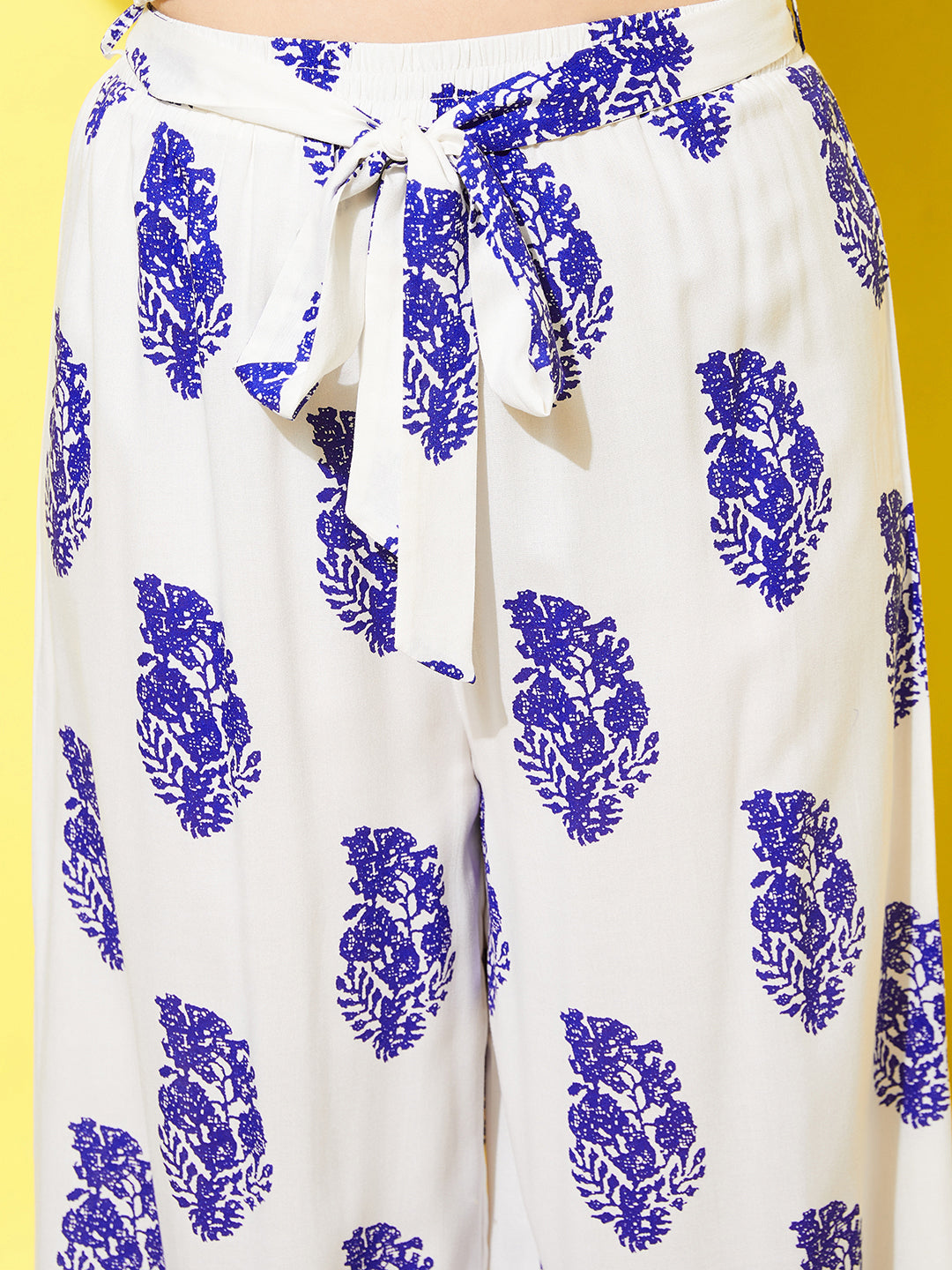 Berrylush Women Plus Size White & Blue Paisley Printed Round Neck Waist Tie-Up Crop Top & Wide-Leg Trousers Co-Ord Set