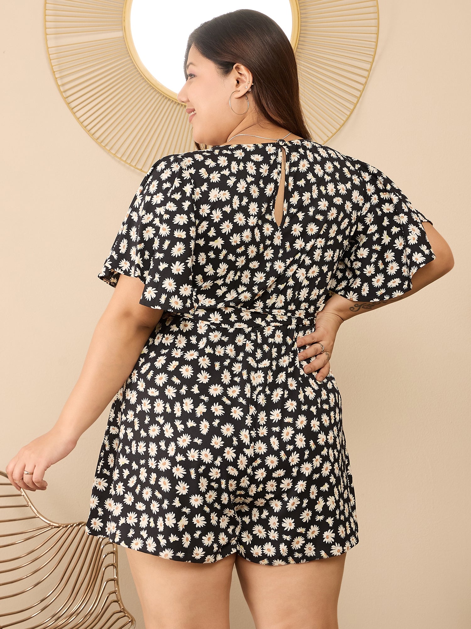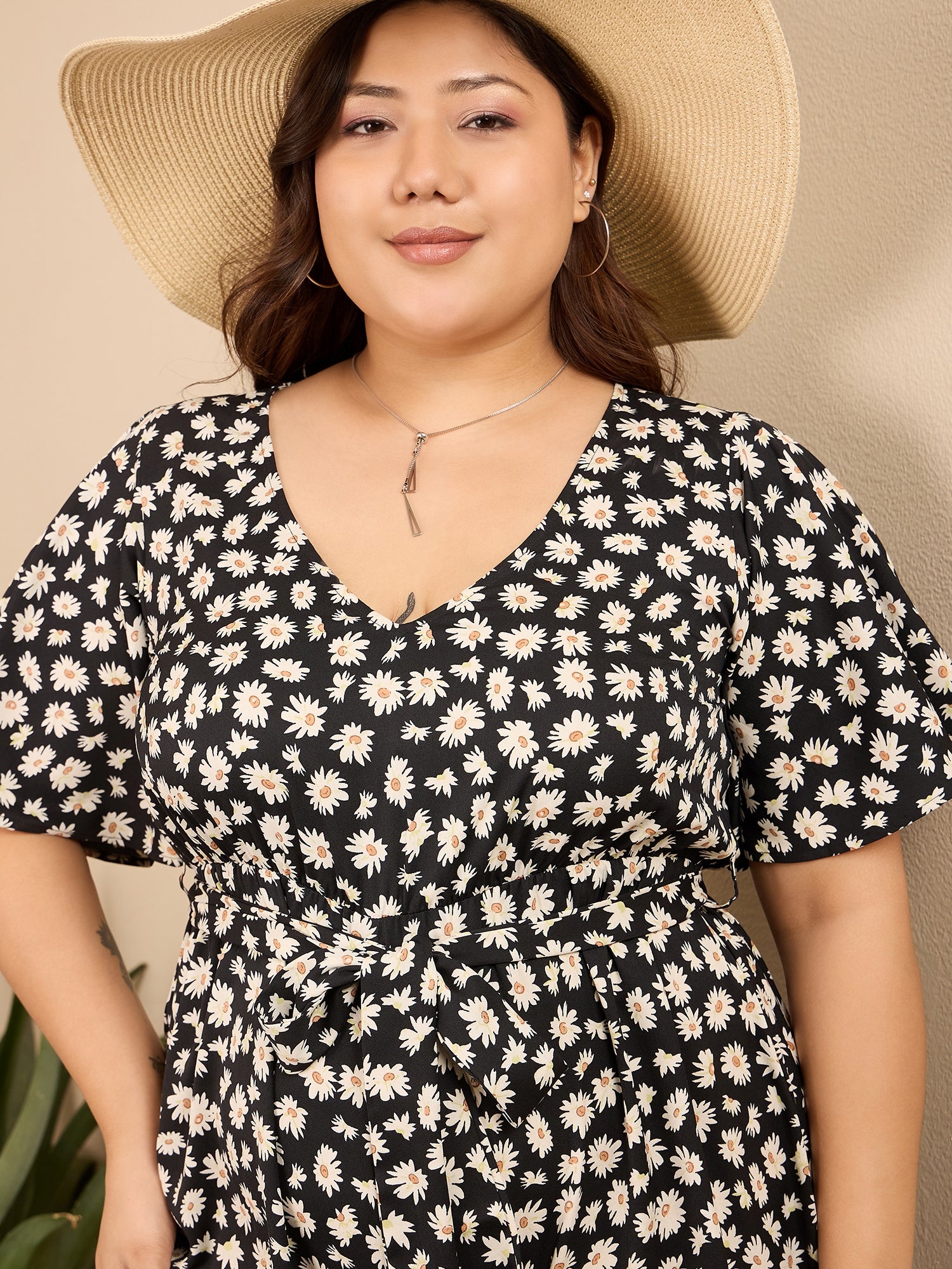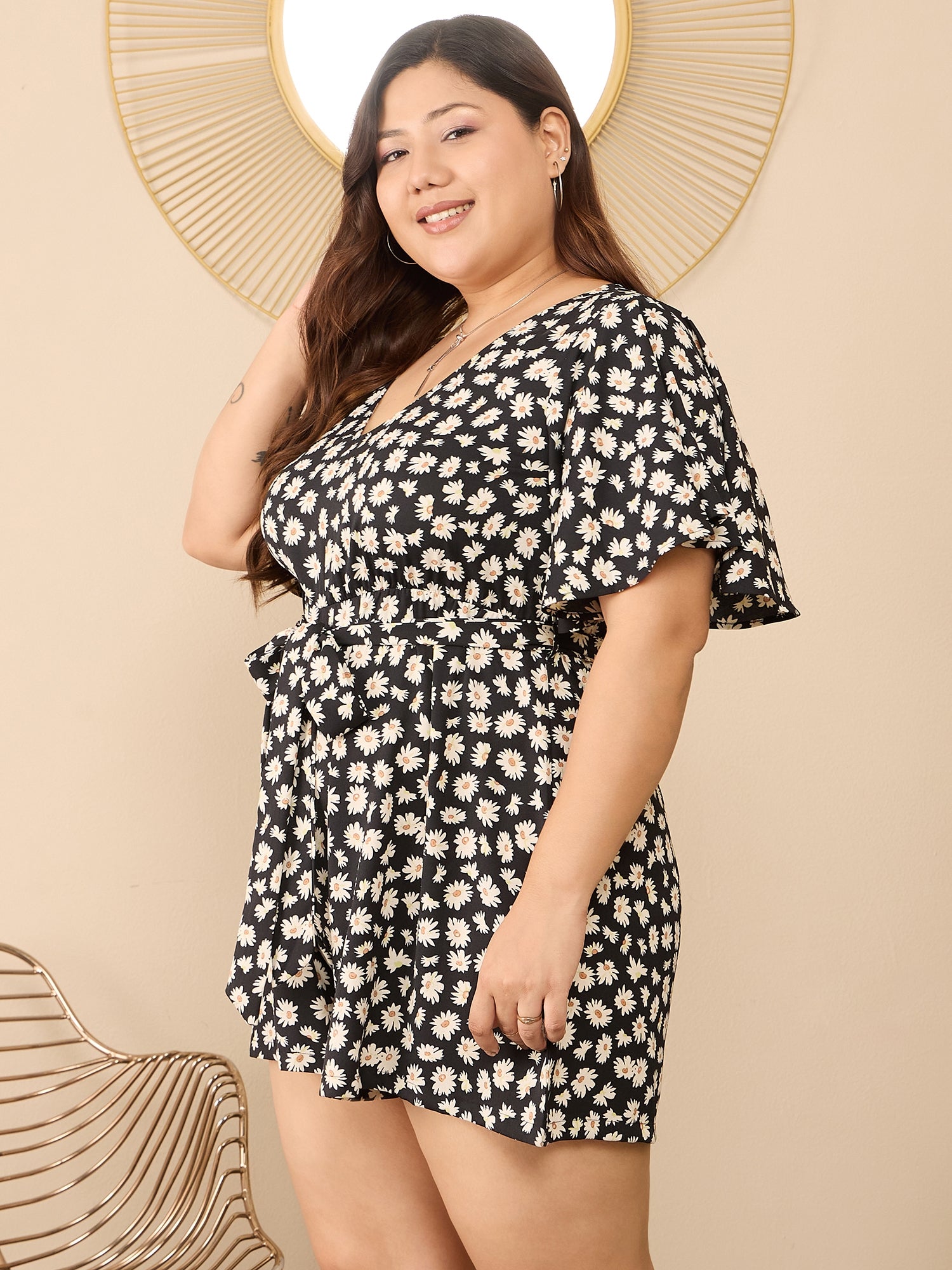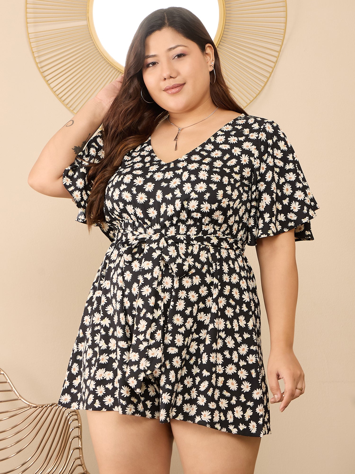 Berrylush Curve Women Black & White Floral Printed V-Neck Flared Sleeves Tie-Up Waist Back Keyhole Straight Hem Mini Jumpsuit