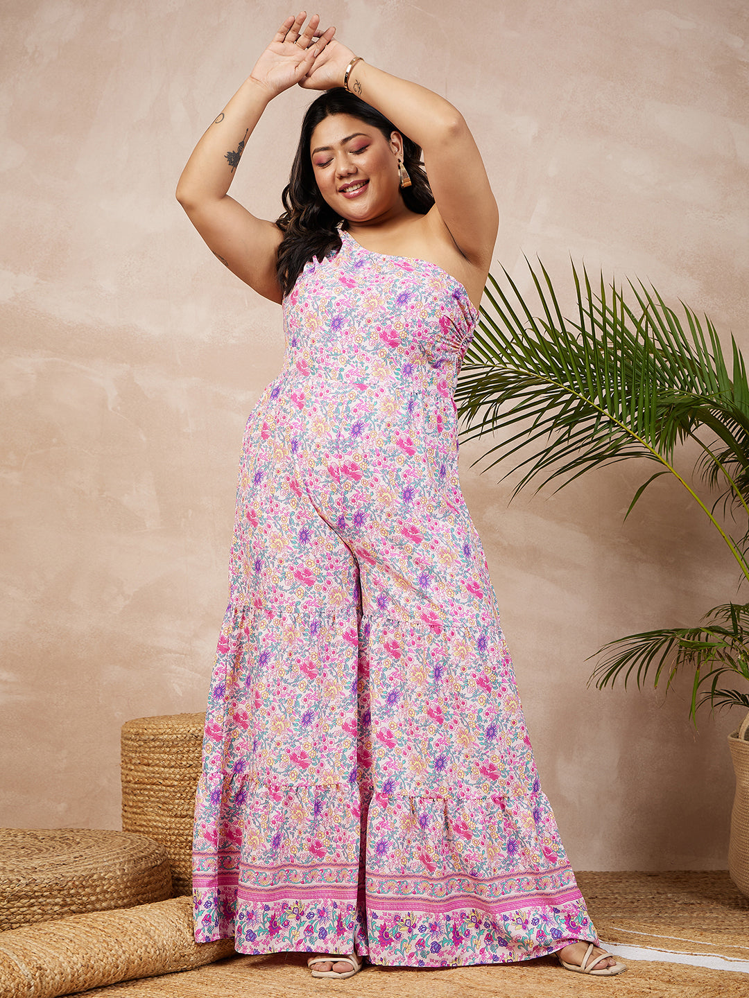 Berrylush Women Plus Size Pink & Purple Floral Printed One-Shoulder Neck Sleeveless Wide-Leg Maxi Jumpsuit