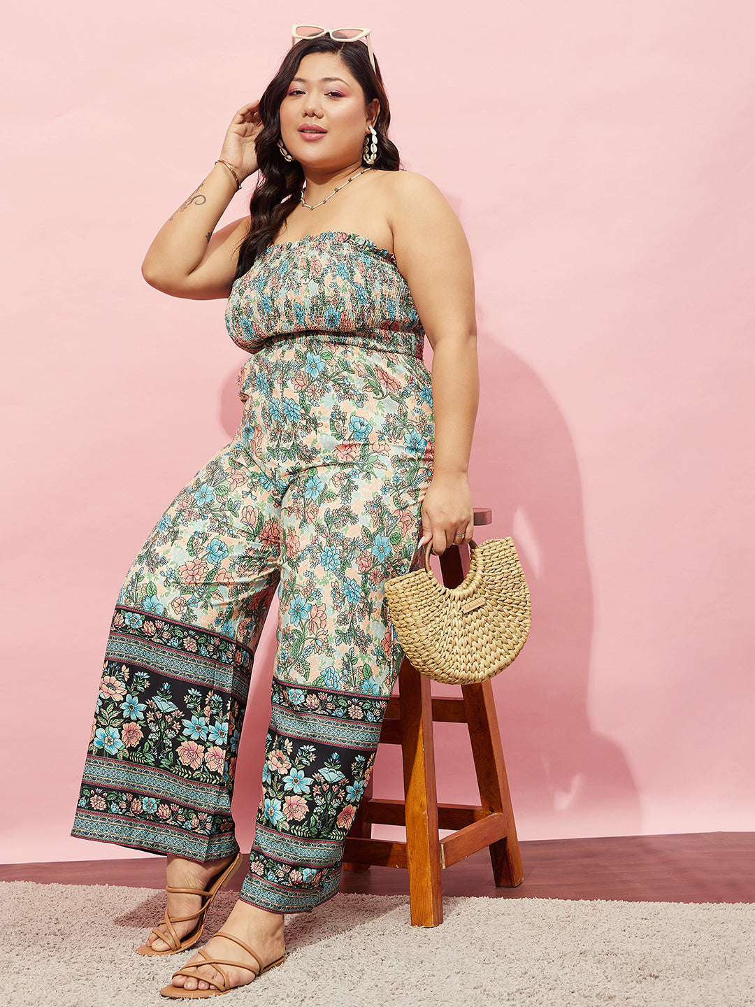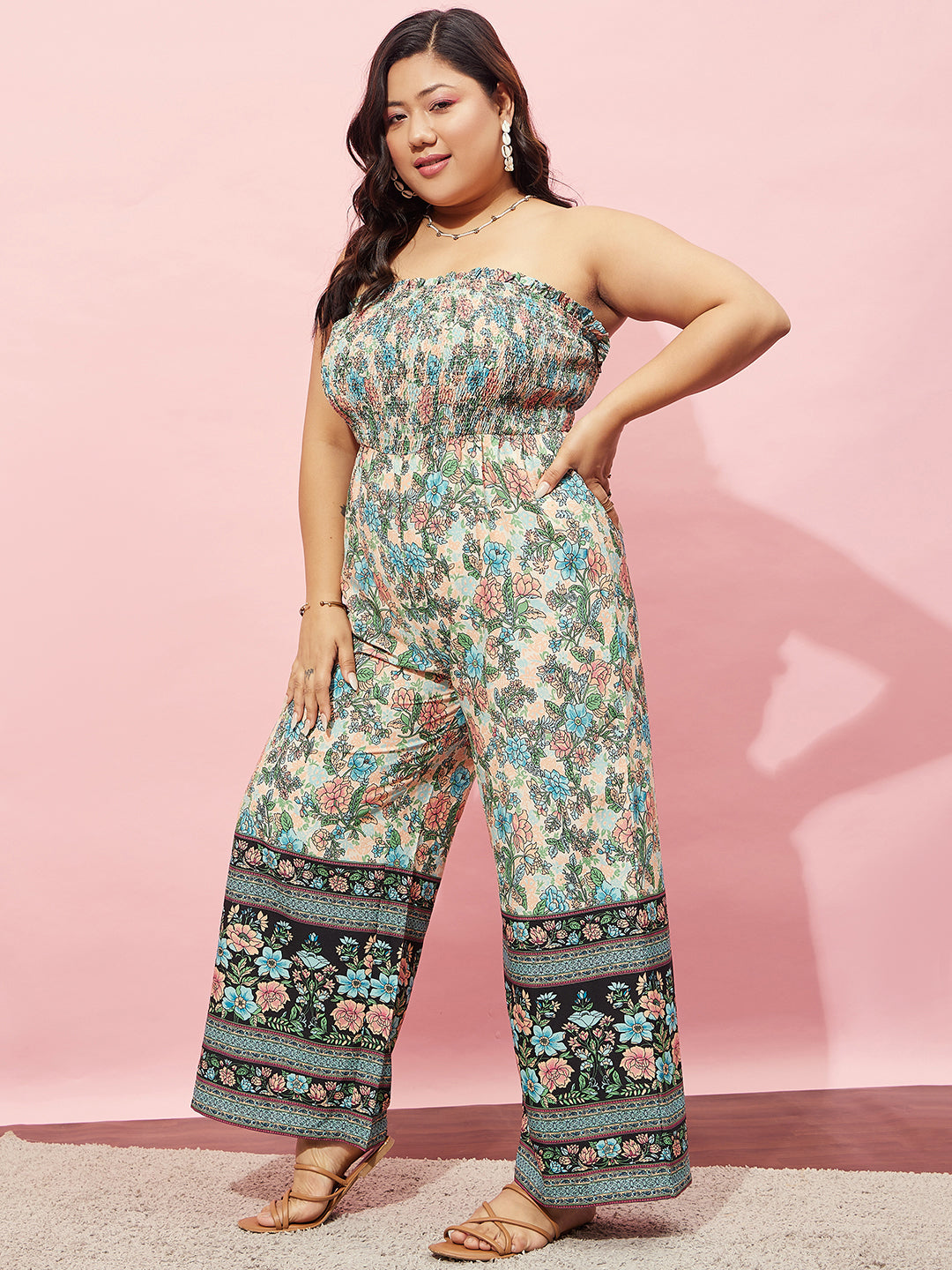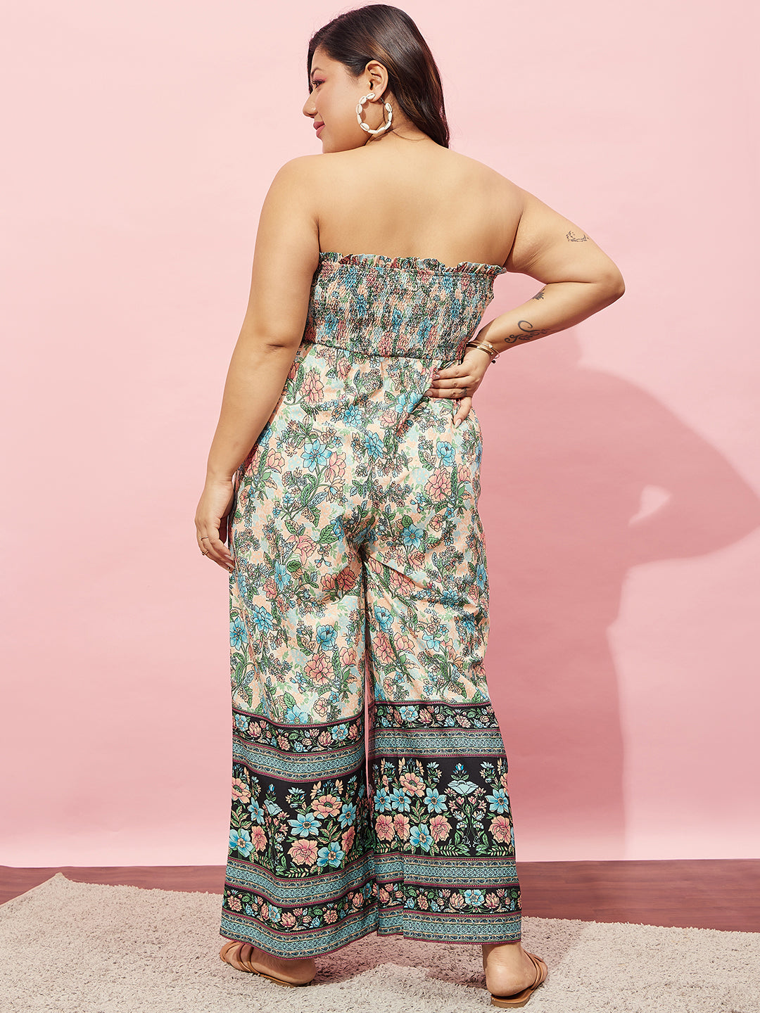 Berrylush Women Plus Size White & Green Floral Printed Strapless Neck Sleeveless Wide-Leg Smocked Maxi Jumpsuit