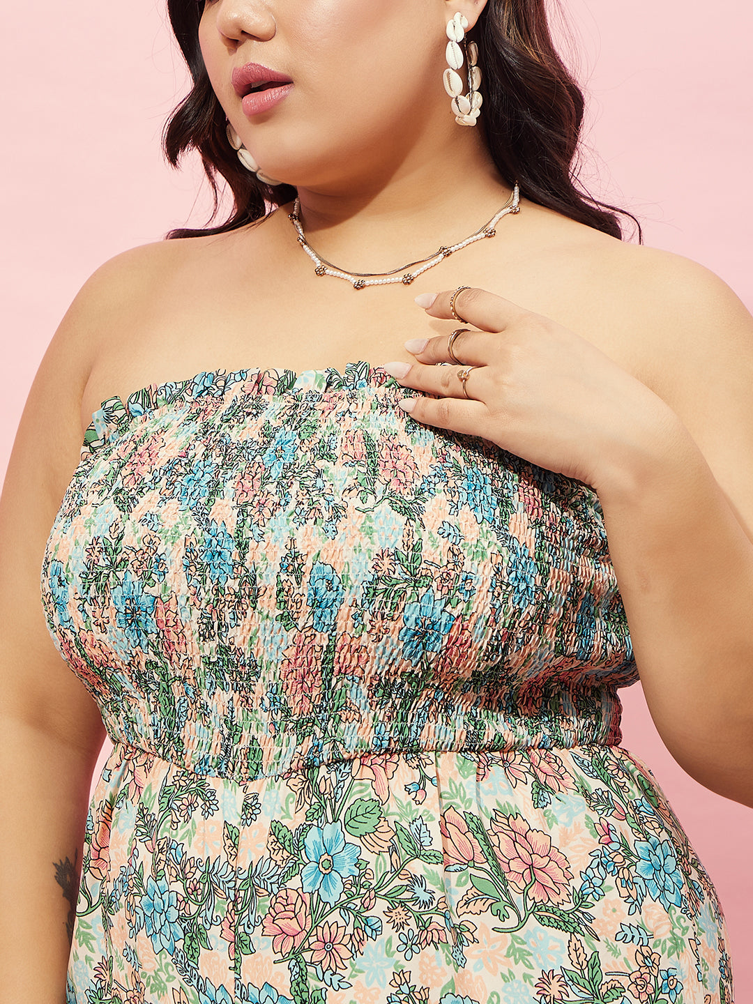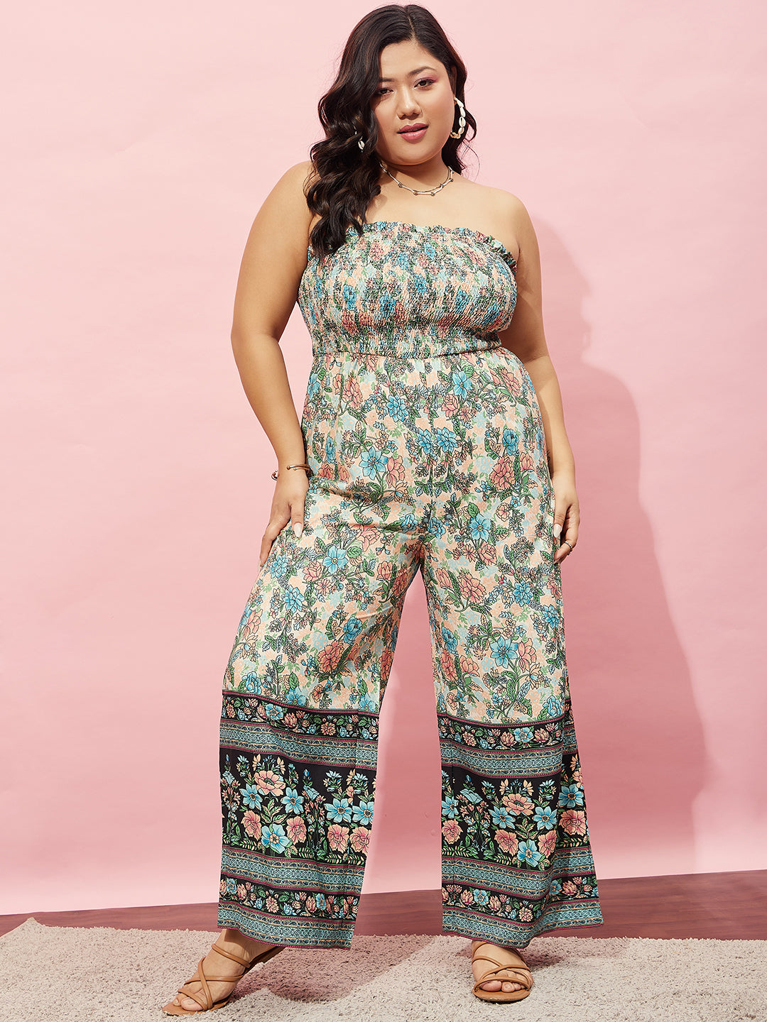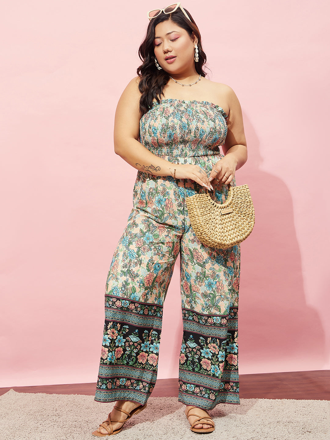 Berrylush Women Plus Size White & Green Floral Printed Strapless Neck Sleeveless Wide-Leg Smocked Maxi Jumpsuit