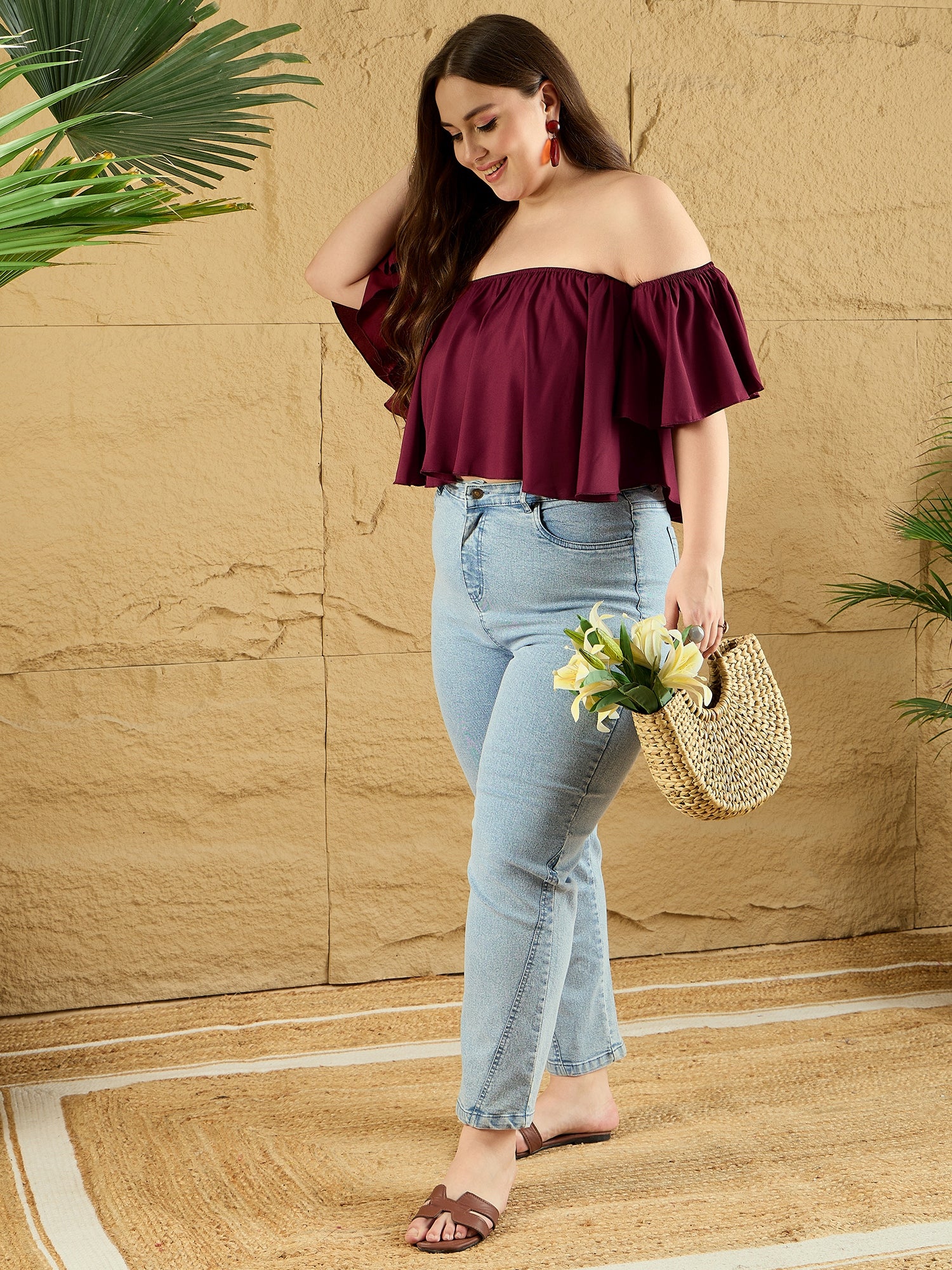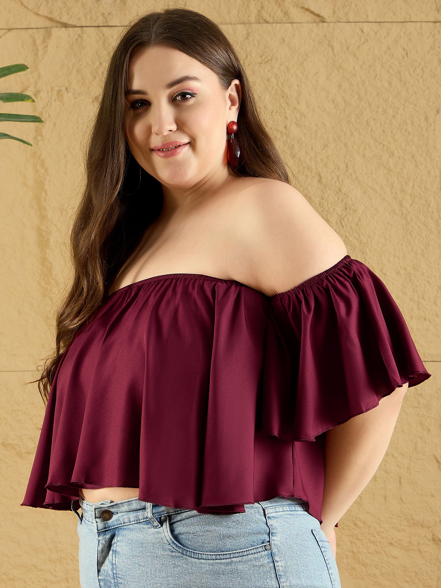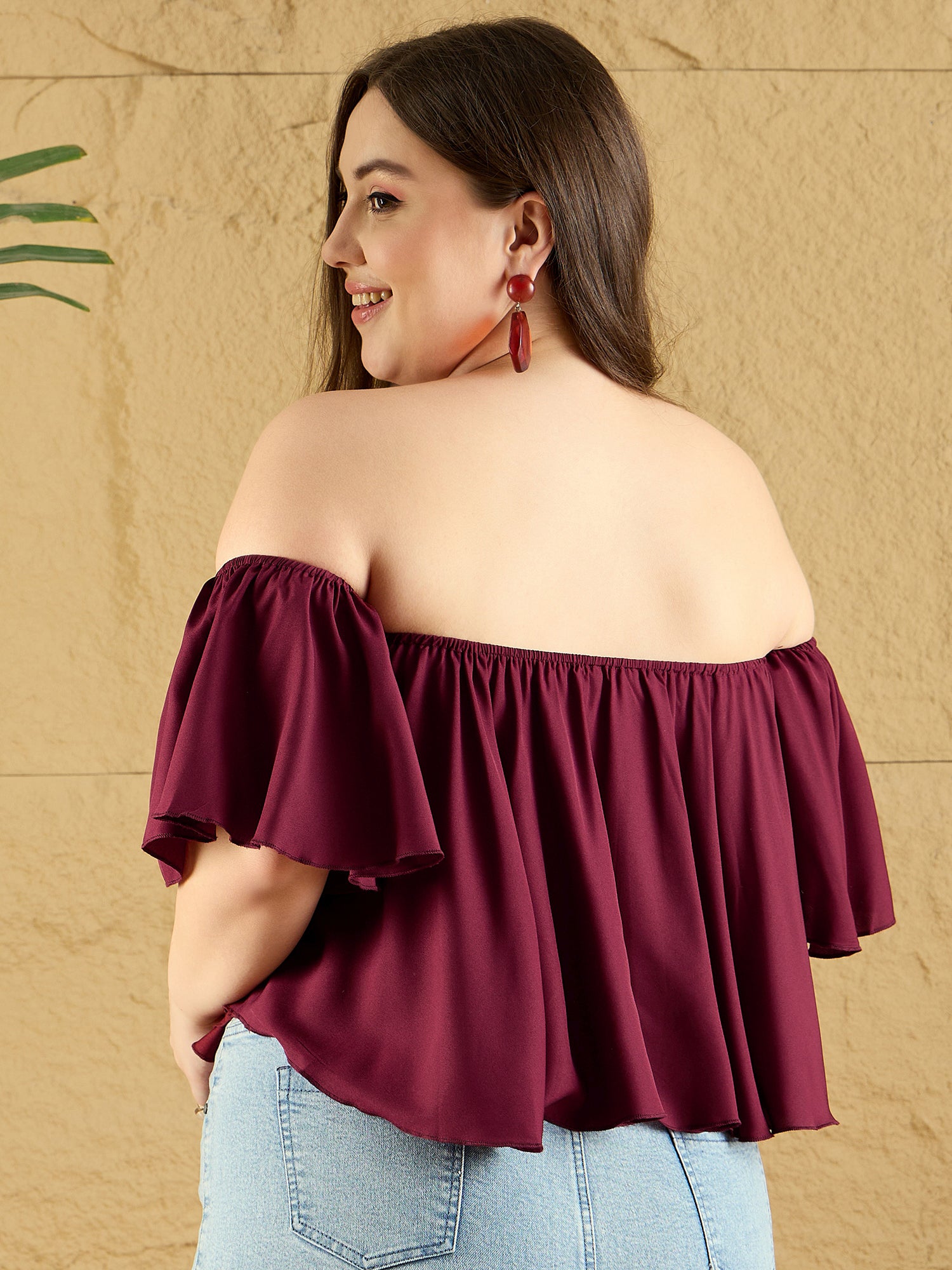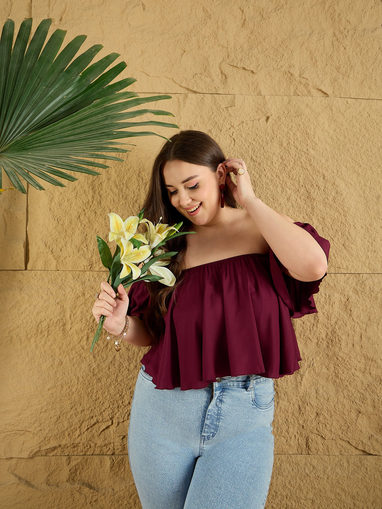 Berrylush Curve Women Solid Maroon Off-Shoulder Neck Flutter Sleeves Ruffled Crop Bardot Top