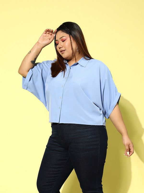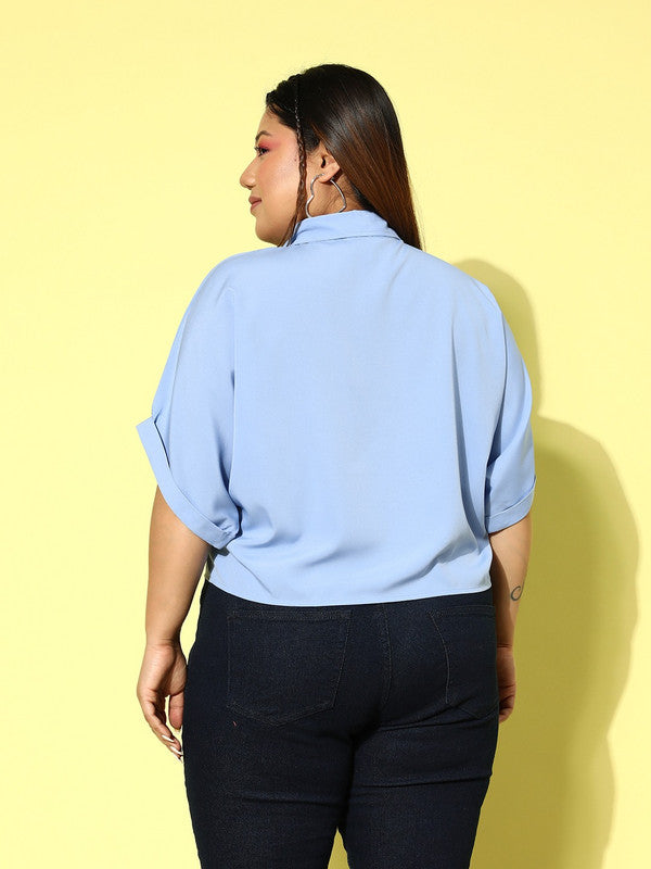 Berrylush Women Plus Size Solid Blue Spread Collar Neck Batwing Sleeve Polyester Curved Hem Regular Shirt