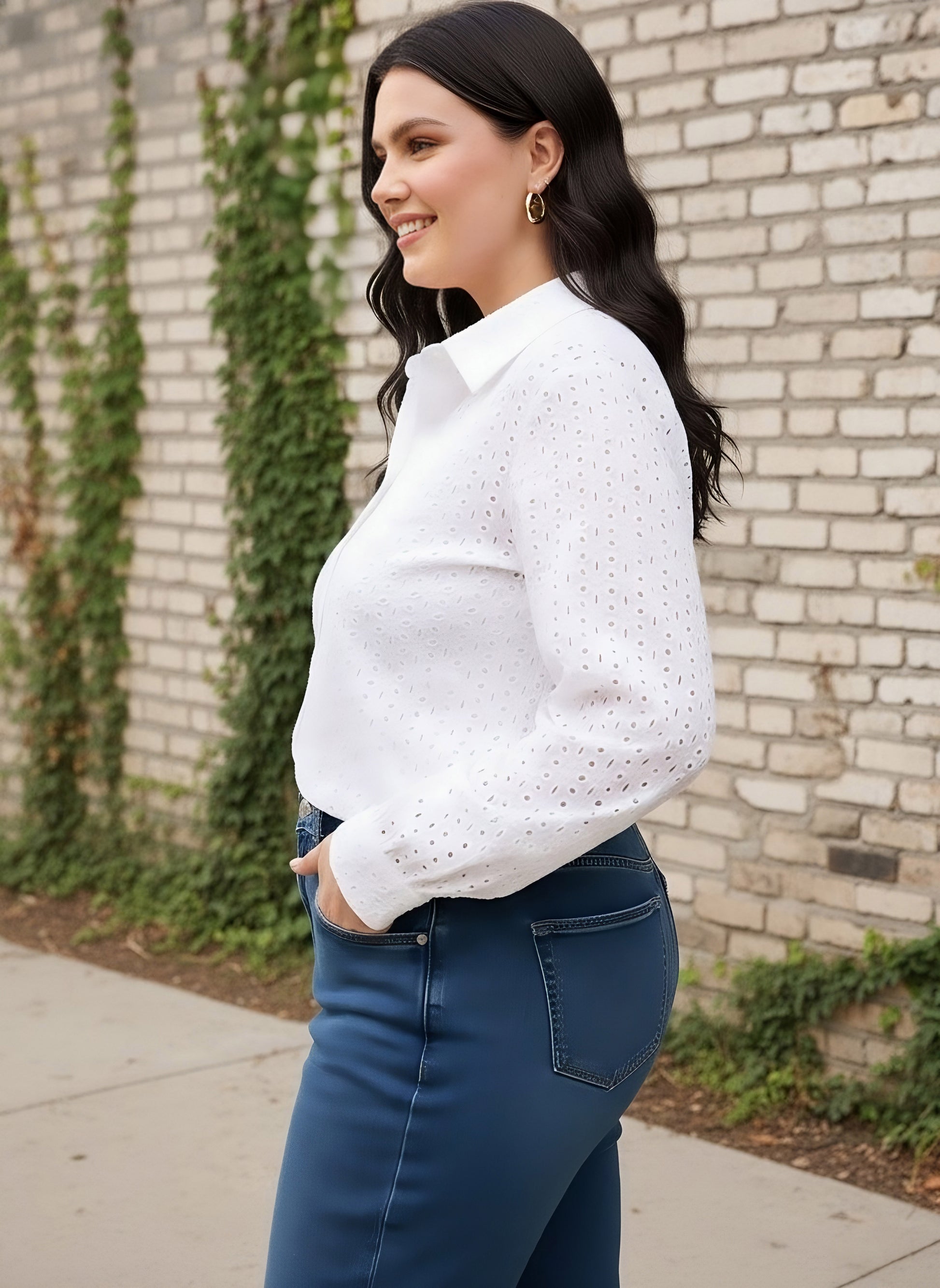 Berrylush Curve Women Solid White Spread Collar Neck Long Sleeves Schiffli Front Button-Up Straight Hem Regular Shirt