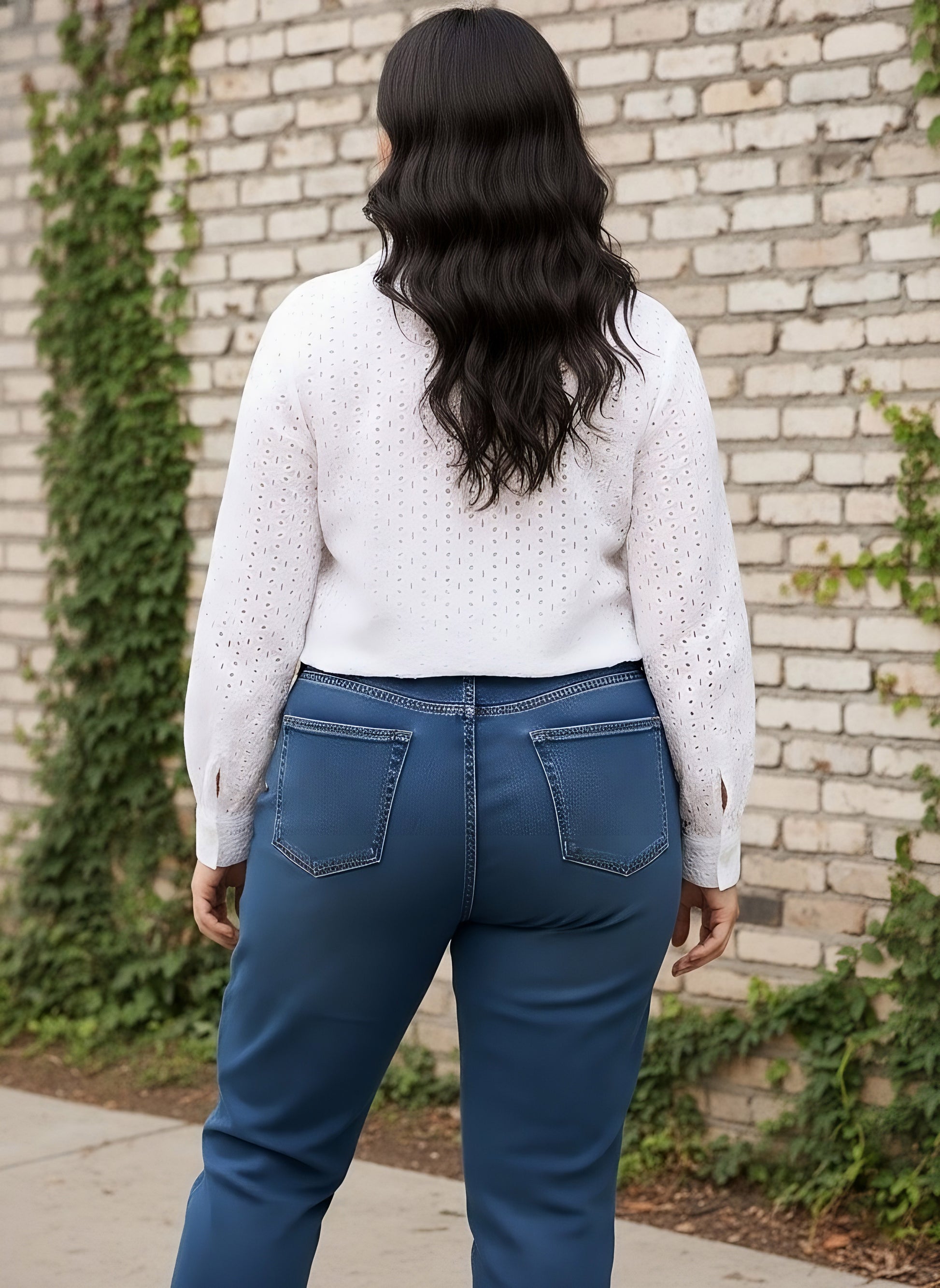 Make a bold statement with the Berrylush Curve Solid White Spread Collar Neck Long Sleeves Schiffli Front Button-Up Shirt. Crafted from luxurious cotton, this shirt combines style and comfort seamlessly, allowing you to transition effortlessly from day to night. The intricately designed schiffli detailing adds a touch of sophistication while maintaining a laid-back vibe perfect for casual outings. The classic spread collar enhances your neckline, offering versatility for various accessories or layering options. With long sleeves and a regular fit that embraces your curves comfortably, this shirt caters to every body type without compromising on flair. Its opaque fabric ensures modesty while providing breathable wear throughout the day. Whether paired with jeans or tucked into tailored trousers, its straight hemline guarantees an impeccably polished look every time.
