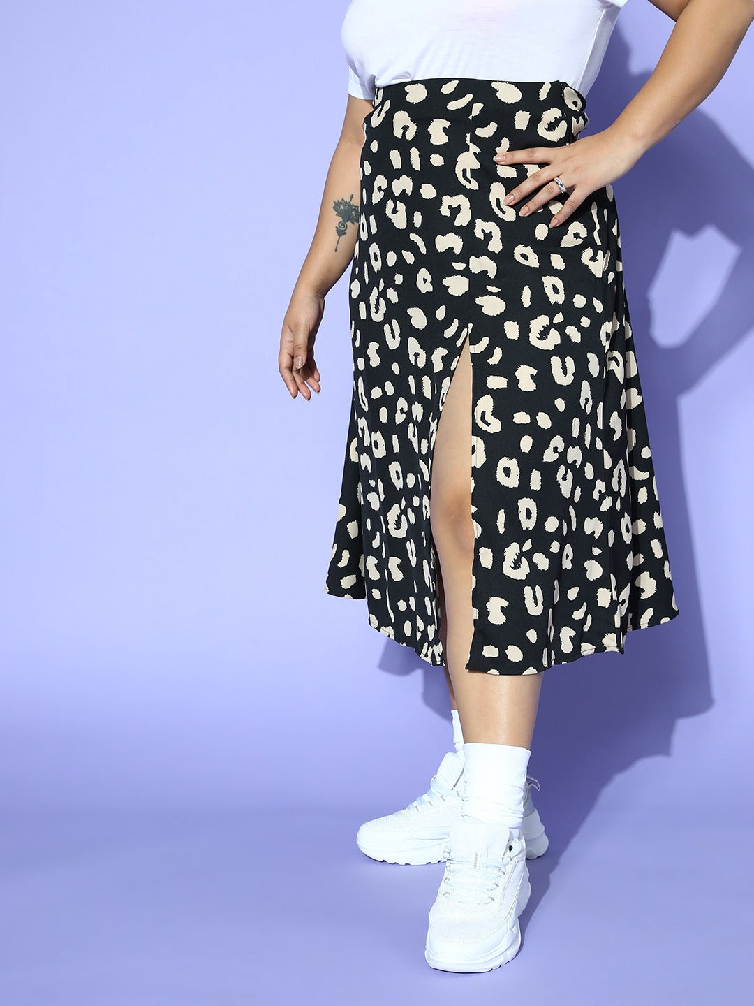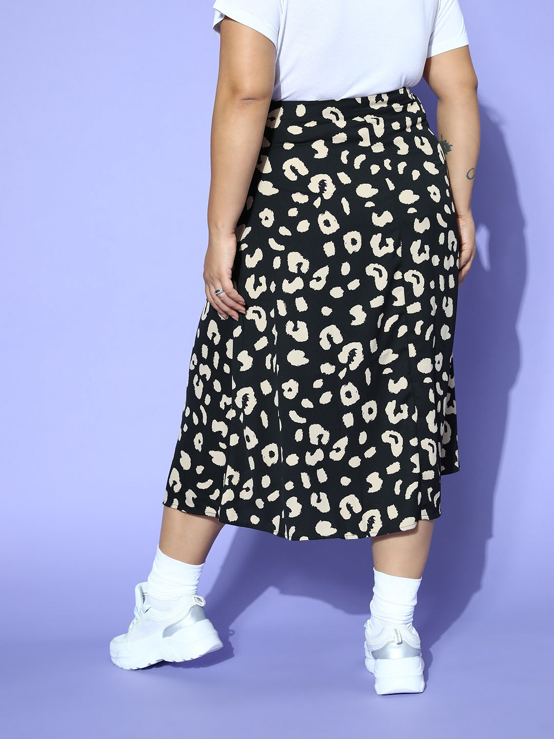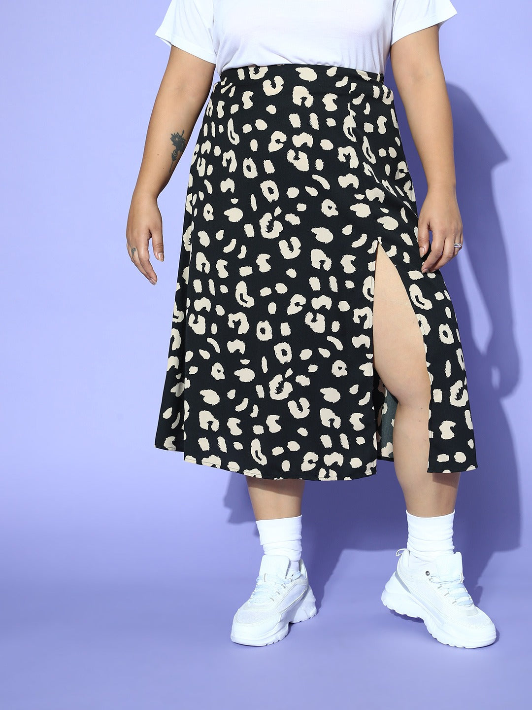 Berrylush Women Plus Size Black & White Animal Printed Thigh-High Slit Flared A-Line Midi Skirt