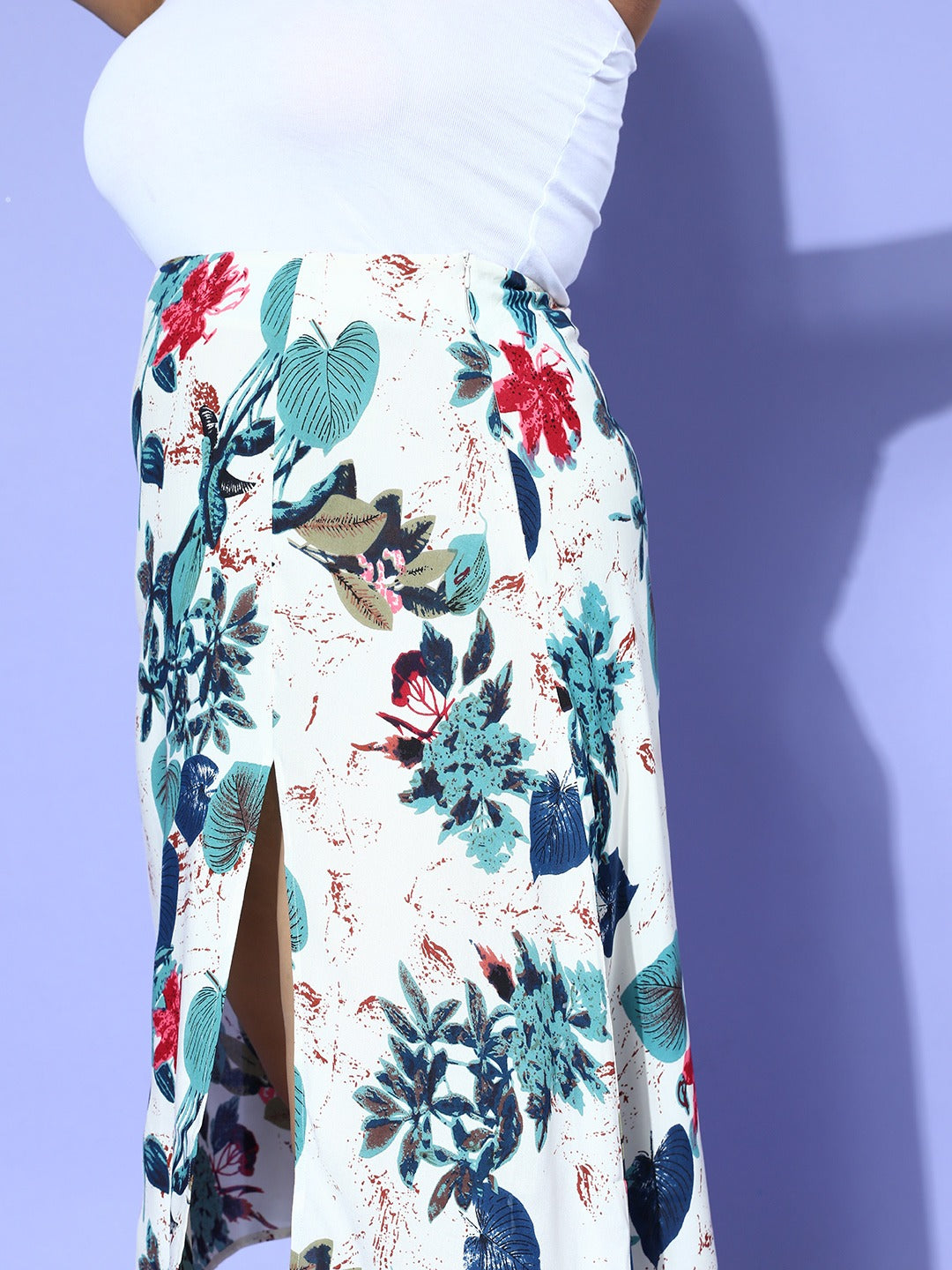 Berrylush Women Plus Size White & Green Tropical Printed Thigh-High Slit Flared A-Line Midi Skirt