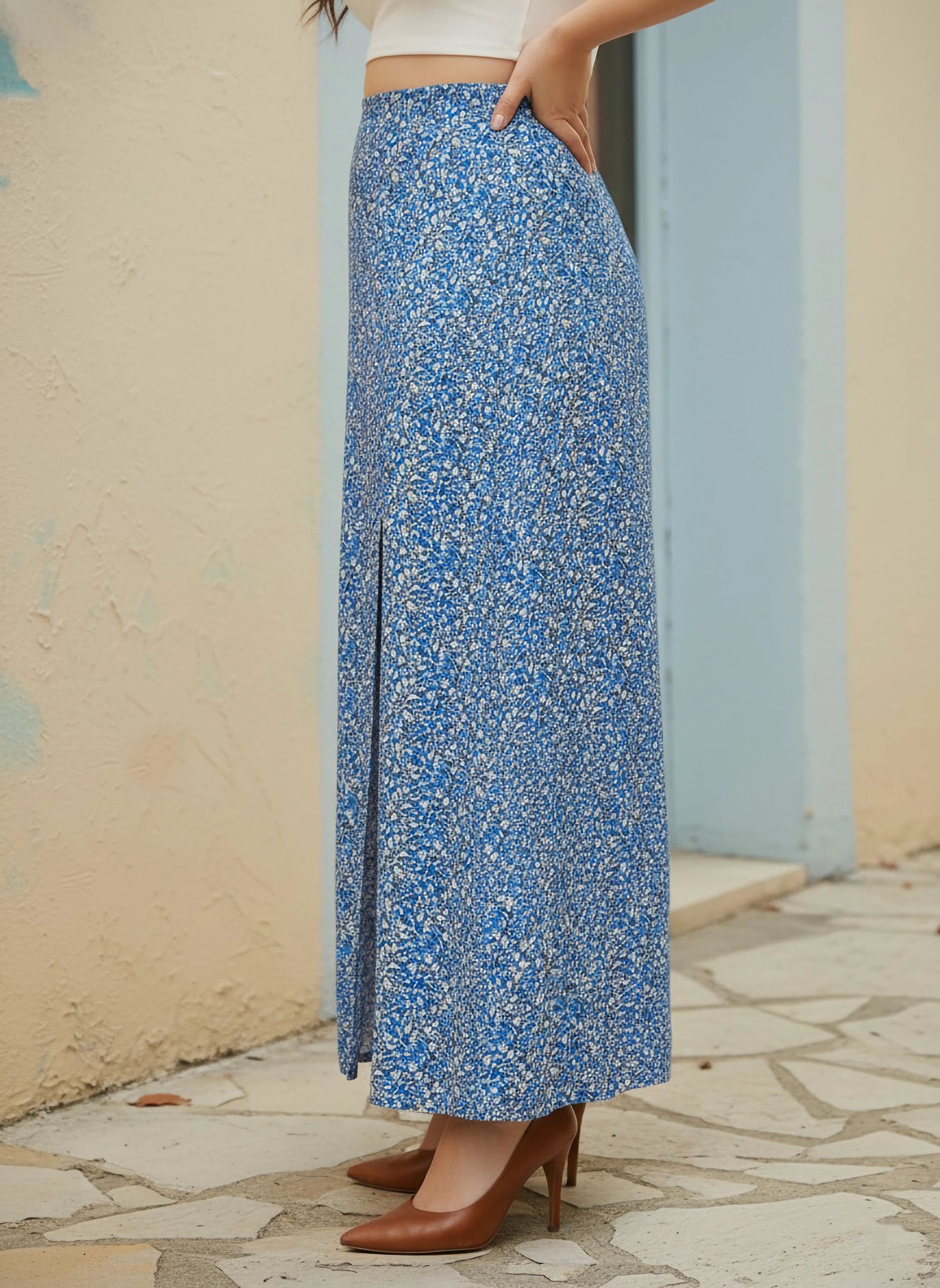 - The blue and white floral print gives this skirt a refreshing and chic look
