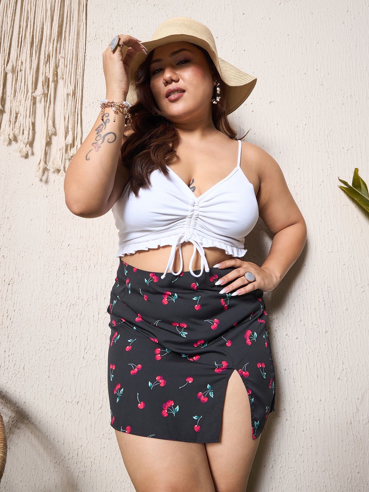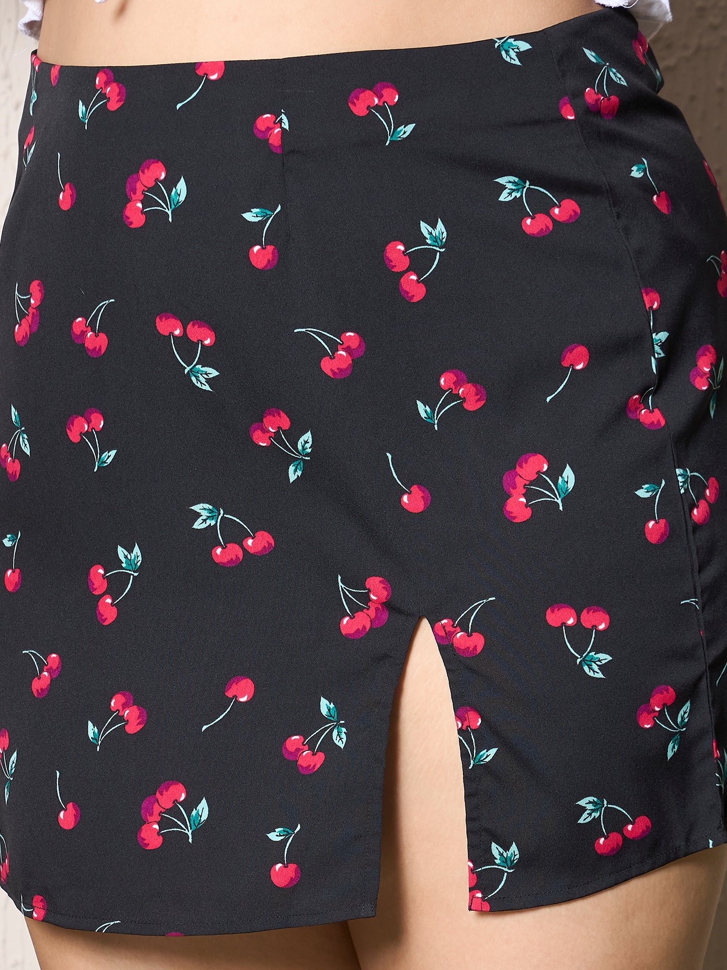 Berrylush Curve Women Black & Red Cherry Printed High-Rise Waist Front-Slit Straight Hem Mini Skirt