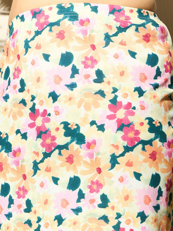 Berrylush Curve Women White & Multicolour Floral Printed High-Rise Waist Slip-On Straight Hem Knitted Pencil Midi Skirt