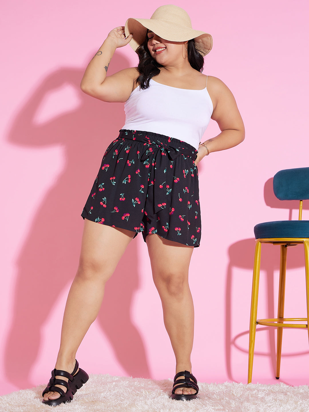 Berrylush Women Plus Size Black & Red Cherry Printed Front Tie-Up High-Rise Paperbag Waist Crepe Pleated Mini Shorts